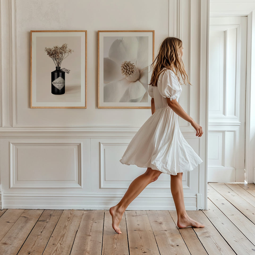 These posters offer a harmonious blend of botanical motifs and elegant minimalism. The soothing colors and soft shapes emphasize a sense of timelessness and peace. The subtle contrast between the delicate details of the flowers and the simple, clean lines of the Hendricks bottle creates a sophisticated balance that will lift your room with a sense of calm and beauty.
