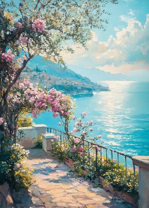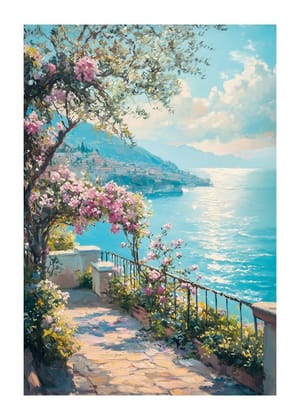This wall mural brings a sense of calm and holiday spirit with its sunlit motifs of the Mediterranean coast and charming alleys. The paintings' soft colors and detailed depictions create a harmonious flow that brings to mind relaxing walks under a clear blue sky. This curated collection elevates the room with a dreamy, yet real, atmosphere.