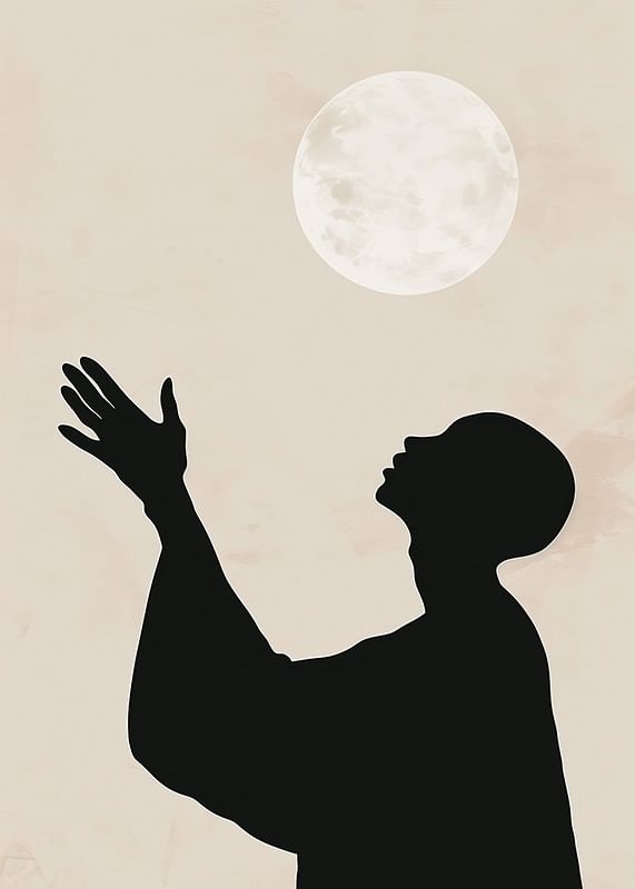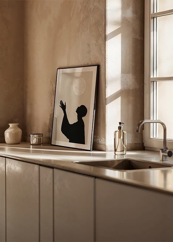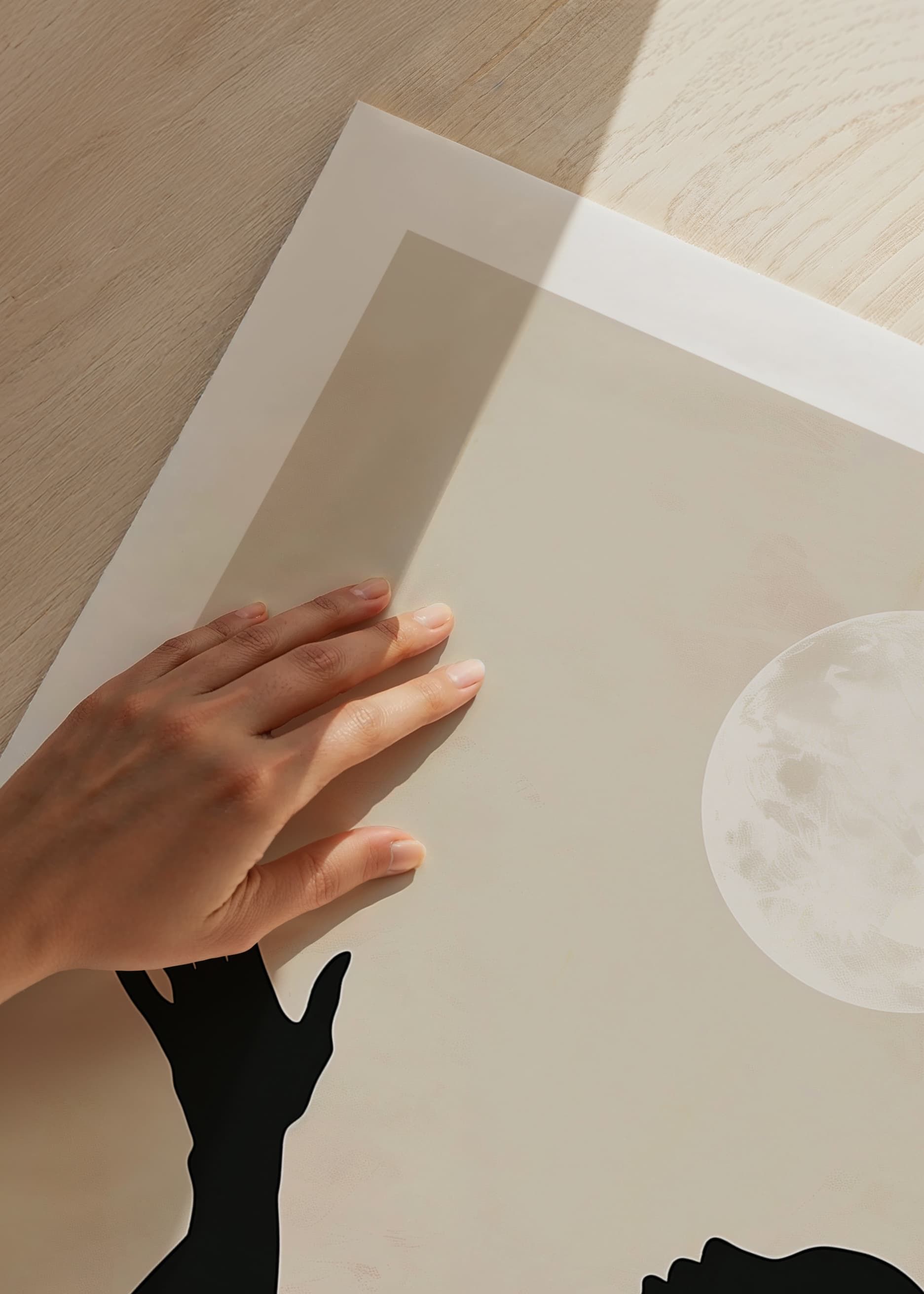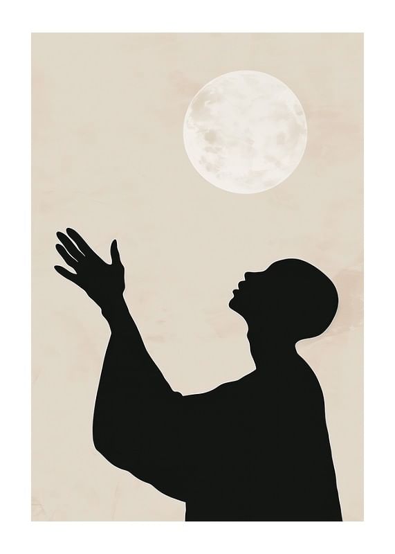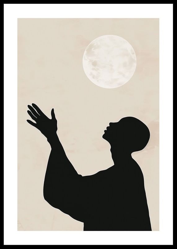 This poster captures the essence of the mystery of the night with a powerful silhouette stretching towards a brilliant full moon. The contrasting image creates a sense of dreamlike calm and timelessness. The silent dialogue between the moon and the silhouette awakens reflection and inspiration.