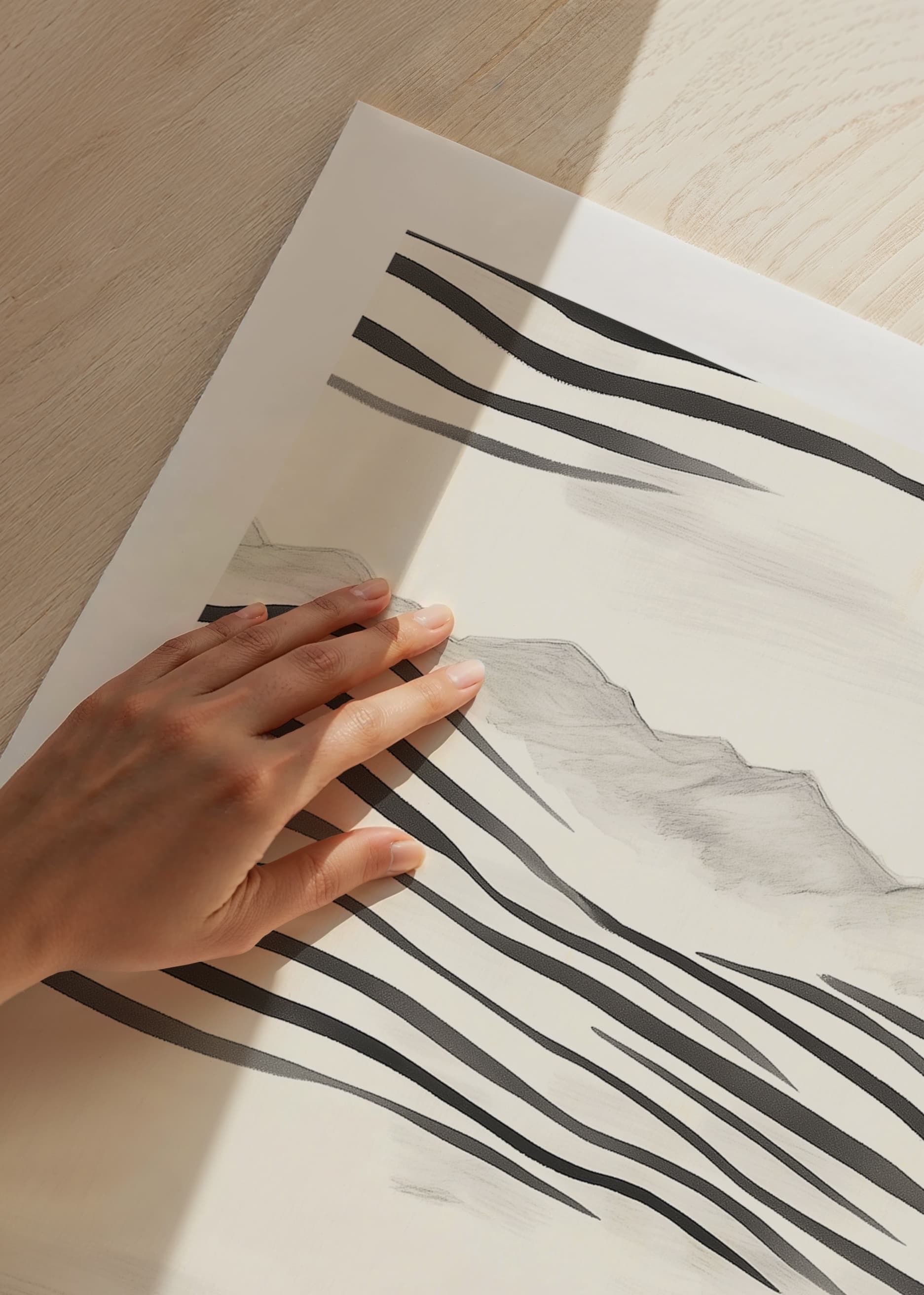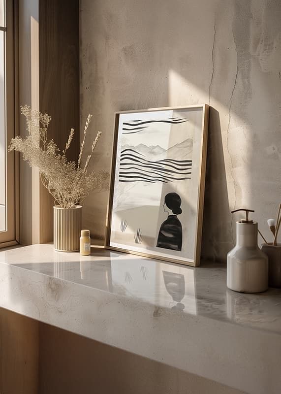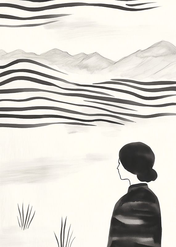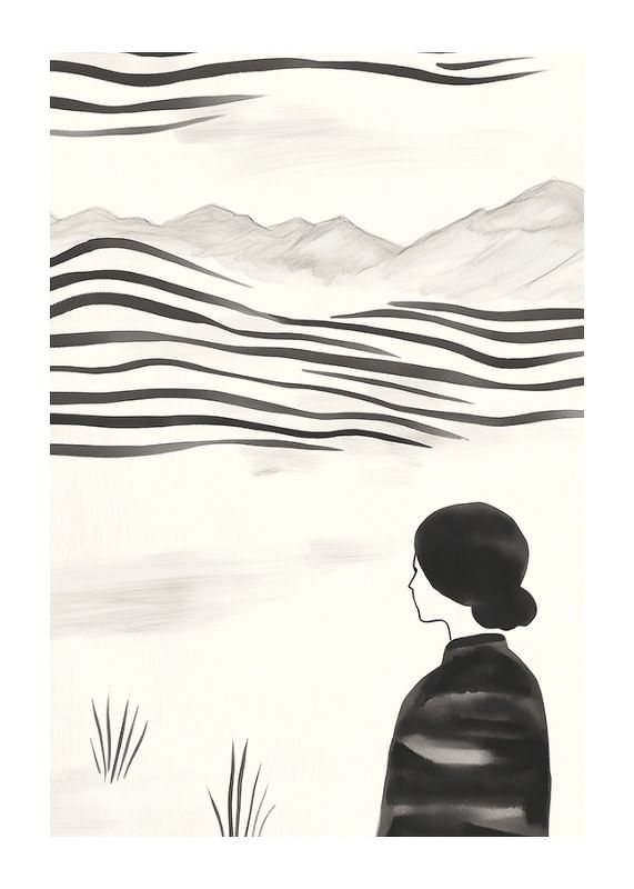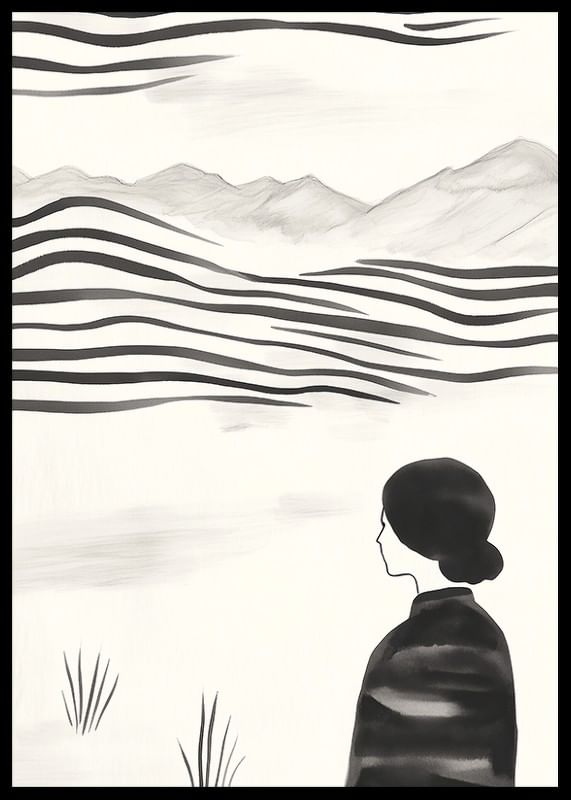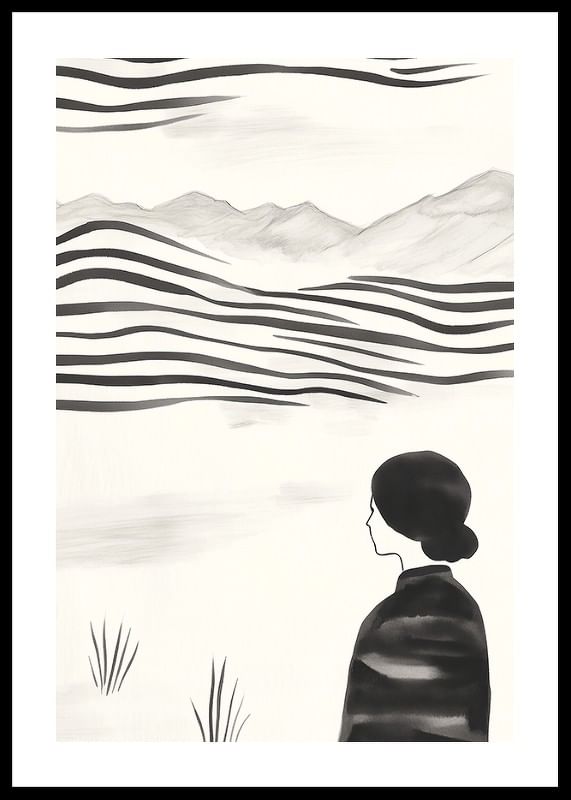 This poster captures a moment of stillness, with a woman standing facing a rolling, abstract landscape in black and white. The soft lines and muted tones create a sense of timelessness and tranquility. With its minimalist style, it evokes thoughts about the beauty and eternity of nature.