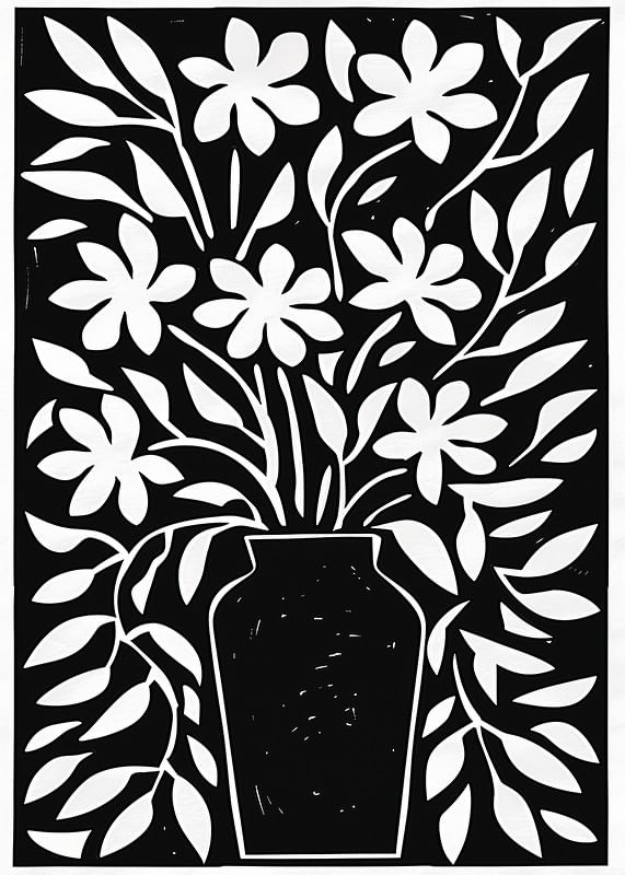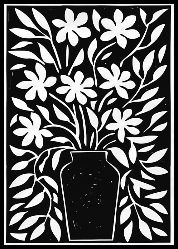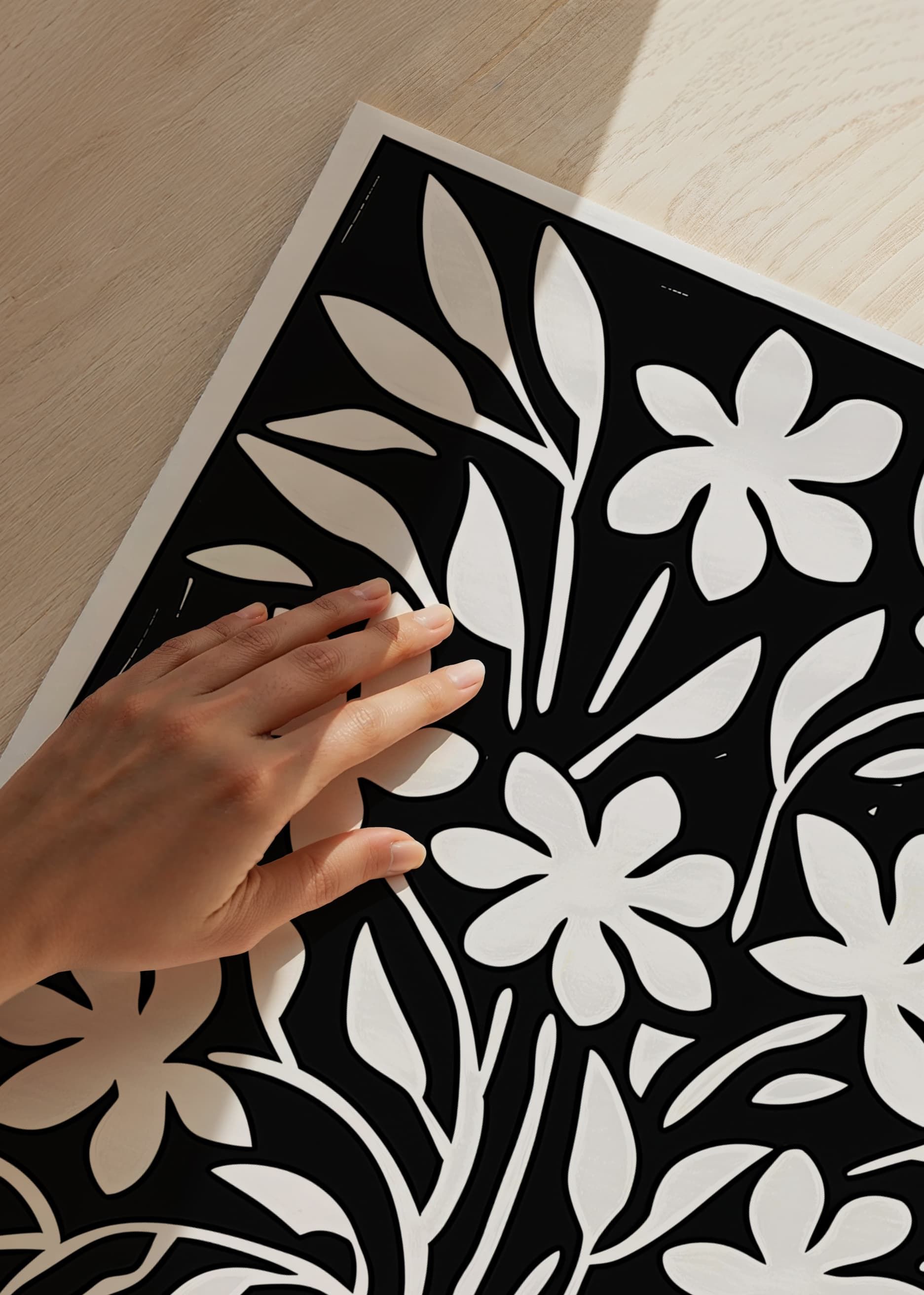 This poster immediately catches the eye with its stylish floral patterns against a black background. The leaves and flowers contrast beautifully and give a sense of timeless elegance. Perfect for creating a sophisticated and peaceful atmosphere in your living room or office.