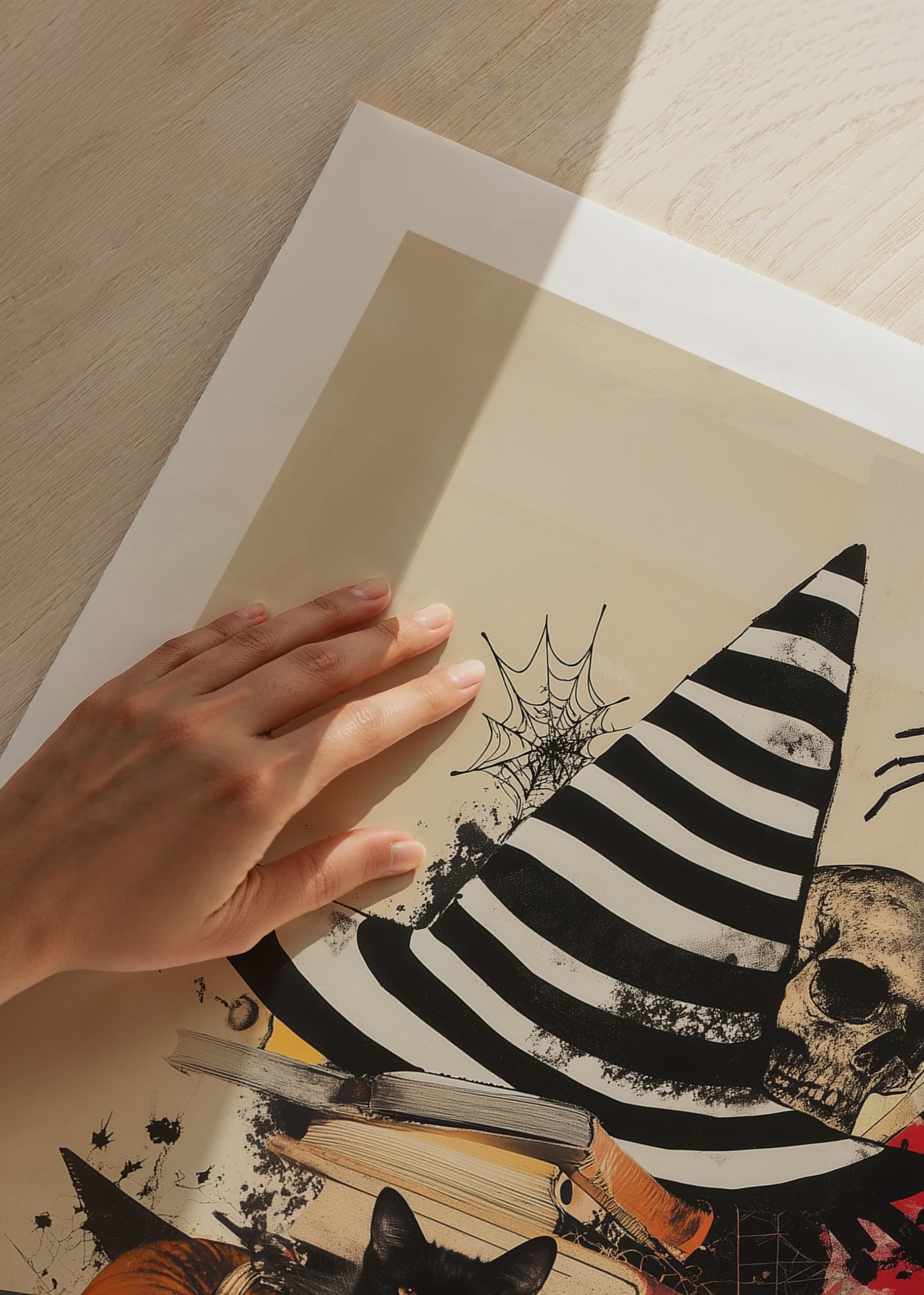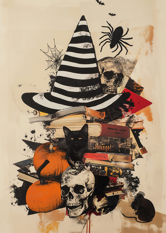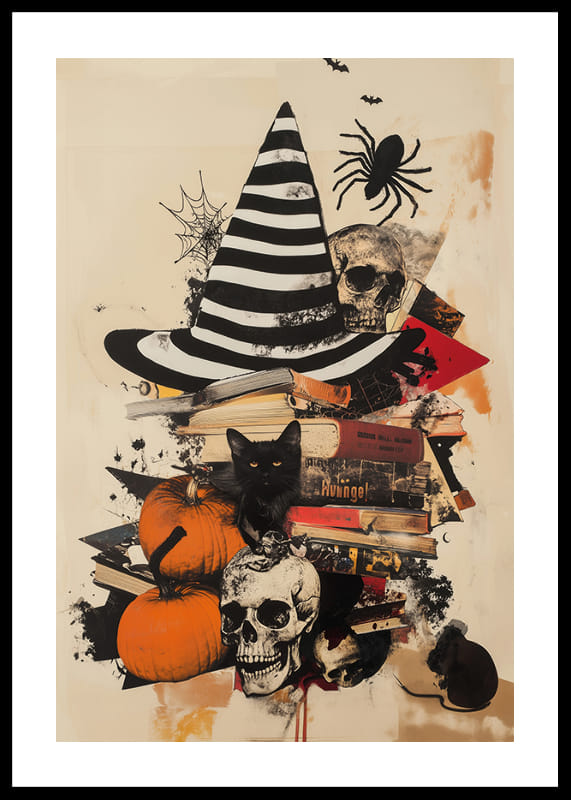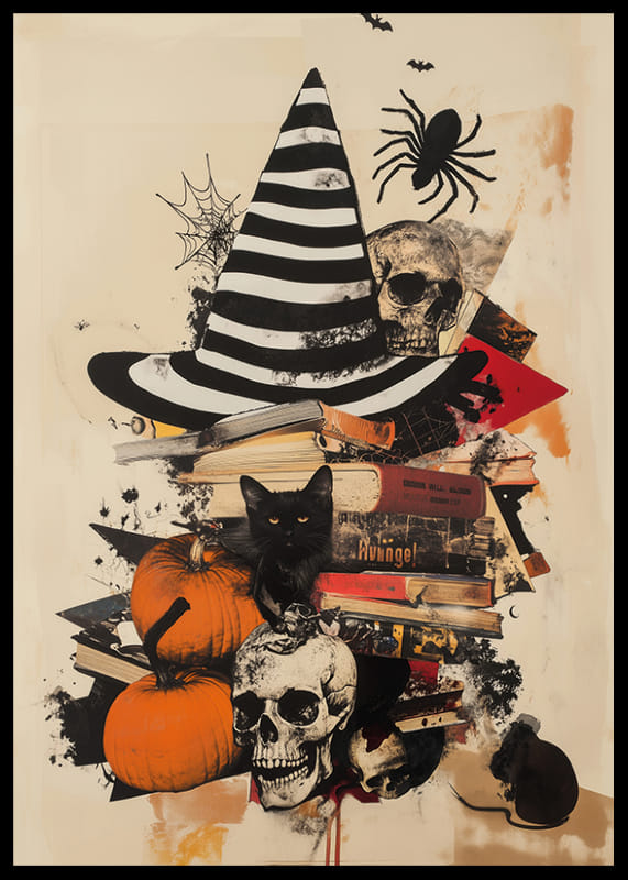 This poster captures an evocative atmosphere with pumpkins, a black cat and a striped witch's hat, which together create a sense of both danger and enchantment. The skulls and spider webs enhance the gothic feel, while the old books add an intellectual mystique.