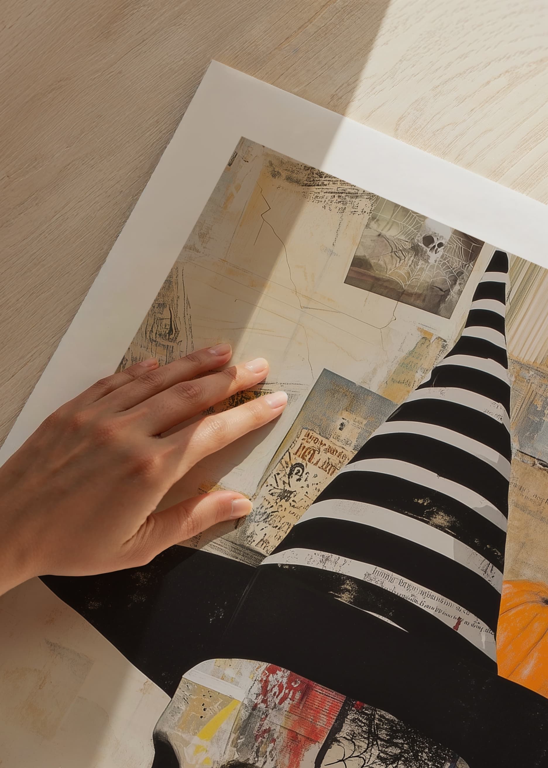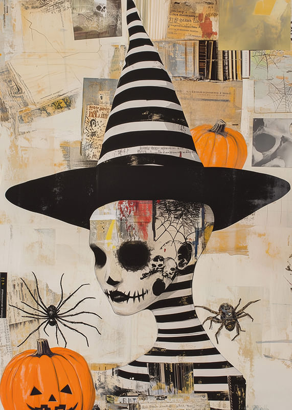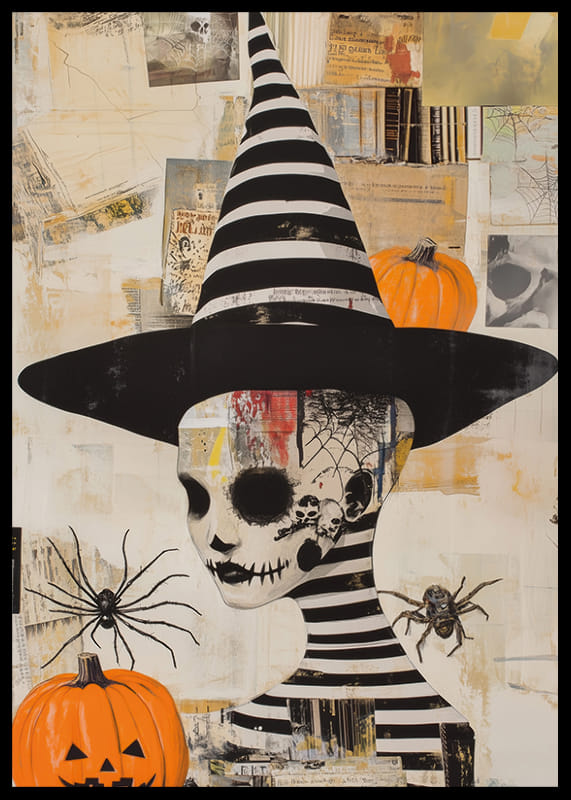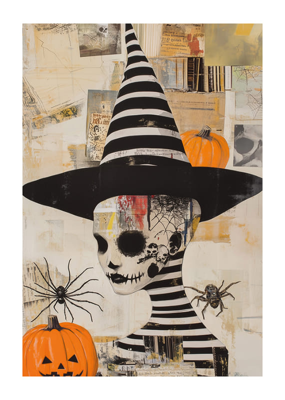 This mesmerizing poster captures the essence of Halloween with a stylized witch's hat and a sculpted face in evocative black and white stripes. Two glowing pumpkins and spiders create a playful yet mysterious feel.
