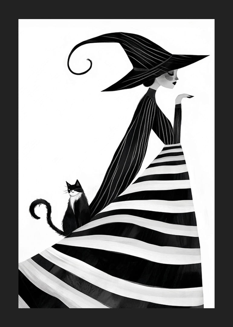 This poster captures an enchanting scene with a black and white witch in an elegant dress and a mysterious cat. The witch's pointed hat and the cat's watchful gaze create a timeless sense of mystery and charm.