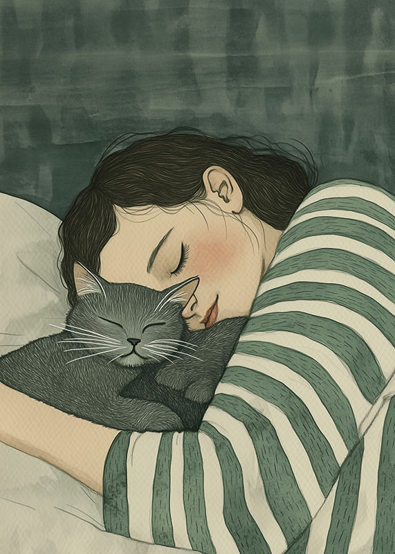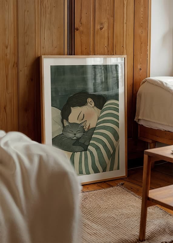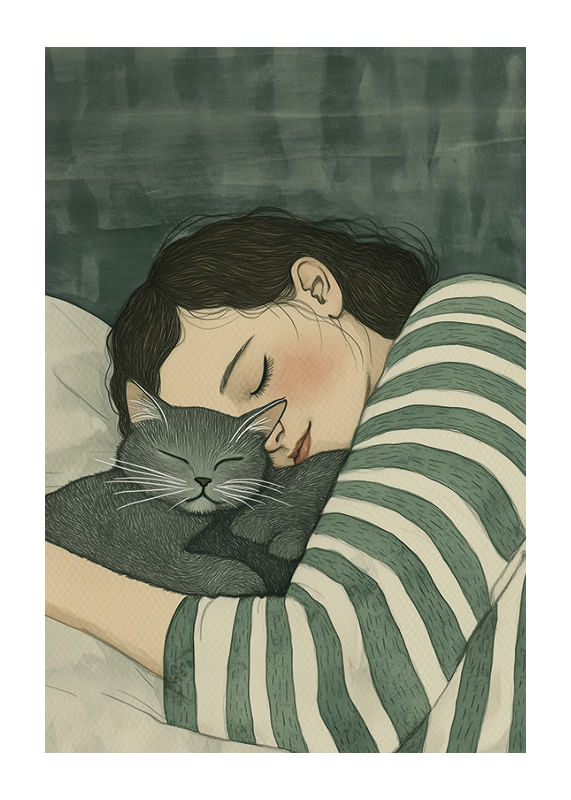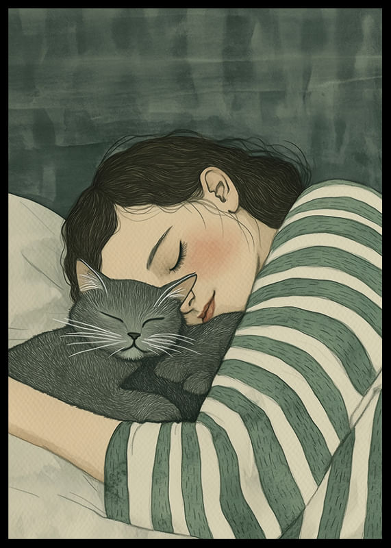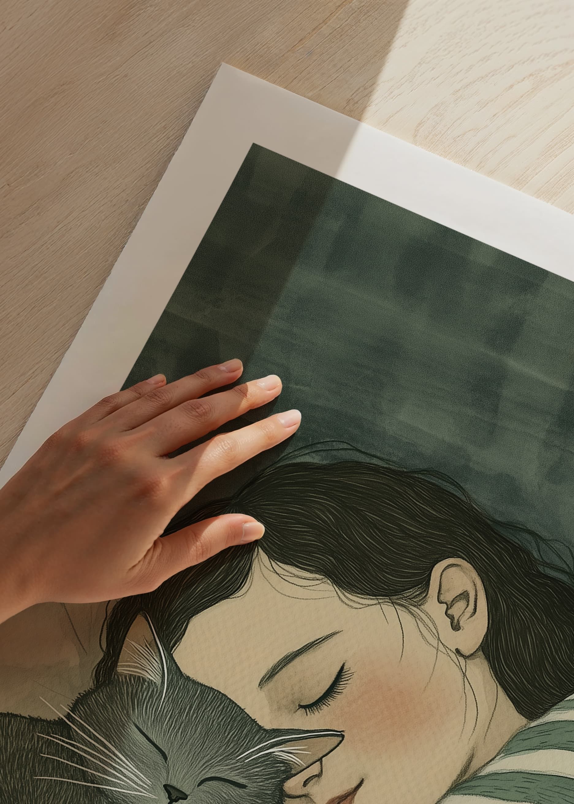 This poster captures a soft and peaceful moment where a woman sleeps close to her beloved cat. The colors in relaxed shades of green and gray create a calm and inviting atmosphere. The warm interaction between human and animal gives a deep sense of security and relaxation.