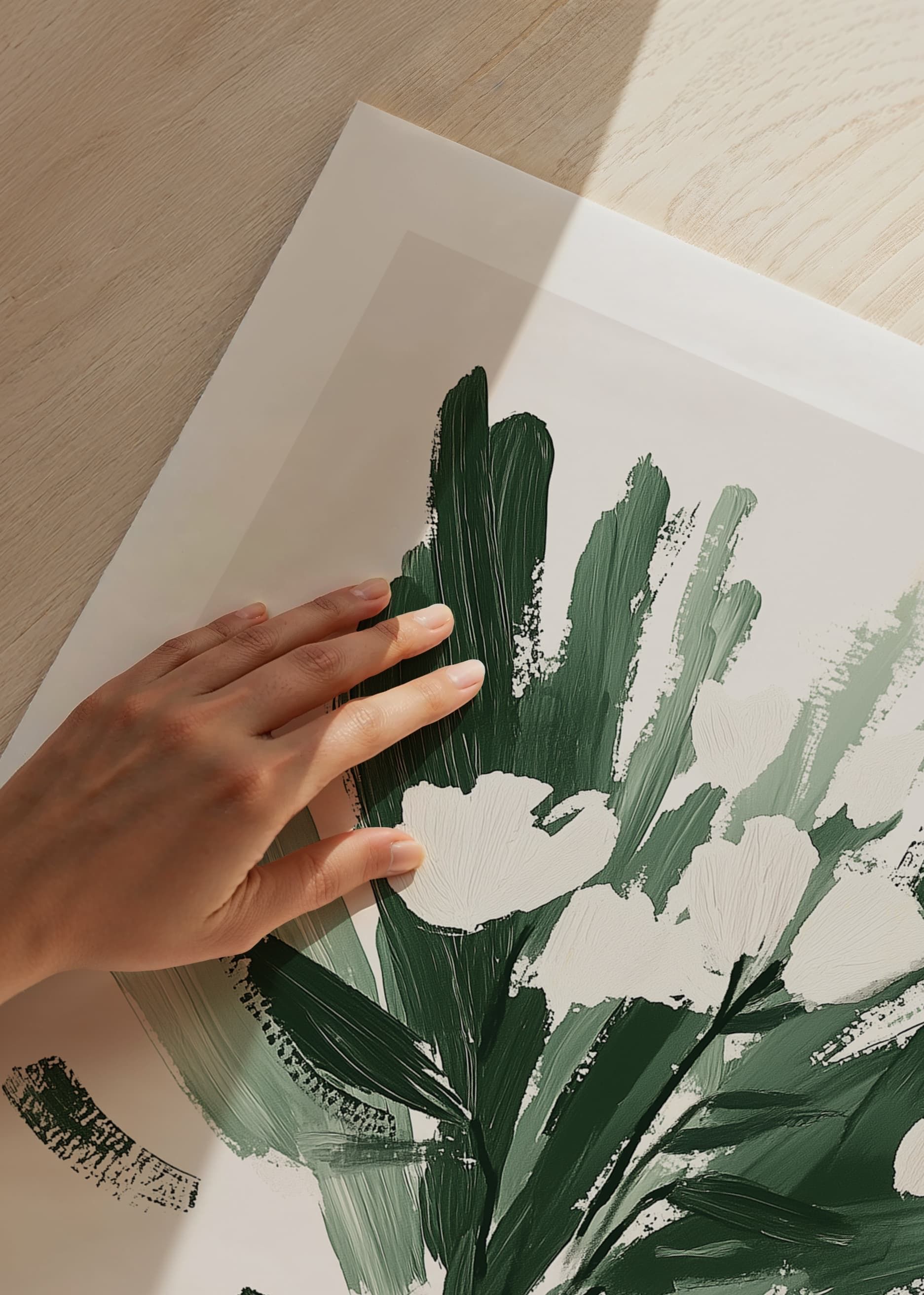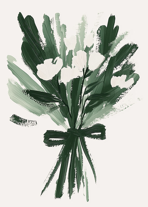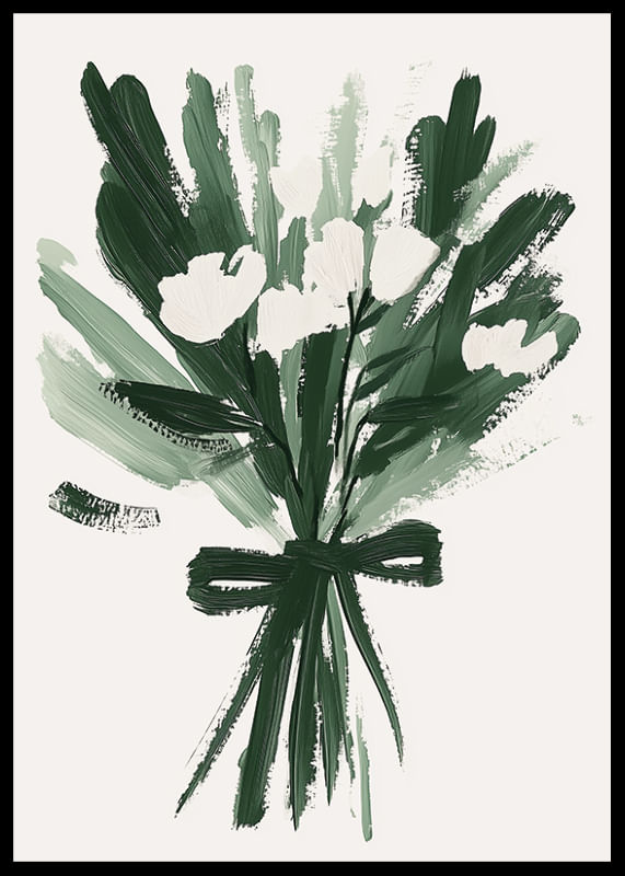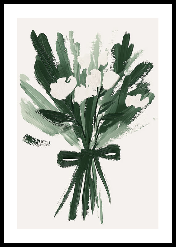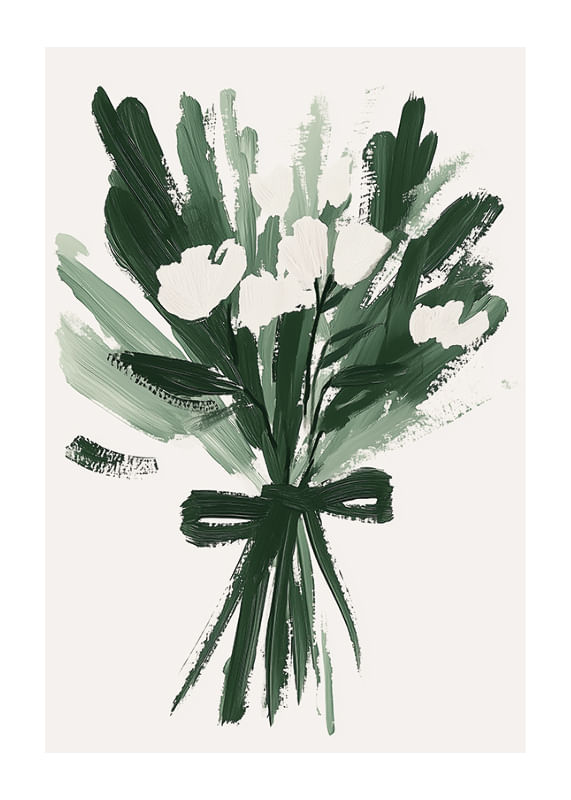 This poster captures attention with its vibrant green and white brushstrokes that form an elegant bouquet of flowers. The graphic and abstract expression combines artistic freedom with the beauty of nature.