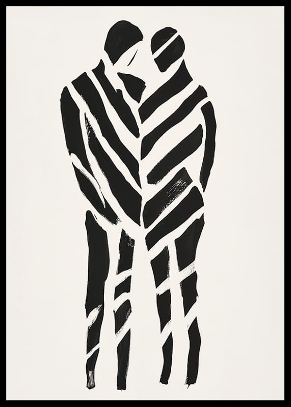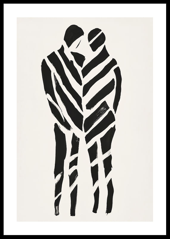 This poster captures an intense sense of closeness and togetherness. With its bold, black lines on a white background, it creates a dynamic contrast that highlights the intimate embrace of the two silhouettes.
