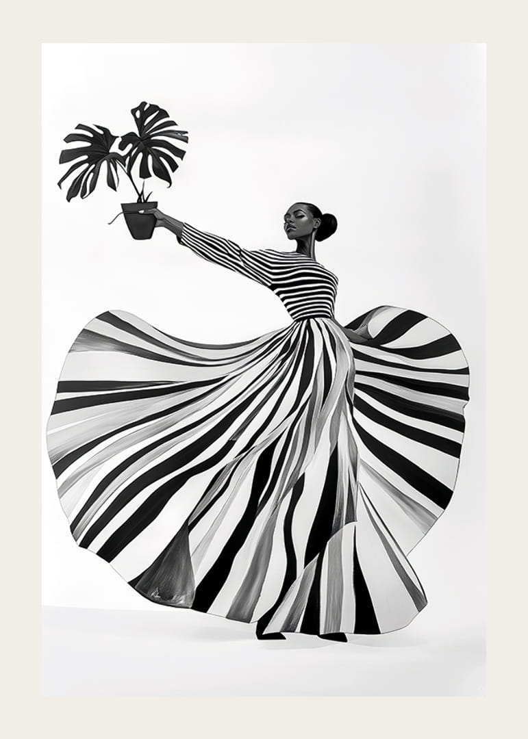 This poster immediately catches the eye with its striking black and white style that creates a visual symphony of lines and shapes. The elegantly posed figure with a leaf in its hand gives a sense of movement and boldness.