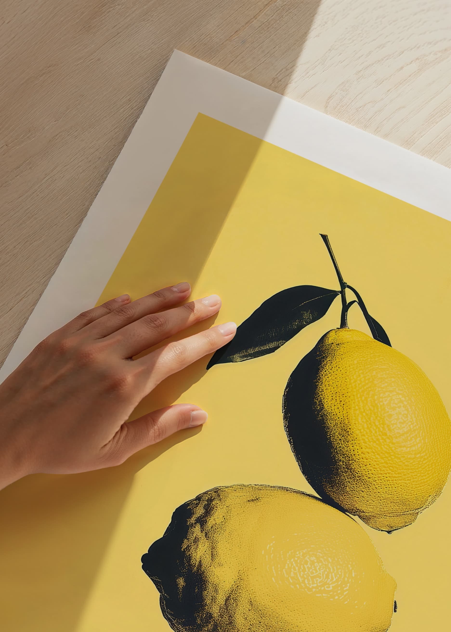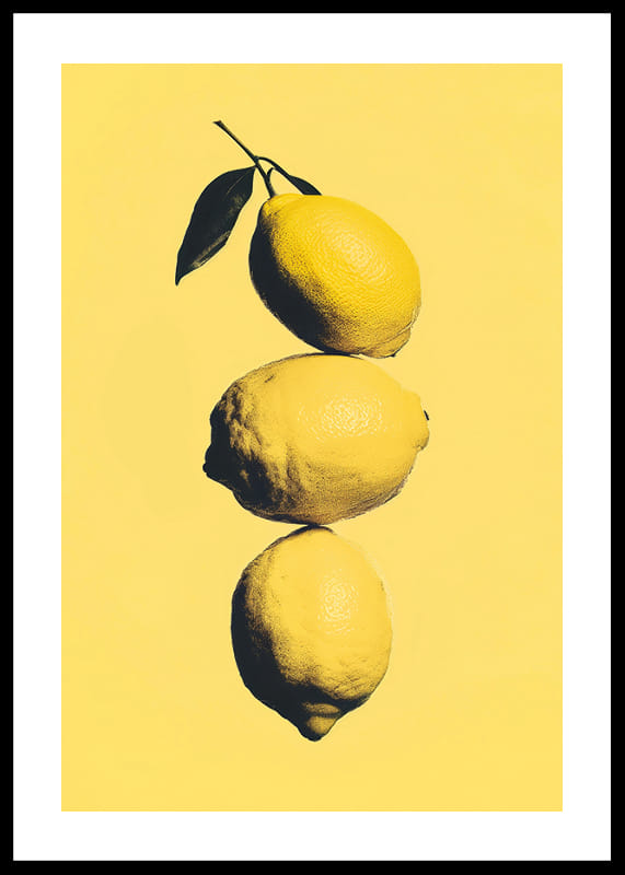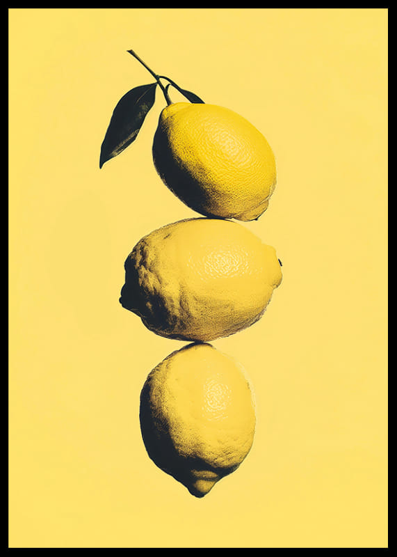 This poster fills the room with life and energy through the three elegant lemons floating against a sunny yellow background. The lemons' rich yellow hues and subtle details create a harmonious and fresh atmosphere that lifts the interior.