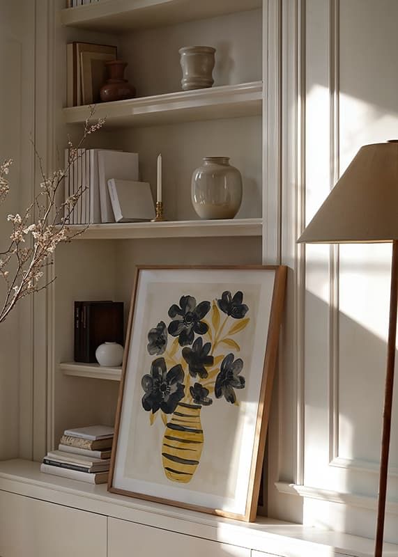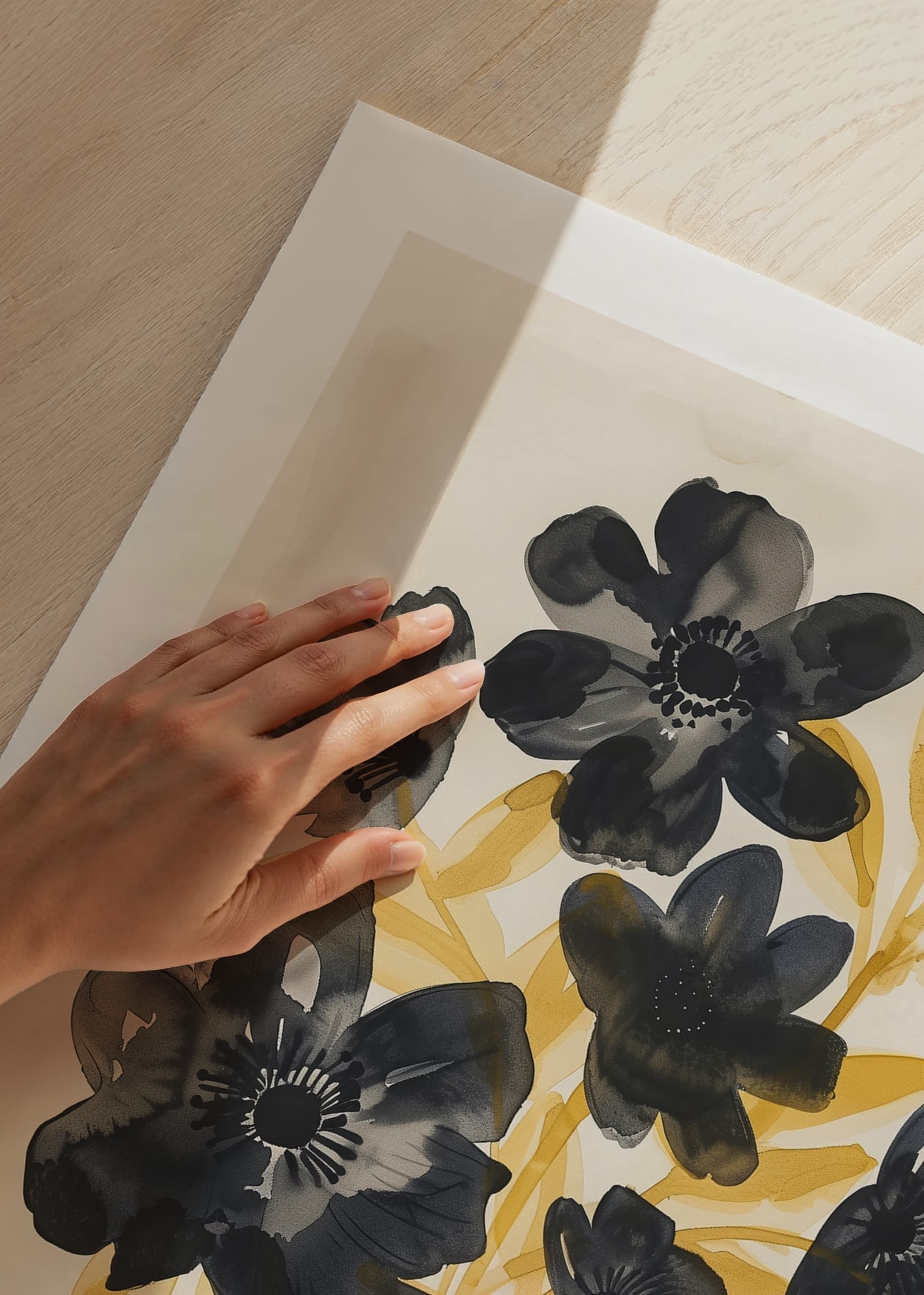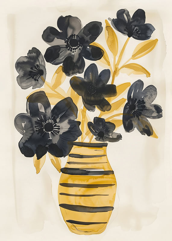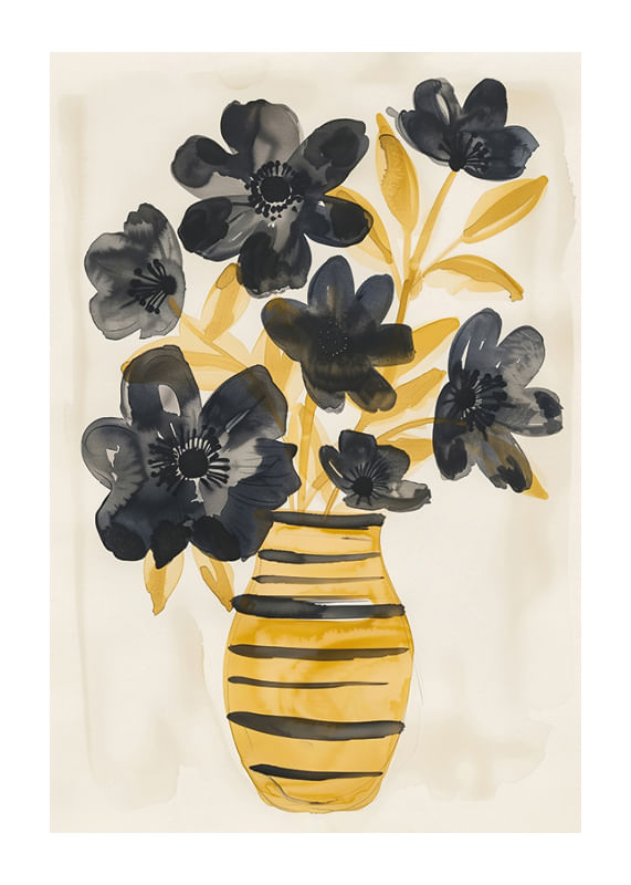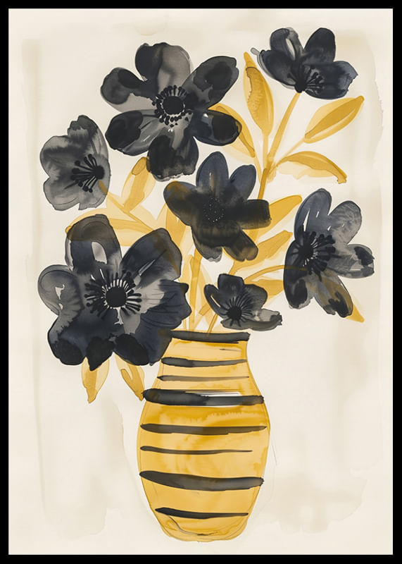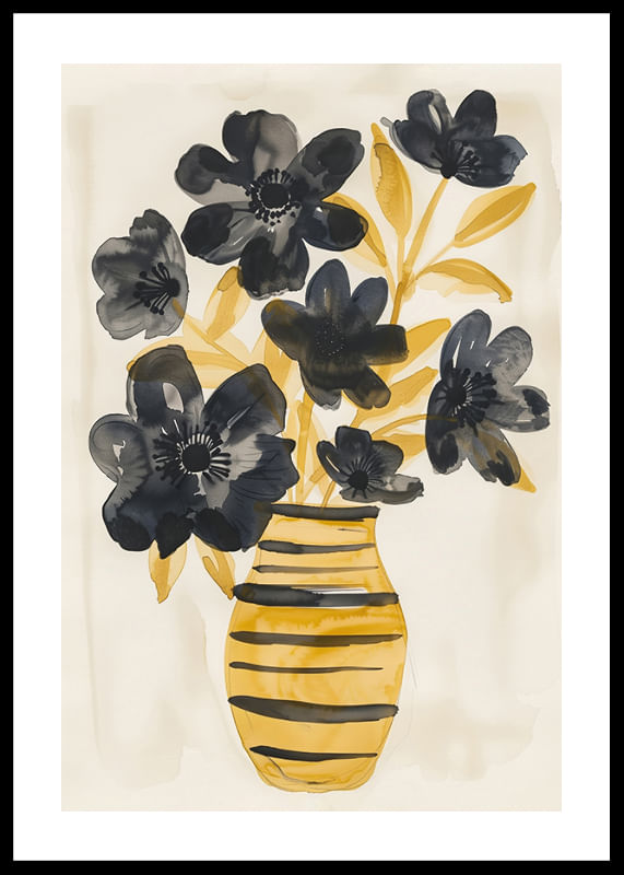 This poster catches the eye with its dark flowers dancing harmoniously in a golden vase. It's a captivating blend of bold contrasts where the deep hues of the flowers meet the warm tone of the vase.