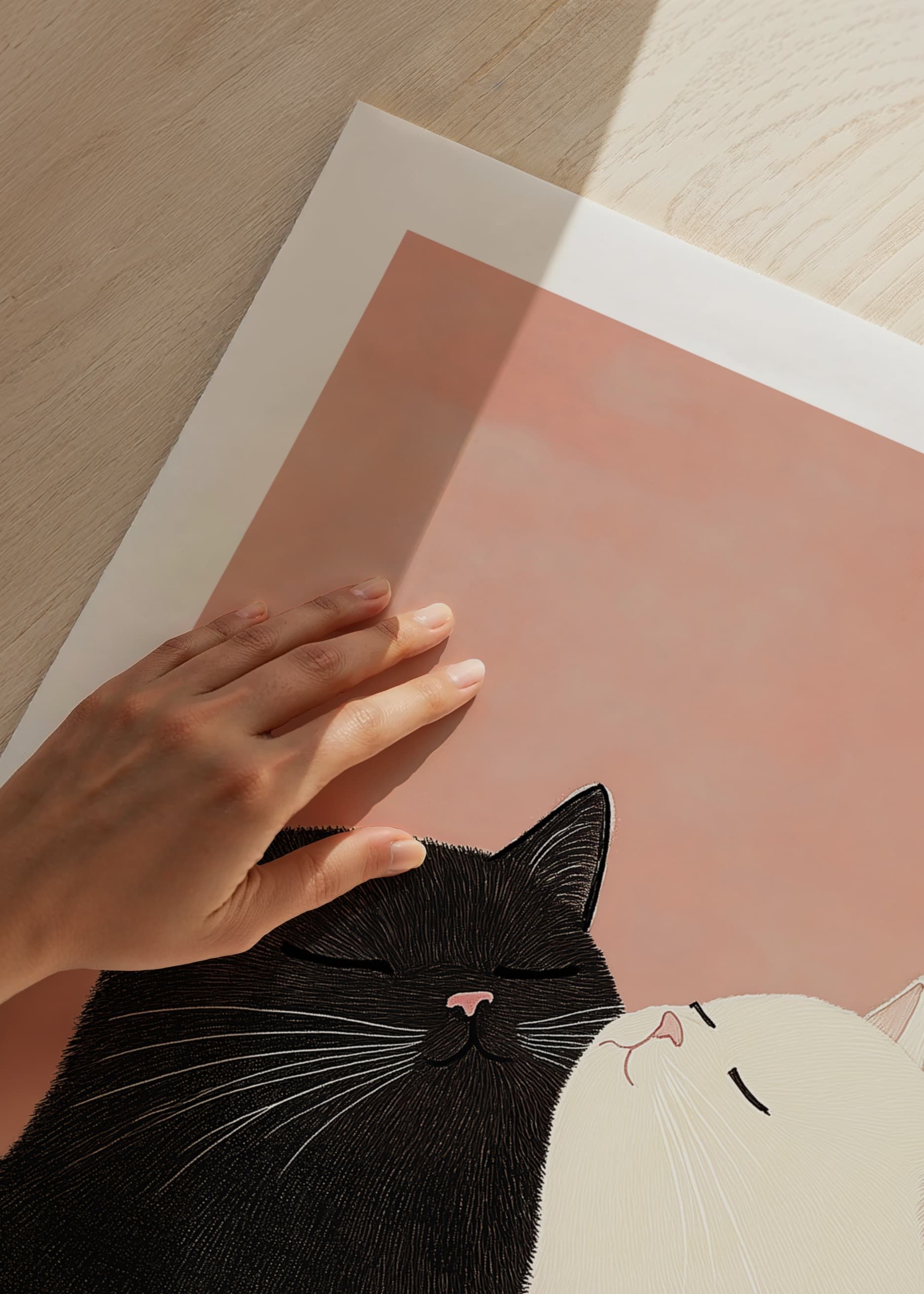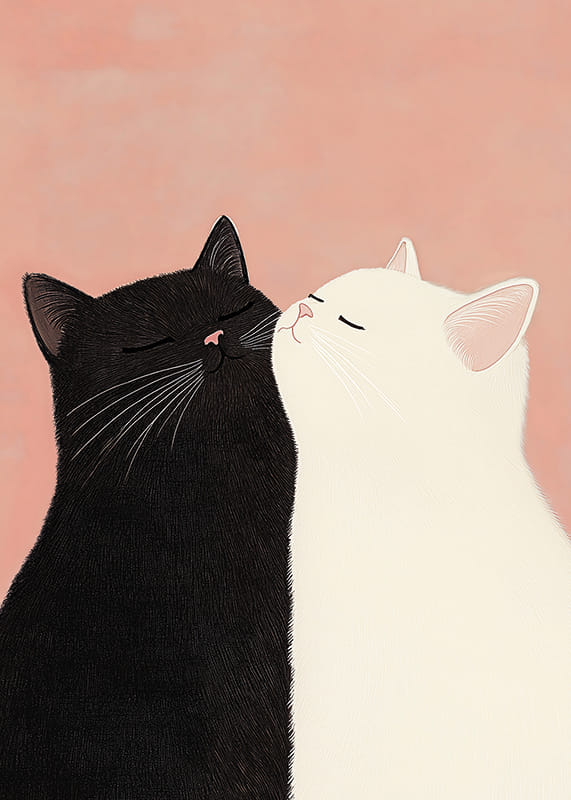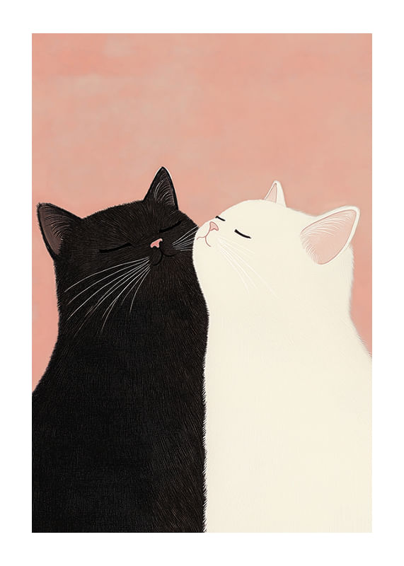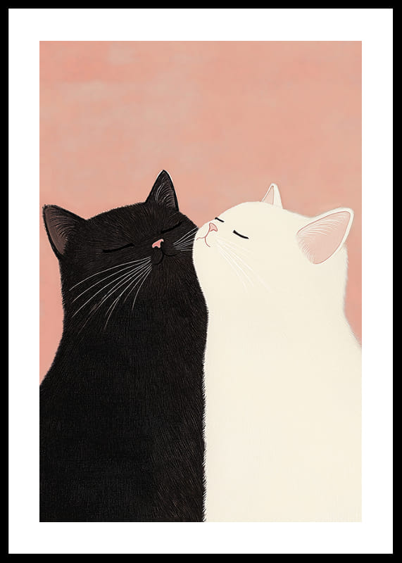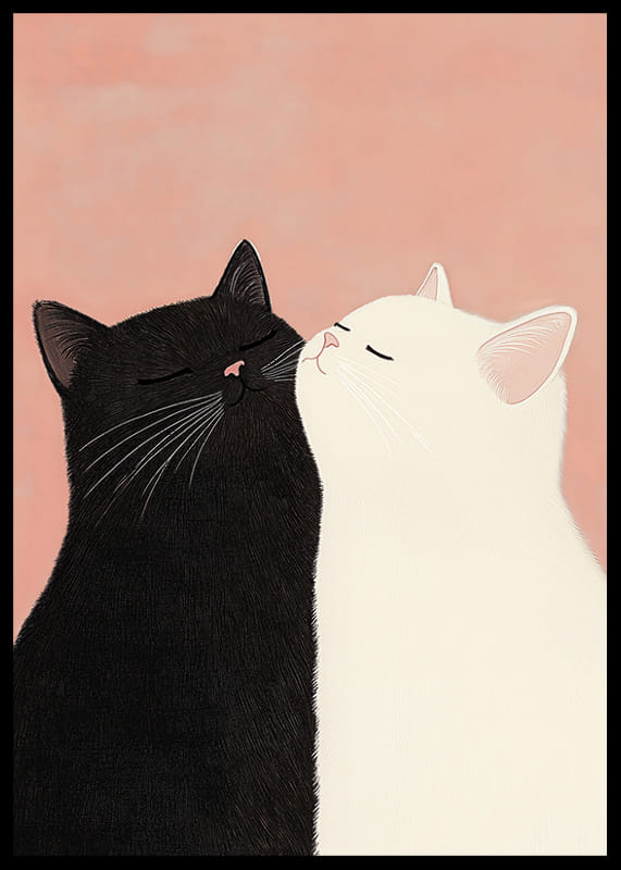This poster captures the moment of two cats sharing a loving embrace against a soft pink background. The contrast between the black and white fur creates a harmonious expression of balance and unity.