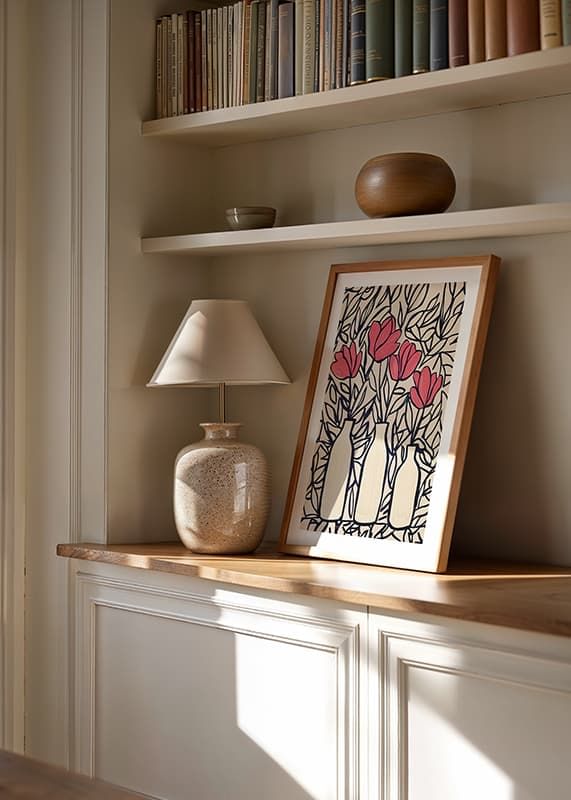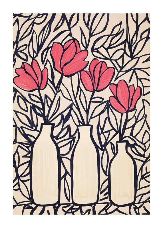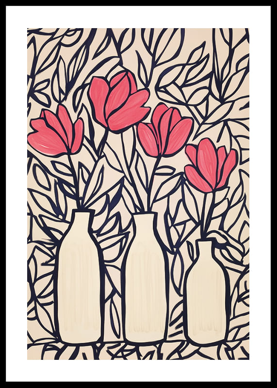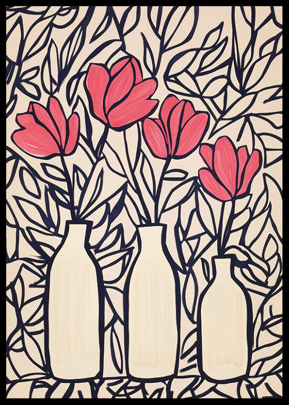 This poster catches the eye with its vibrant deep pink flowers, elegantly arranged in silhouetted vases. The darkly outlined leaves create a dynamic backdrop that highlights the beauty of the blooms.