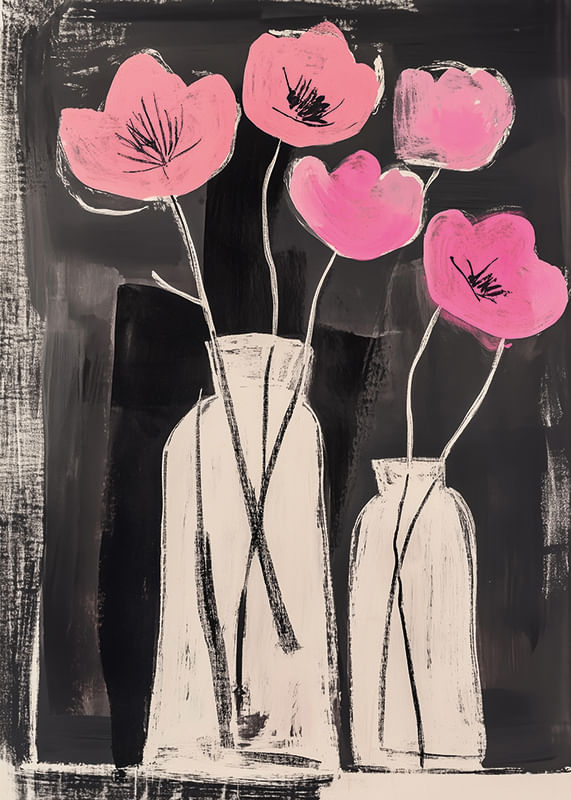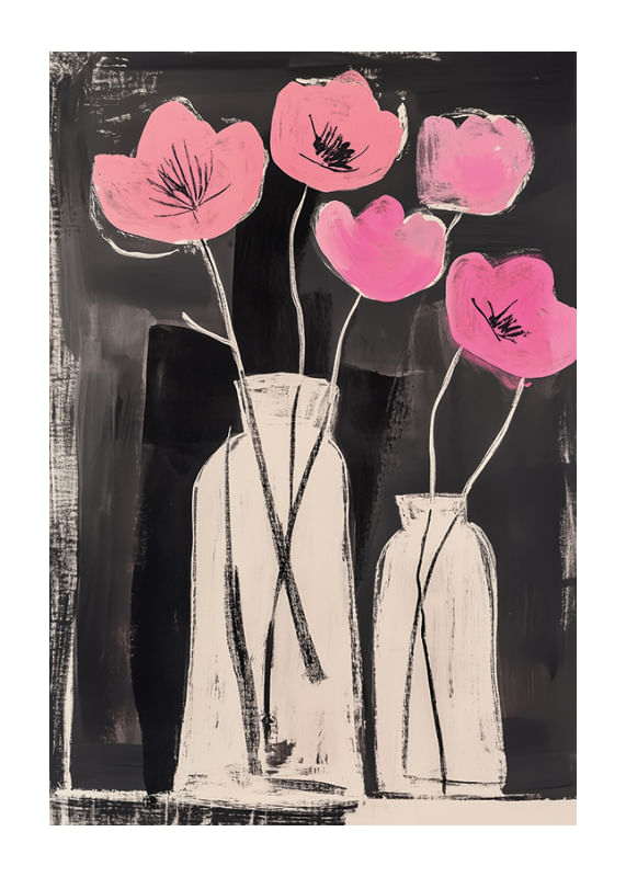 This poster immediately catches the eye with its elegant pink flowers contrasting against a deep black background. The soft hues and graceful shapes of the flowers create a sense of calm and beauty.