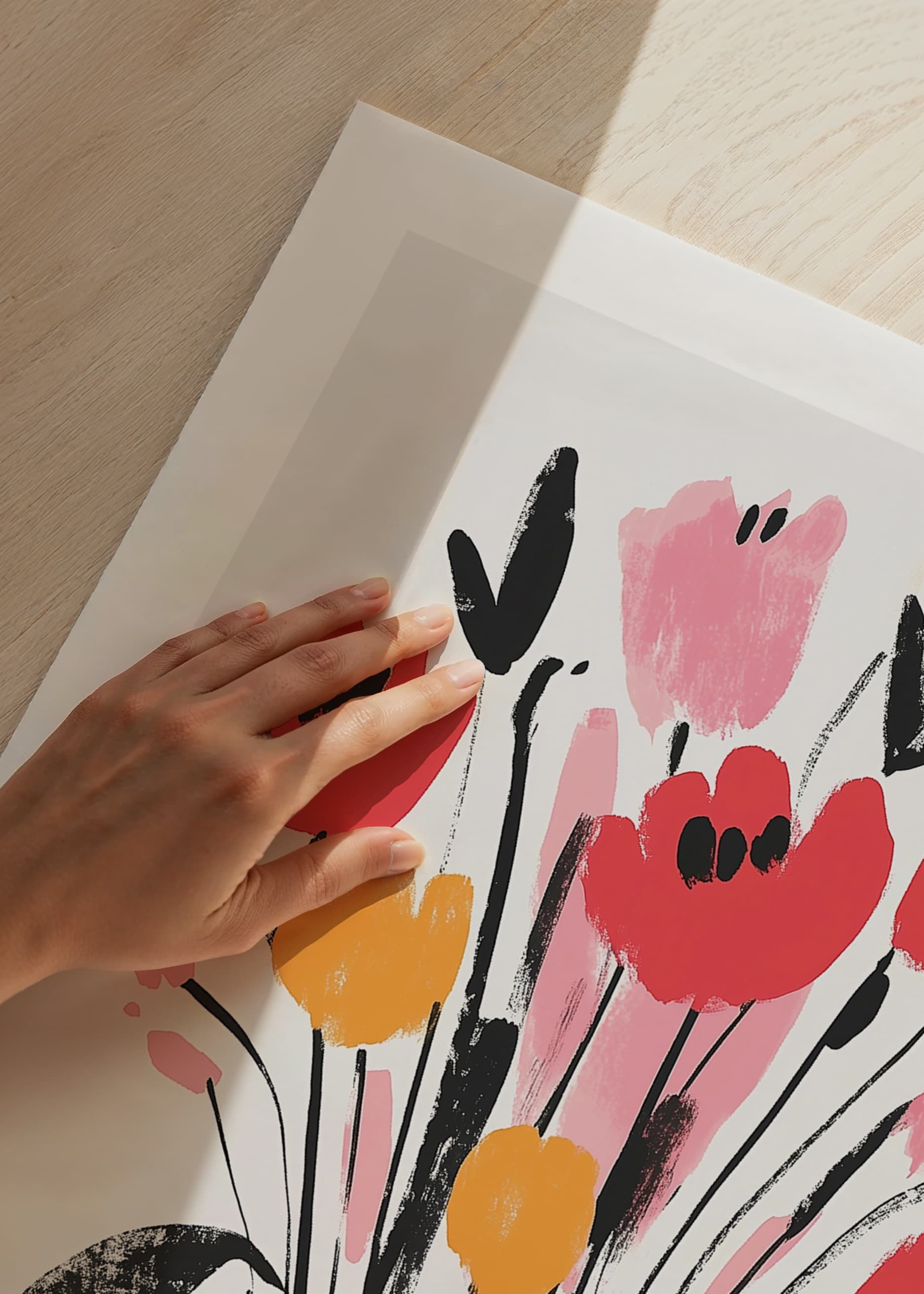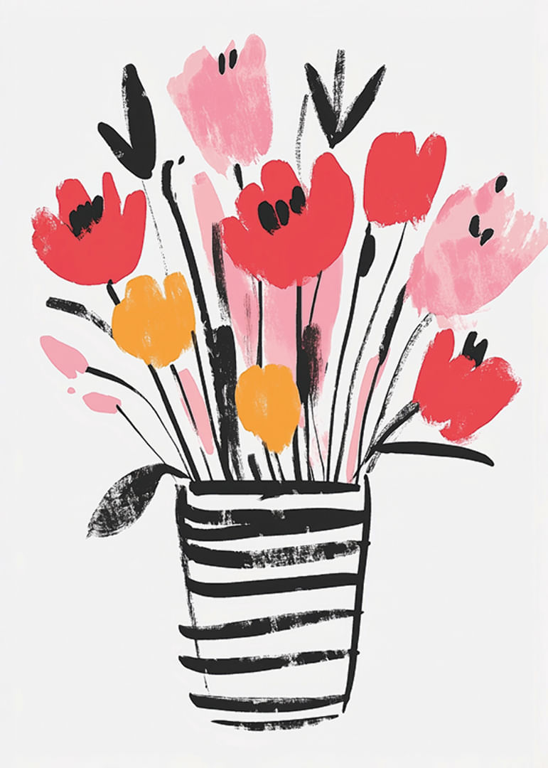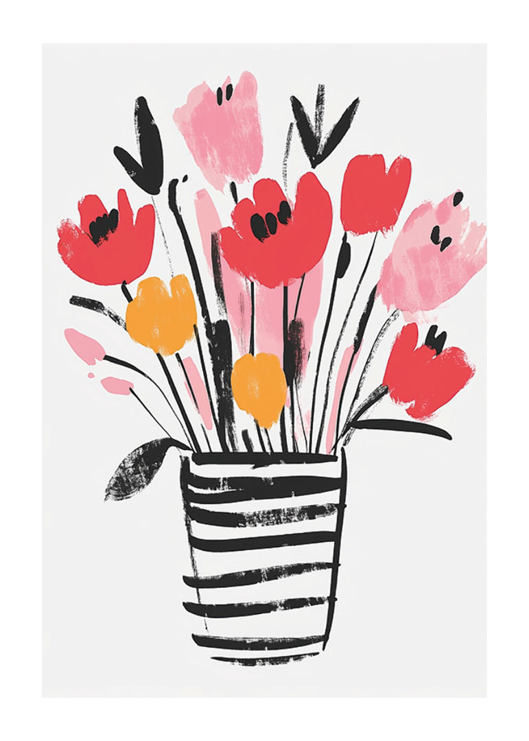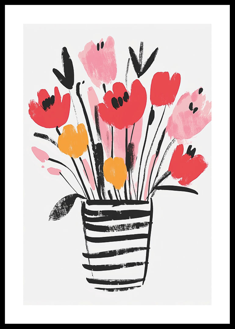 This poster catches the eye with its playful flowers in vibrant red and yellow tones, creating a sense of joy and energy. The simple brushstrokes add an artistic and modern touch, perfect for livening up any room.