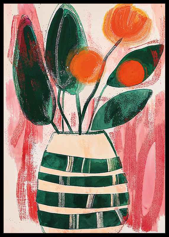 This poster immediately catches the eye with its dynamic colors and vibrant floral compositions. The deep green leaves together with the vibrant orange flowers create a harmonious contrast that spreads warmth and life to any room.