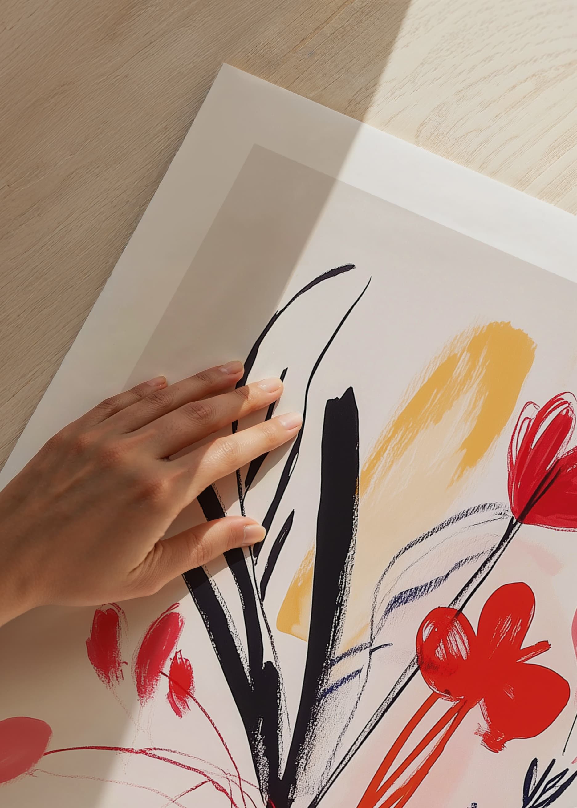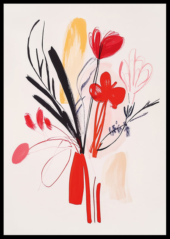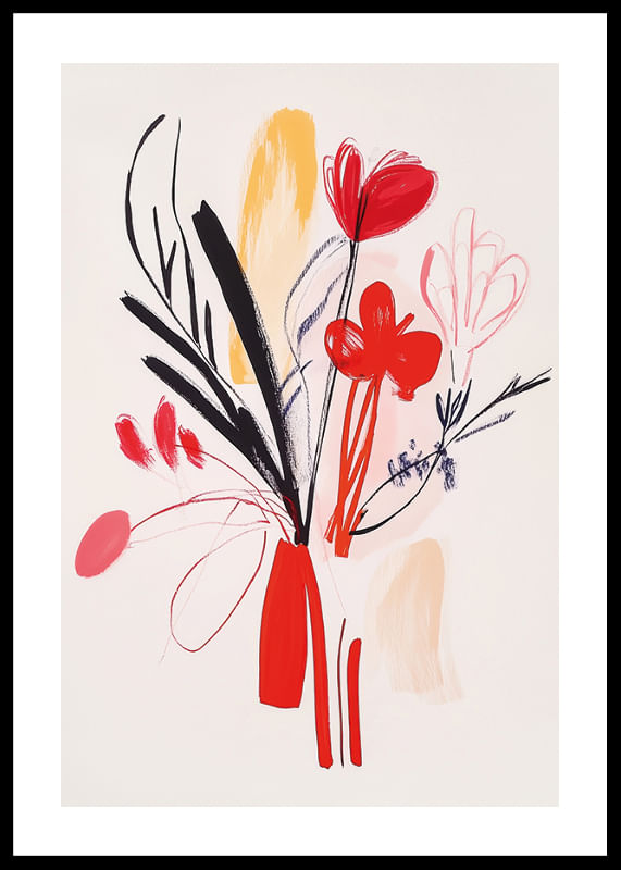 This poster captures a vibrant artistic interpretation of flowers, where dynamic shapes and colors come together in a harmonious symphony. Red and black stripes create a fascinating contrast against soft pastel colors that add depth and movement.