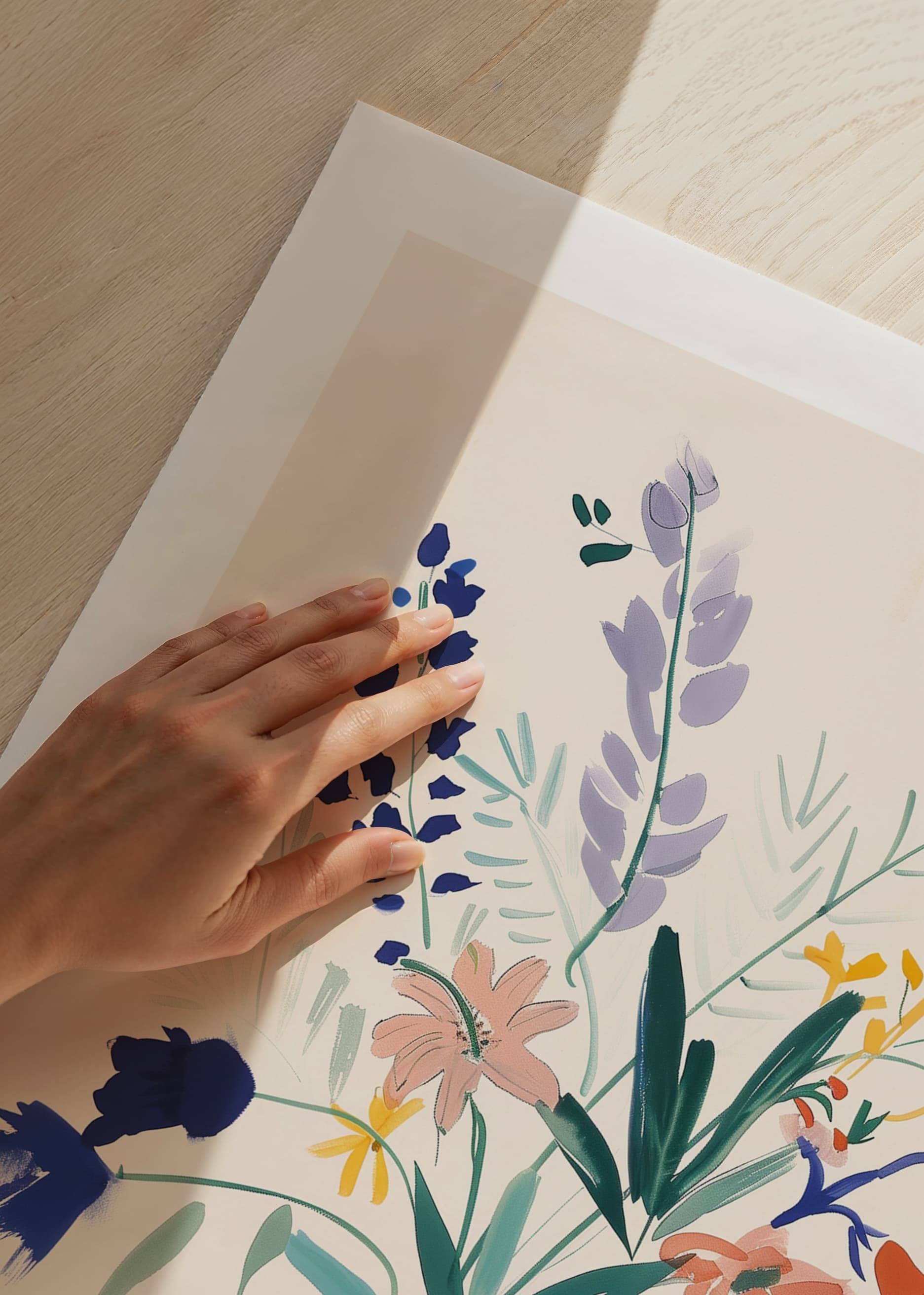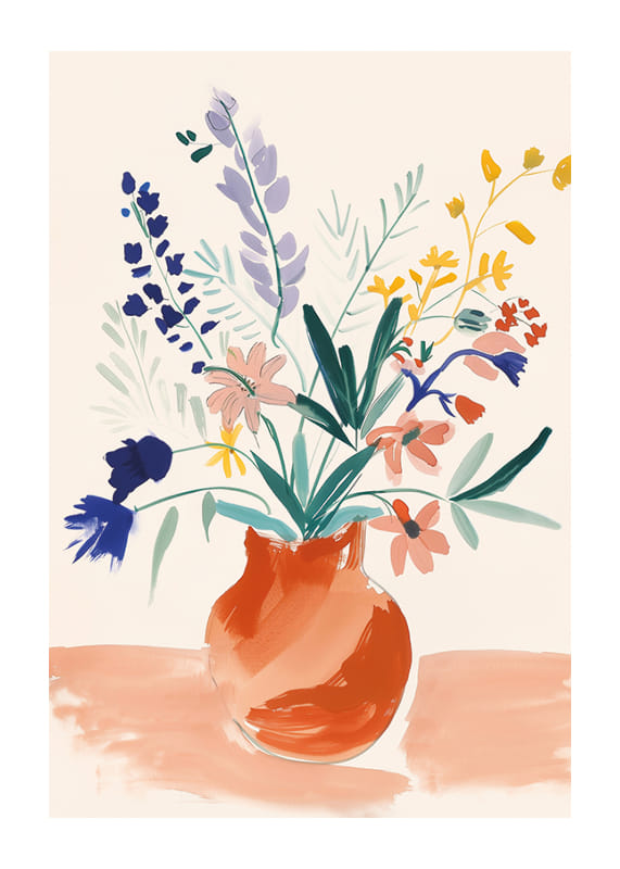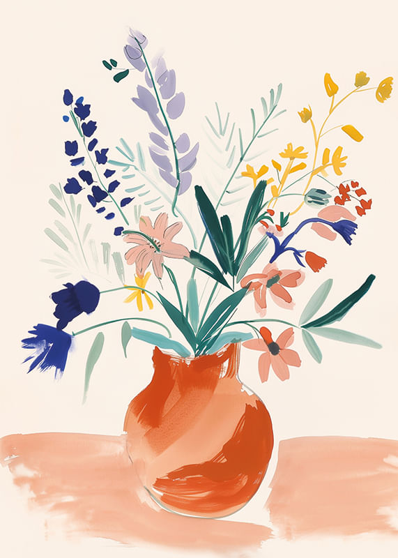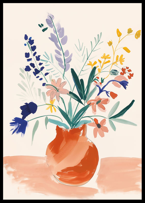 This poster catches the eye with a vibrant collection of colorful flowers in a rustic vase. With sweeping brushstrokes in blue, yellow, and pink, it creates a balance between nature and art.