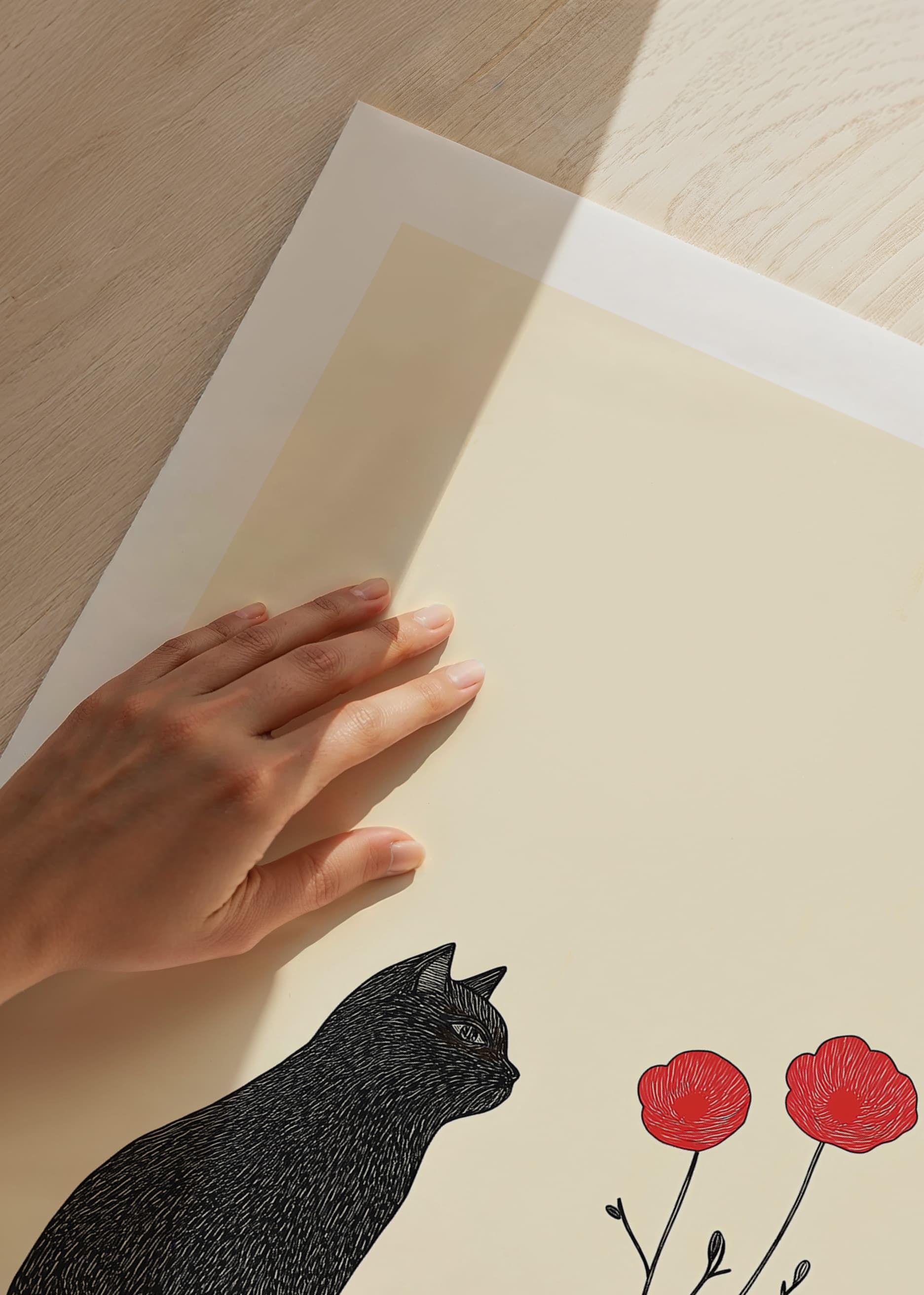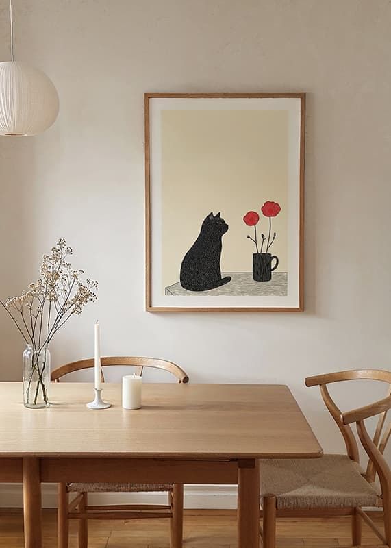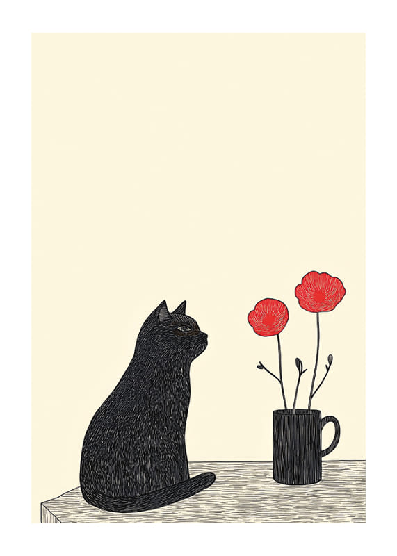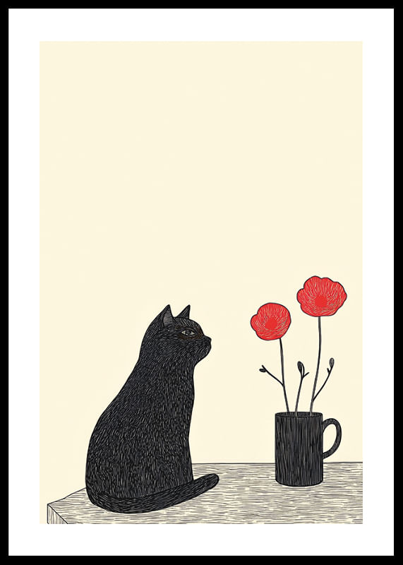 The poster captures a mesmerizing silence where a black cat sits next to red flowers in a vase. The limited color palette of black and red against a simple background conveys a sense of calm and mystery.