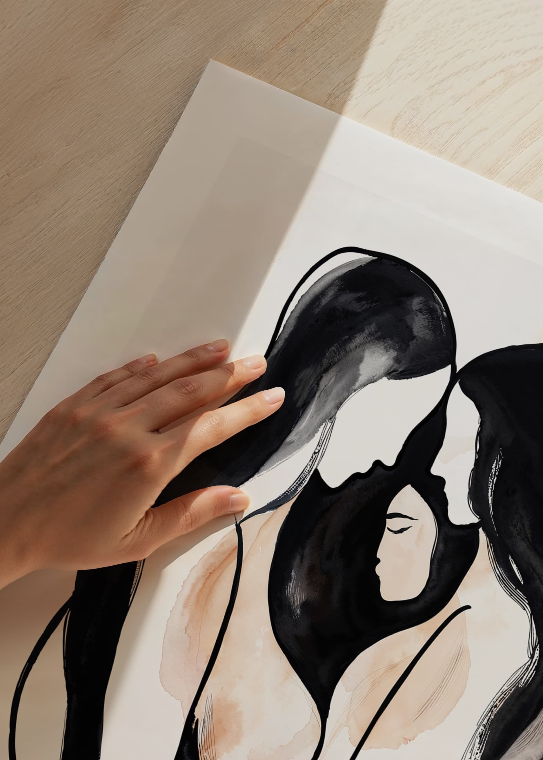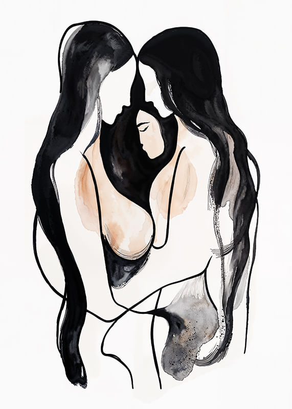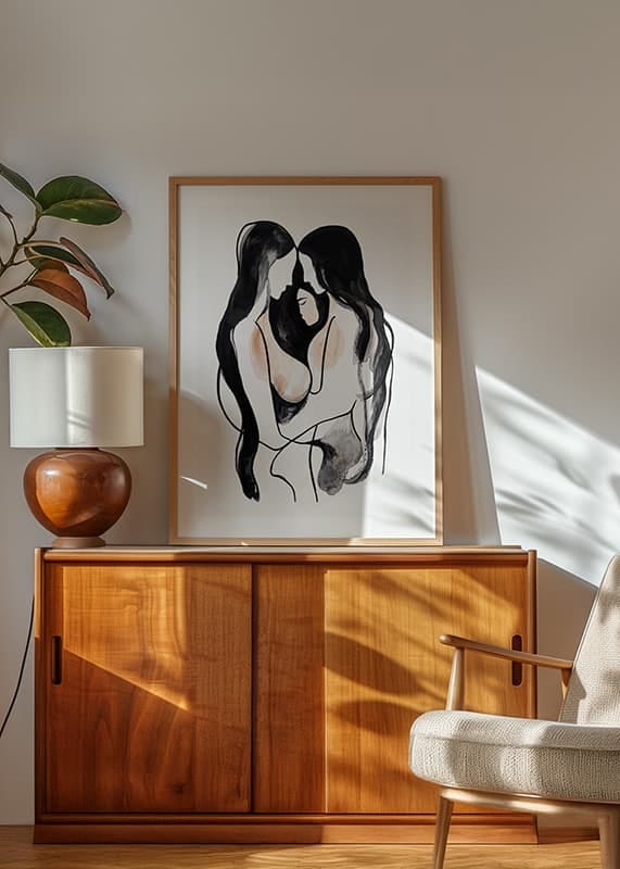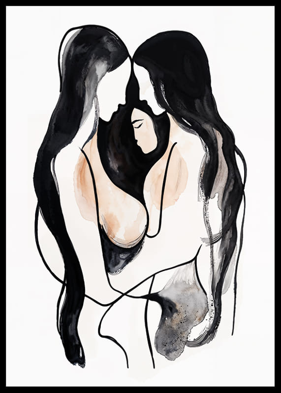 In this poster, two figures meet in an intimate and comfortable embrace, their contours intertwined in soft, undulating lines. The abstract style and monochromatic palette create a sense of inner peace and unity.
