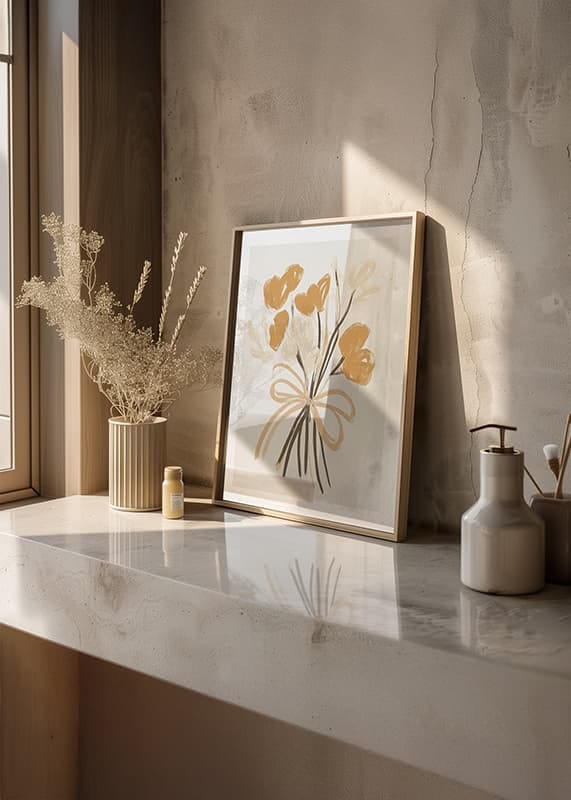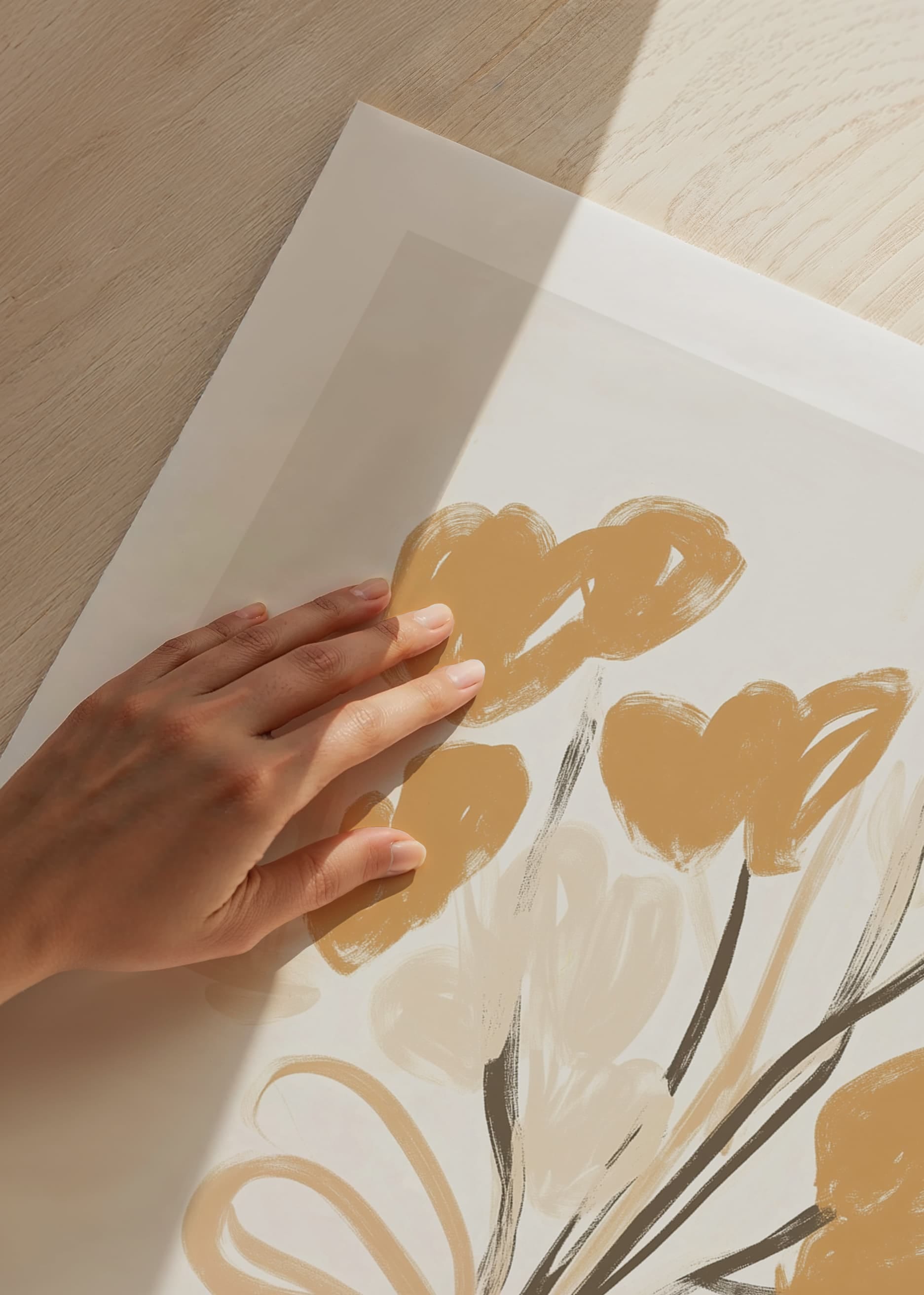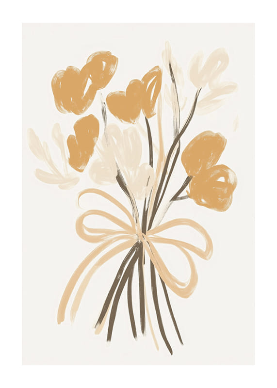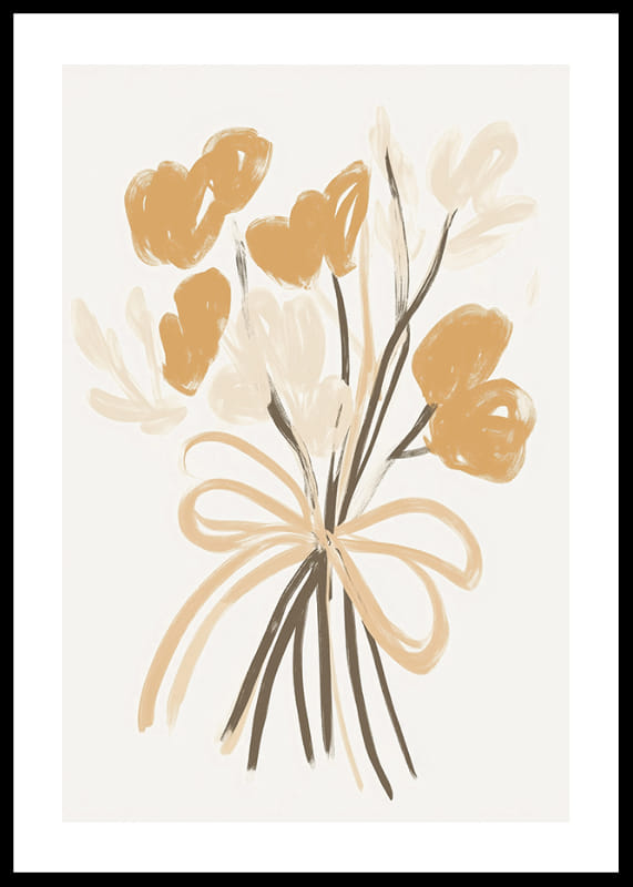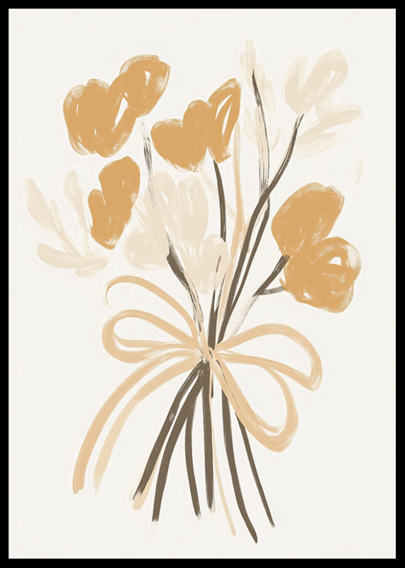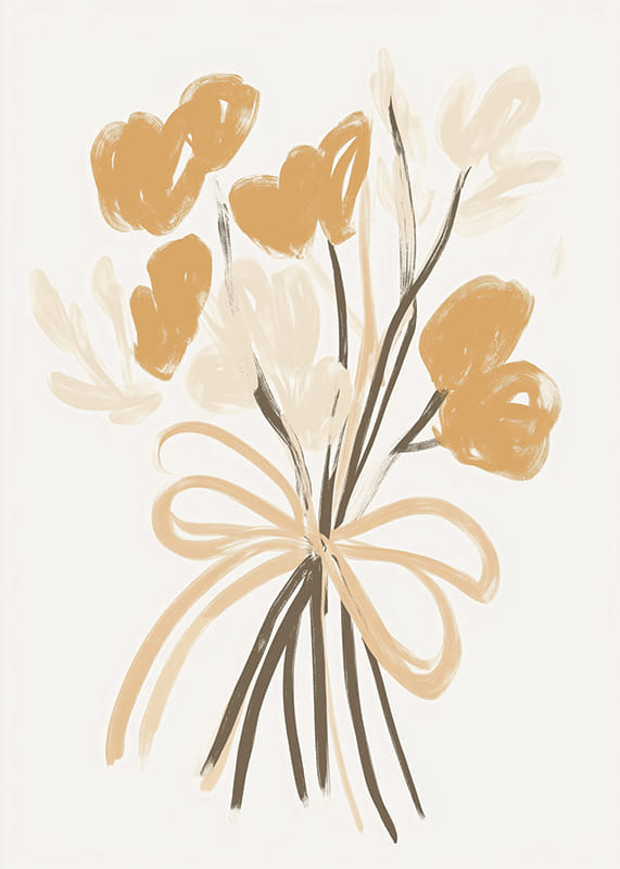 This poster captures the moment of floral beauty with soft, golden hues dancing on the surface. The stylized leaves with their elegant curves create a sense of movement and life. The simple yet sophisticated color palette of this work highlights the natural charm of the flowers.