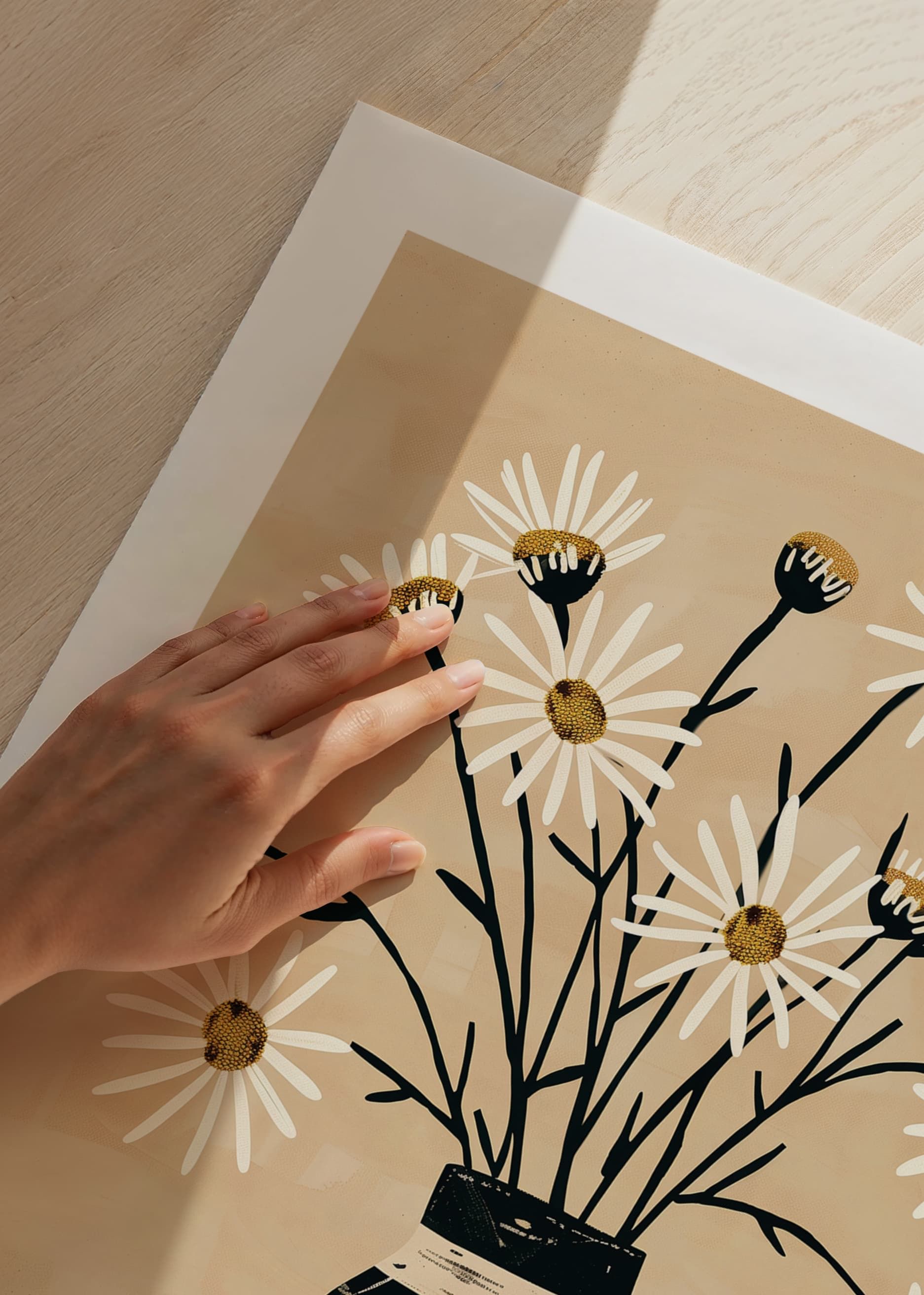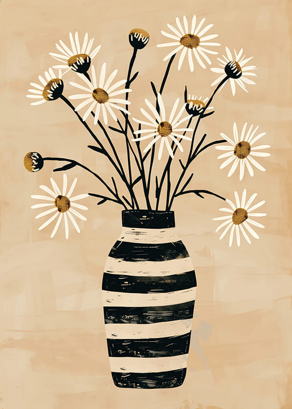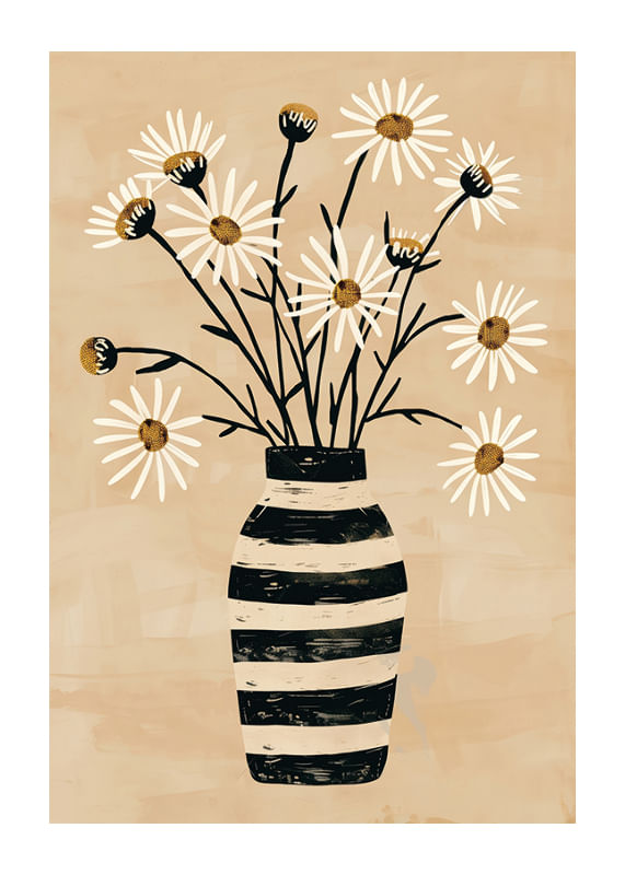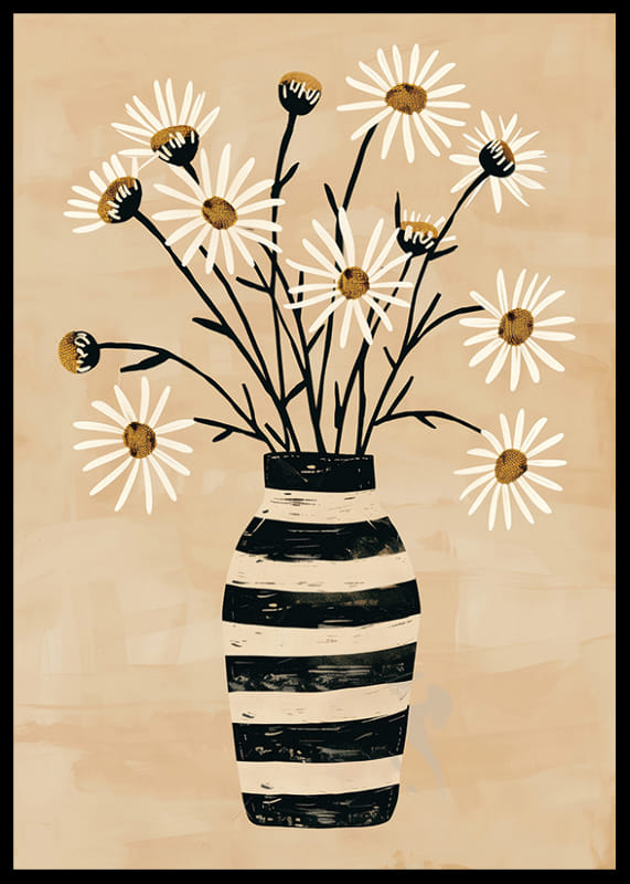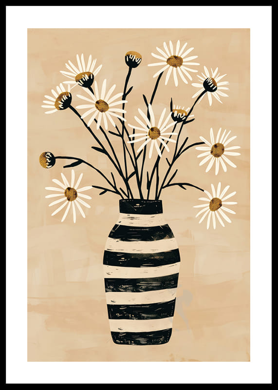 This poster captures the rustic beauty of daisies in an elegant striped vase, conveying a sense of calm and harmony. The beige background highlights the subtle colors of the flowers, while the contrasting pattern of the vase adds a stylish touch.