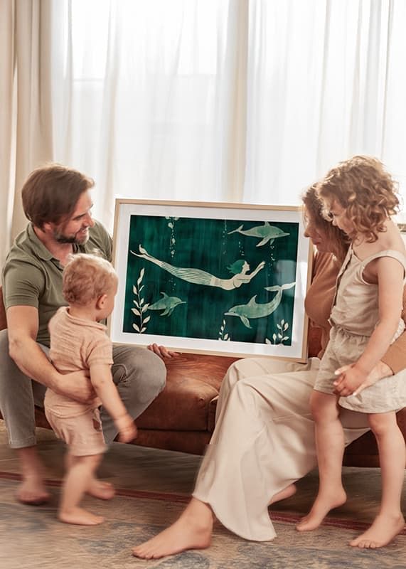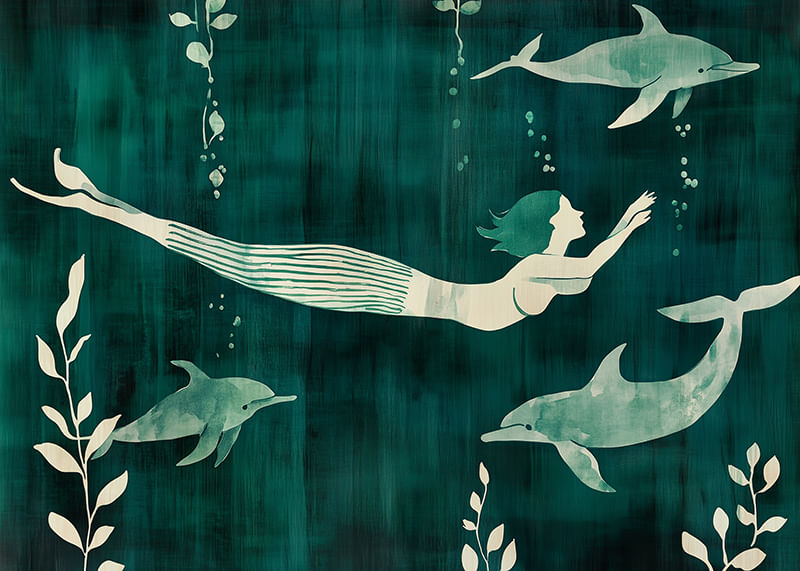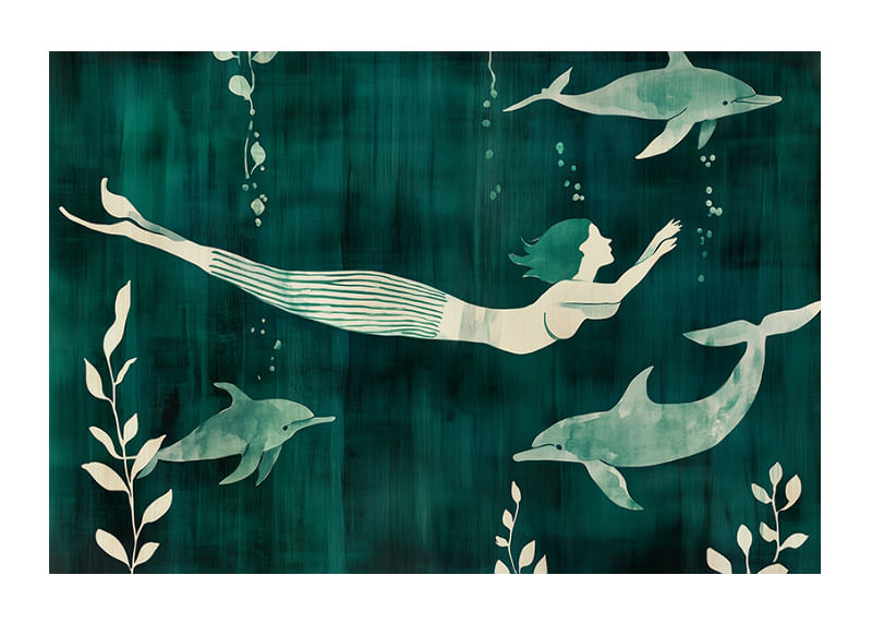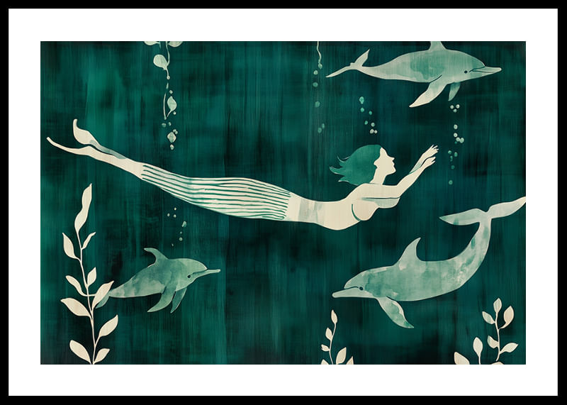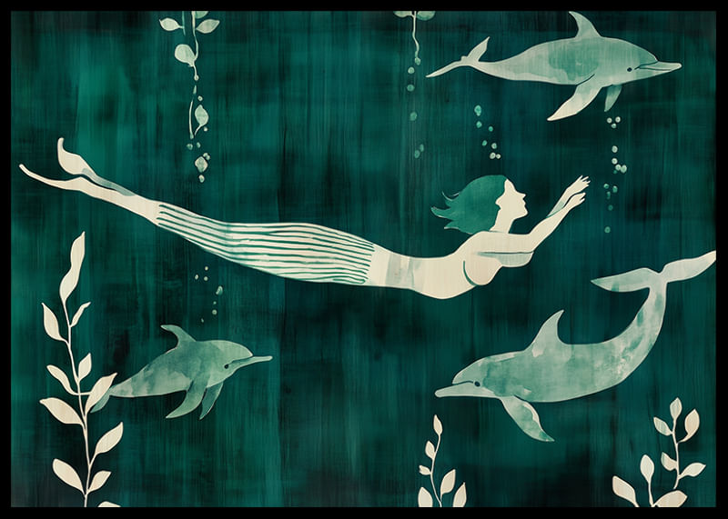 This poster captures a mysterious mermaid swimming with dolphins in a rippling blue-green sea. The contrast between the soft silhouettes and the deep color palette creates a dreamlike sense of freedom and harmony.
