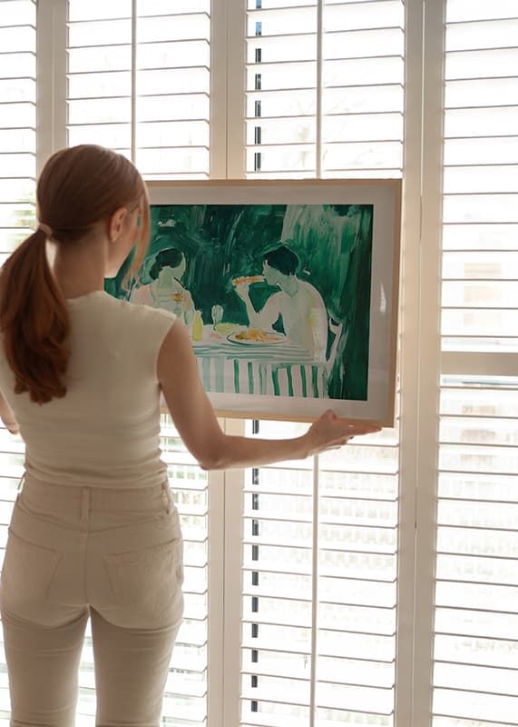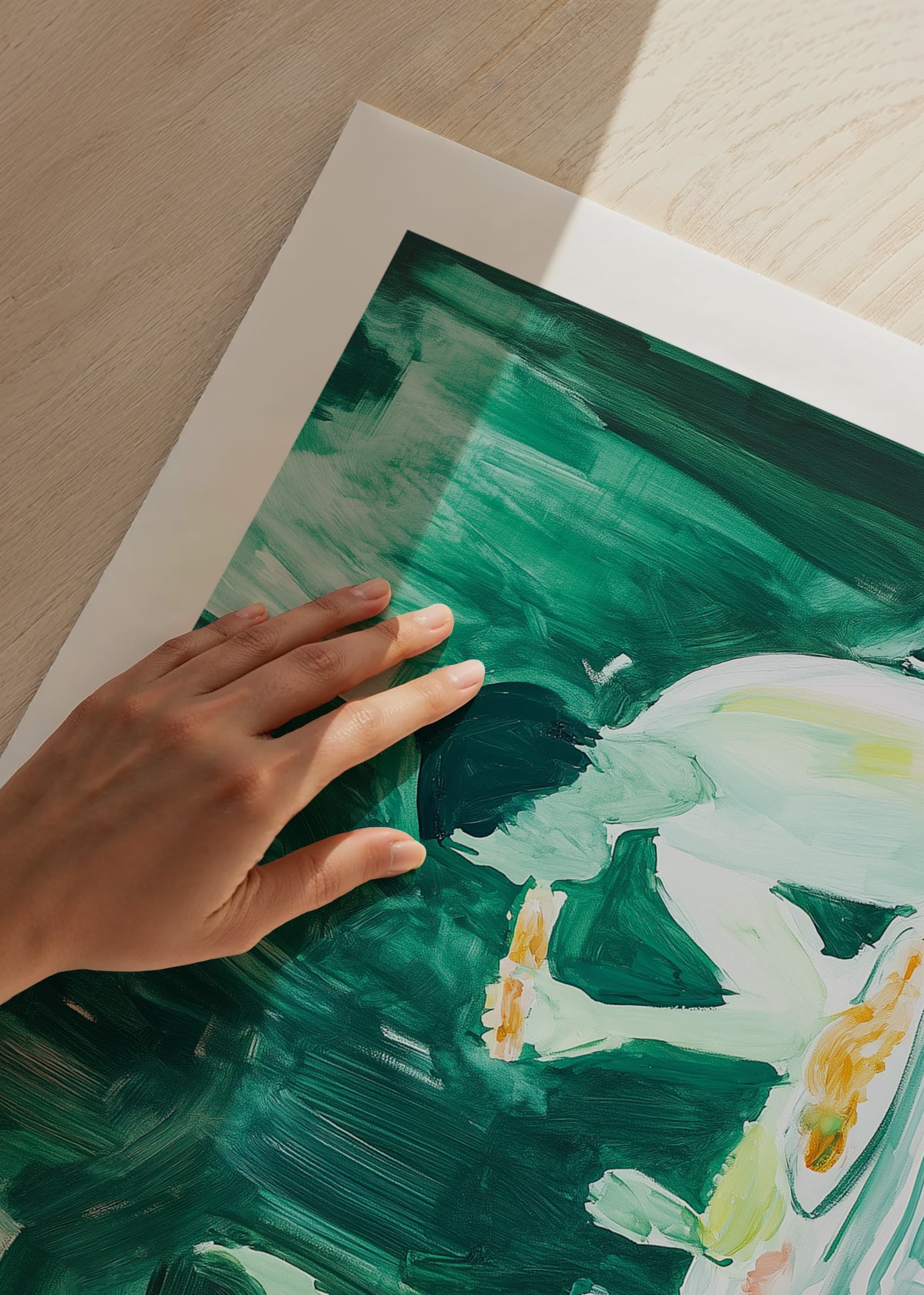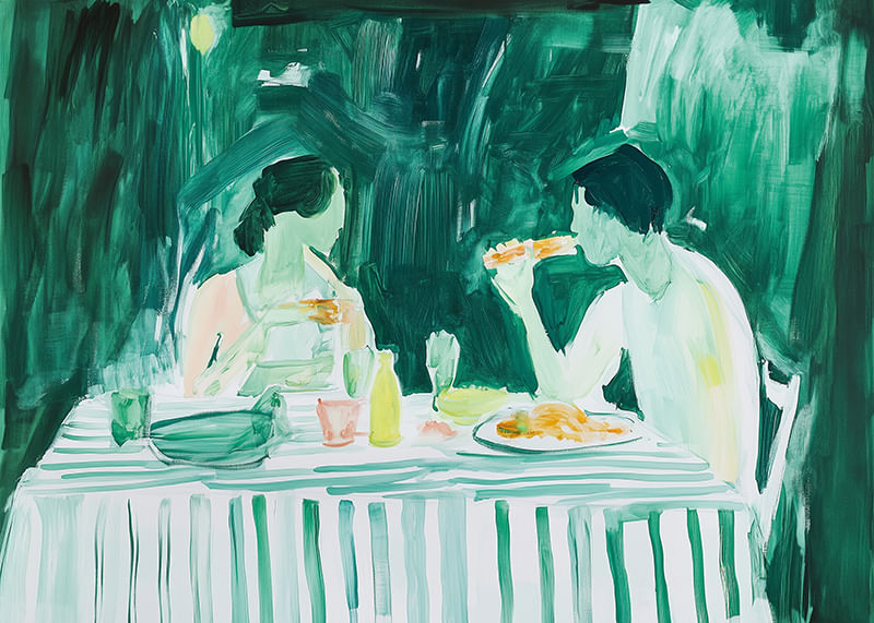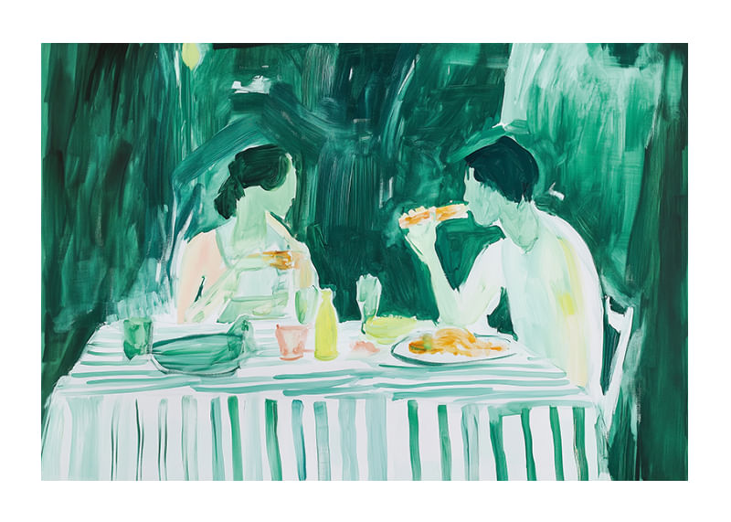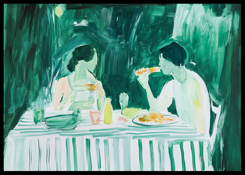 This poster captures an intense and dreamlike scene in green tones, where two people enjoy a dinner together. The table is set with simple dishes, while the surroundings envelop the couple in an emerald green atmosphere.