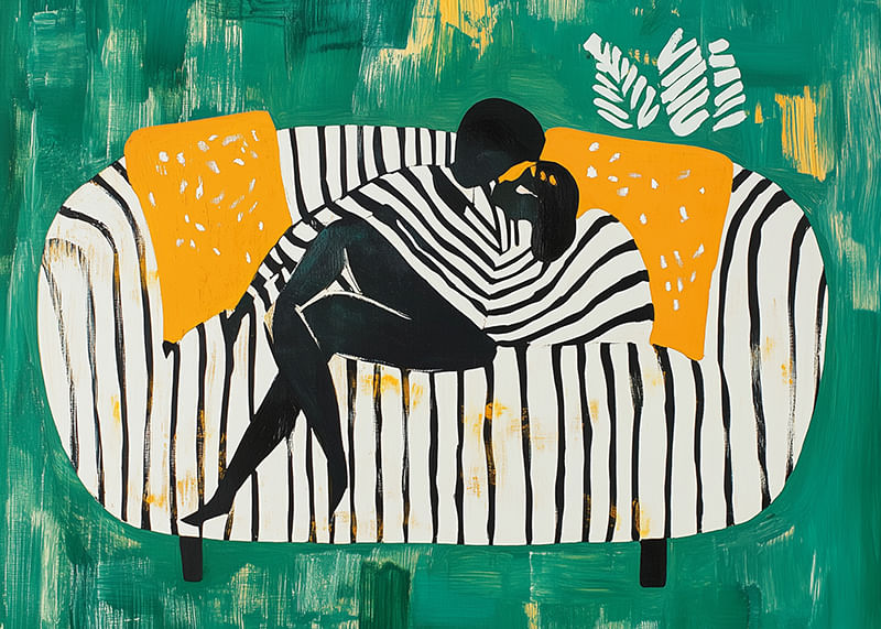 This poster captures a loving embrace in an abstract and colorful expression. On a background of deep green, the graphic stripes are combined with vibrant orange details, giving a feeling of harmony and closeness.