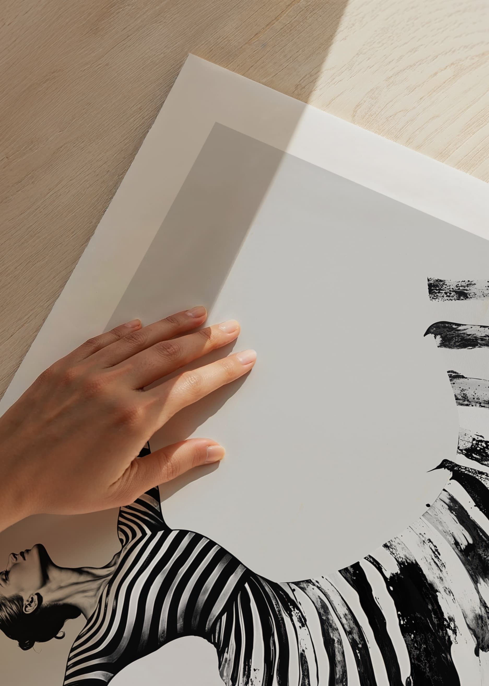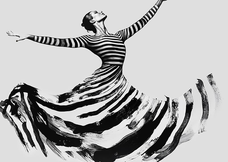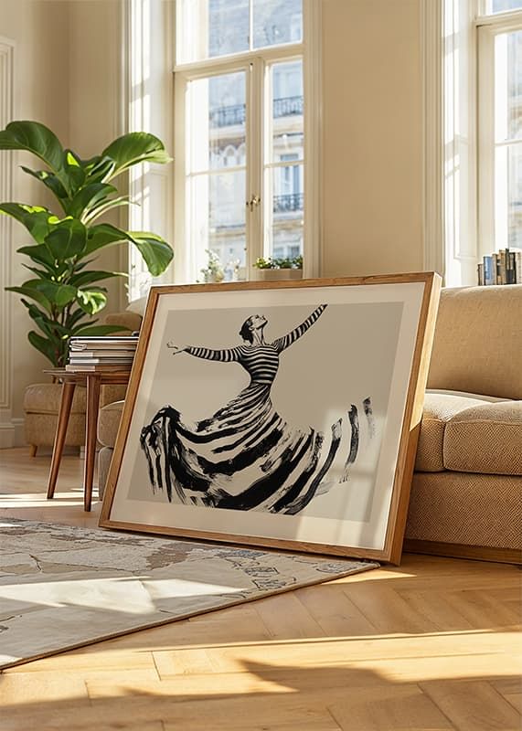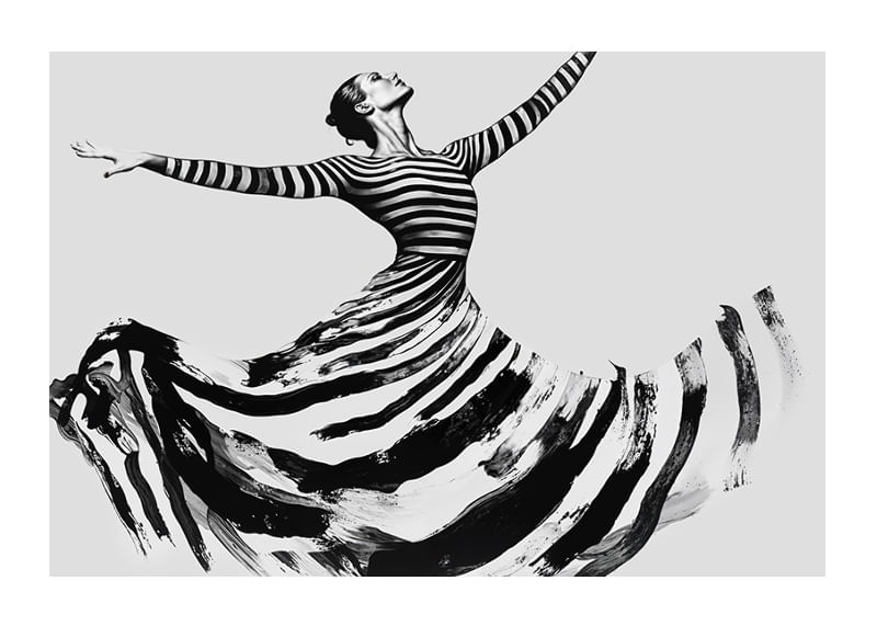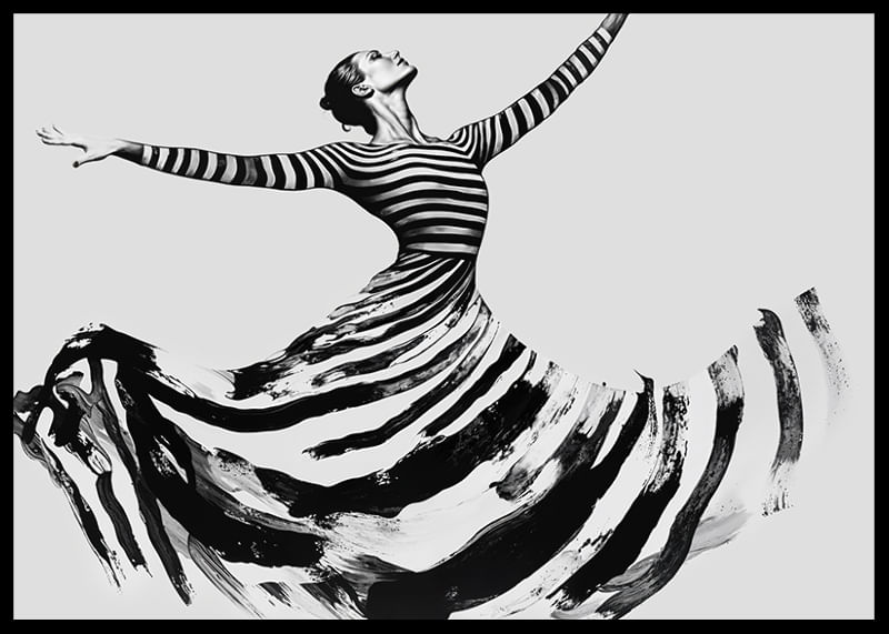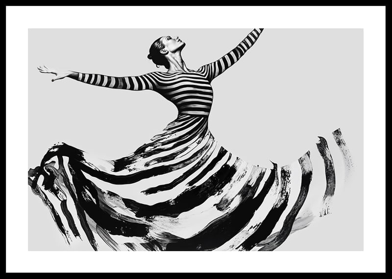 This poster captures the elegance of a dancer, with every movement visible in powerful, sweeping stripes. With its modern and timeless feel, it evokes a sense of freedom and strength. The black and white color scheme creates a dramatic contrast, adding a sophisticated touch to any room.