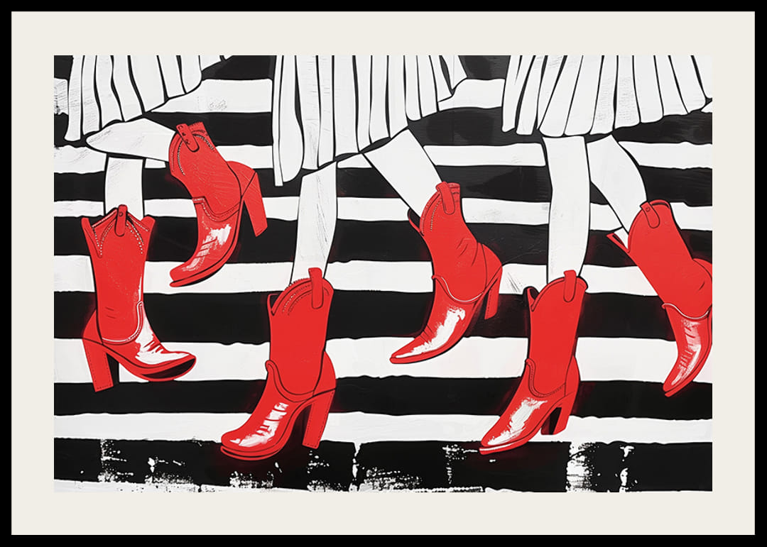 This poster catches the eye with its stylish red boots contrasting dramatically against bold black and white stripes. The carefully depicted movements give an impression of energy and fashion, evoking a sense of creativity and style.