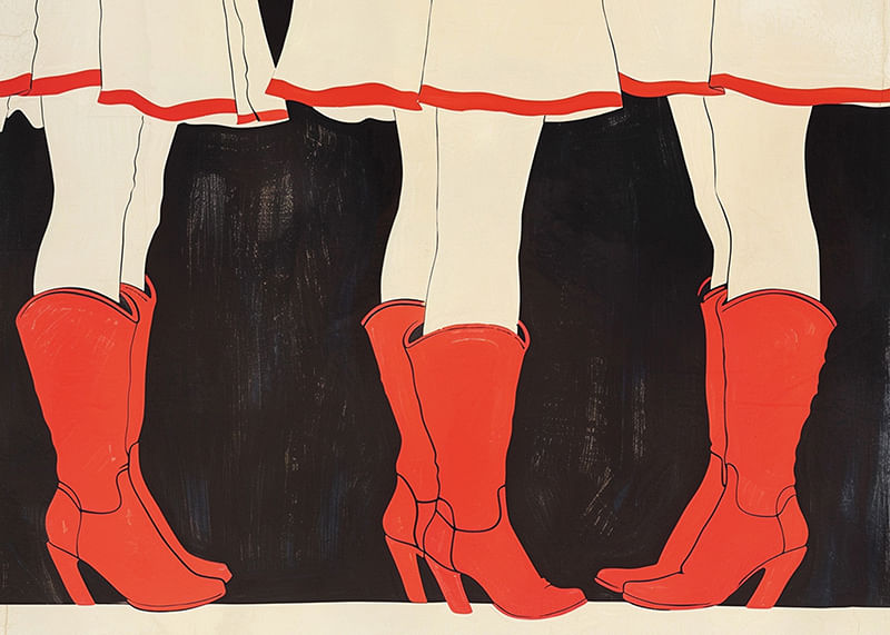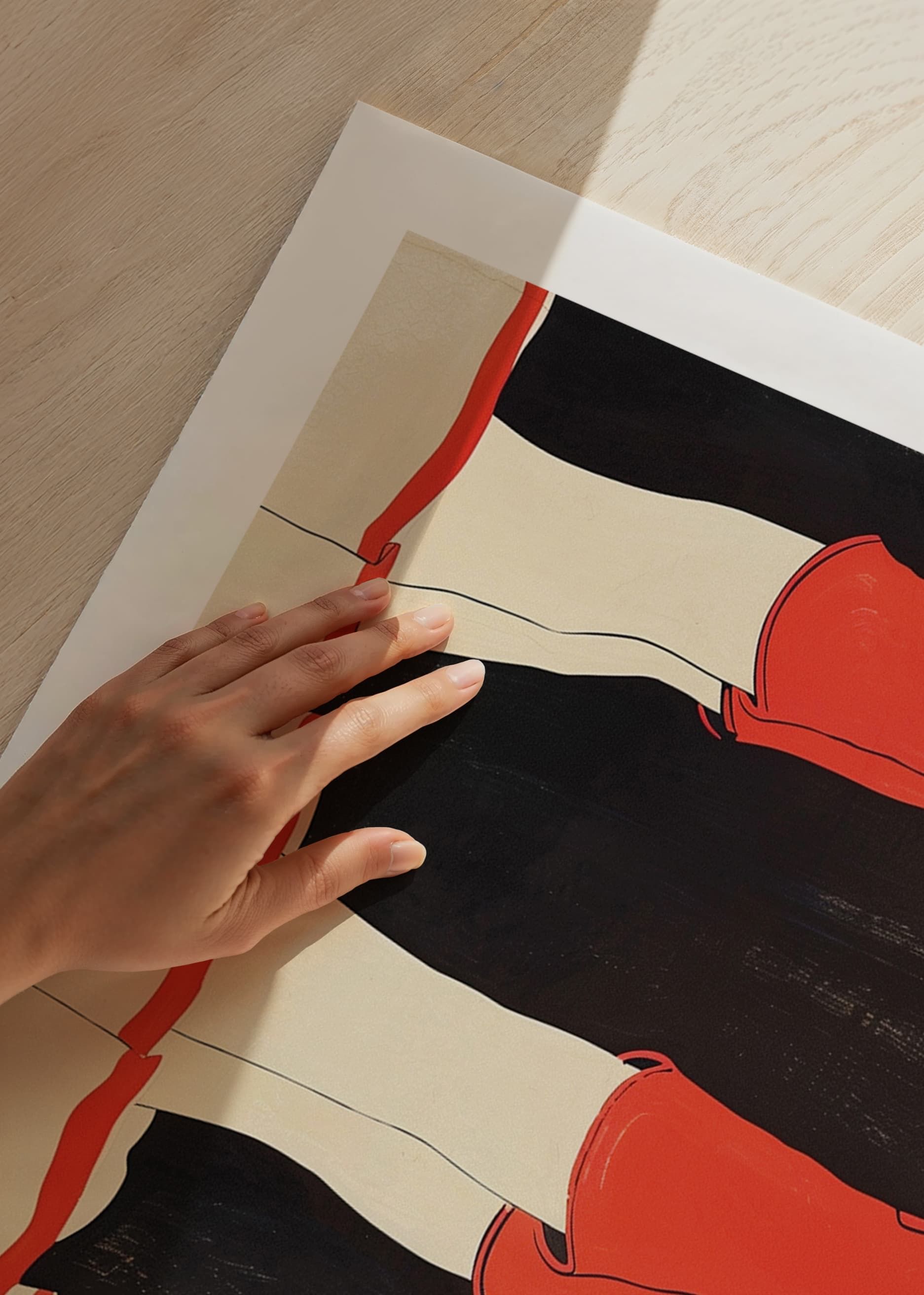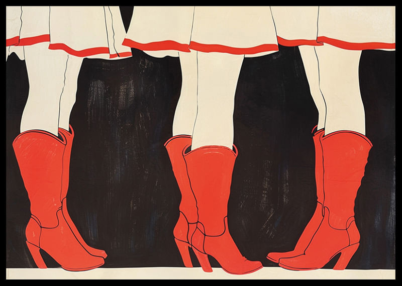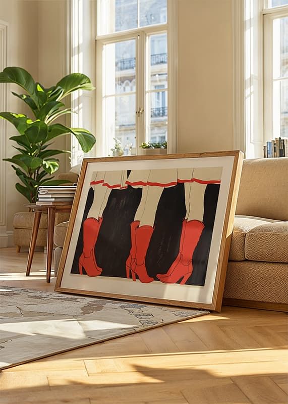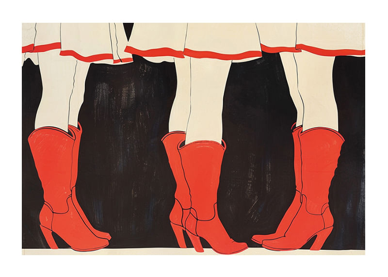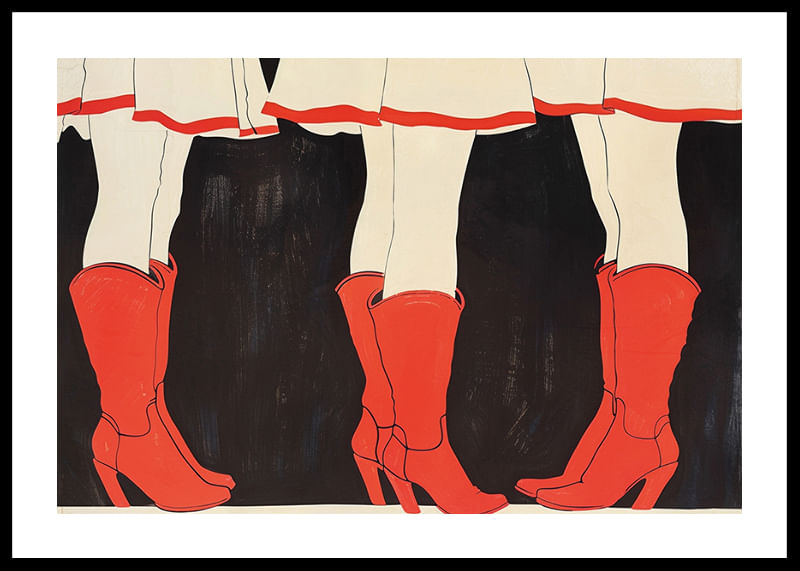 This poster captures the dynamic meeting of retro style and modern art through its bold red boots against a simple background. The red details give a sense of movement and energy, highlighting the lines and elegant posture of the clothes.