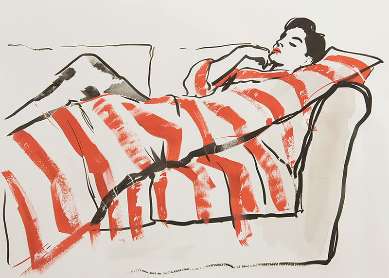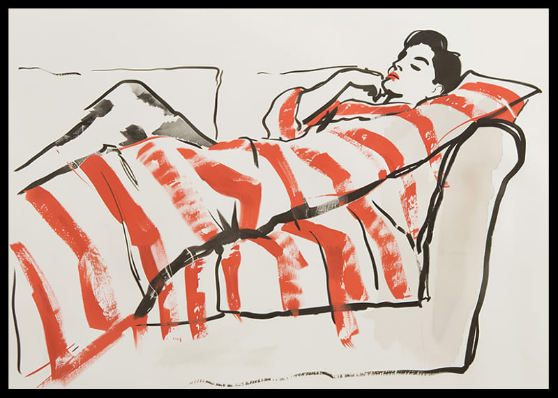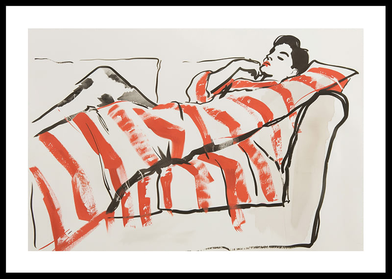 This poster captures a relaxed and harmonious moment where a figure lies comfortably wrapped in vibrant orange and white stripes. With its simple yet expressive line drawing, it gives a sense of peace and tranquility.