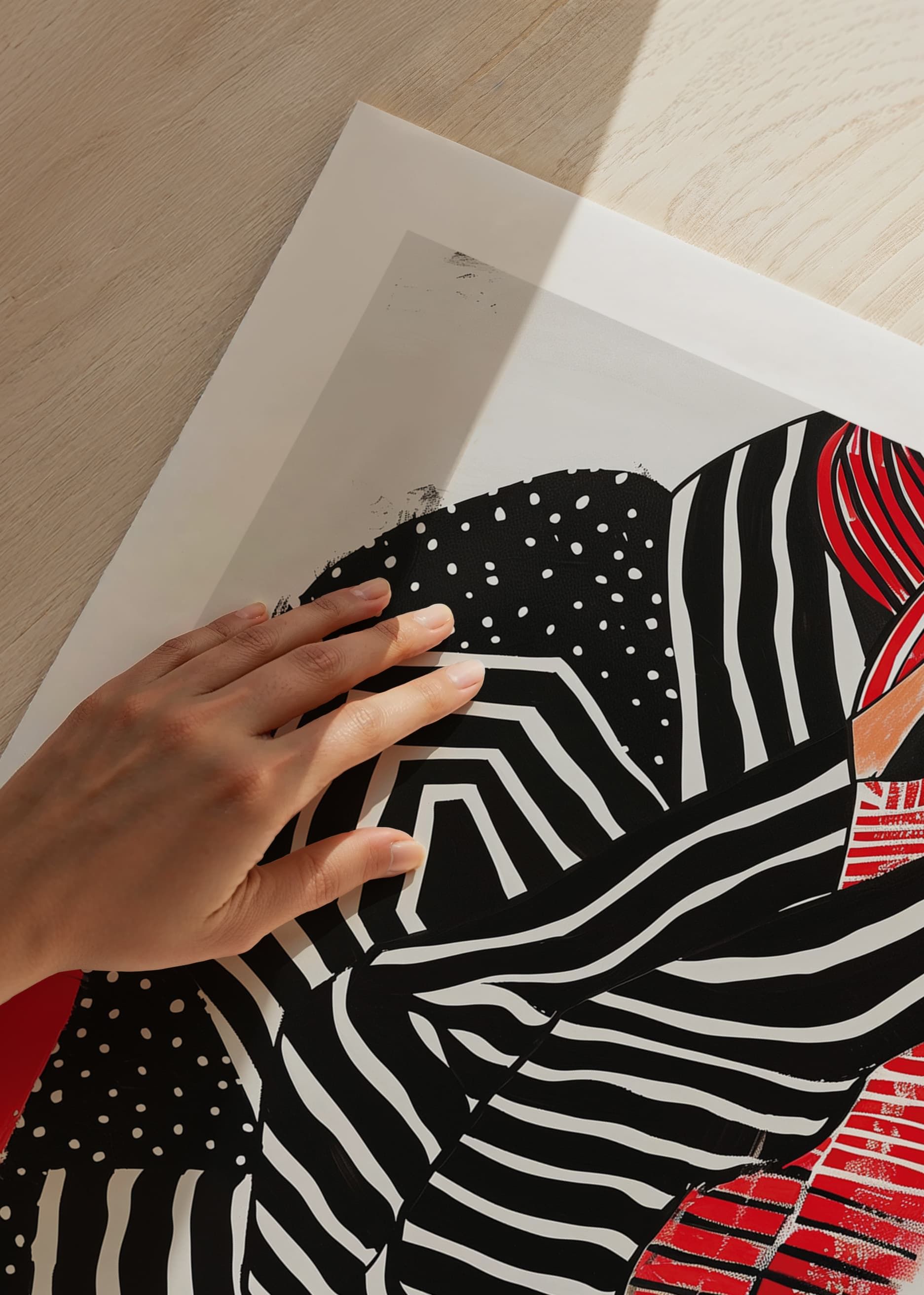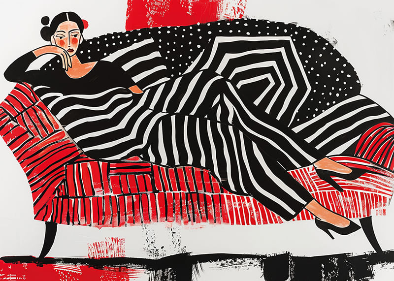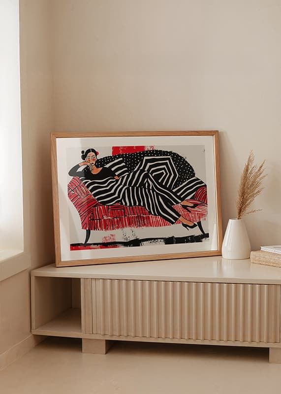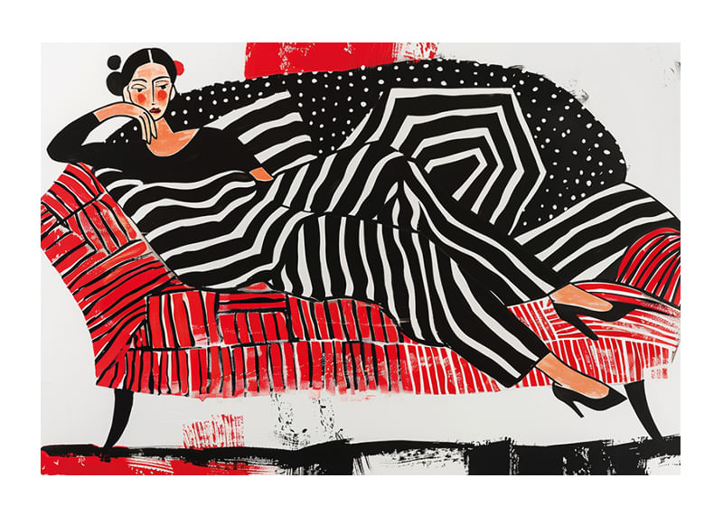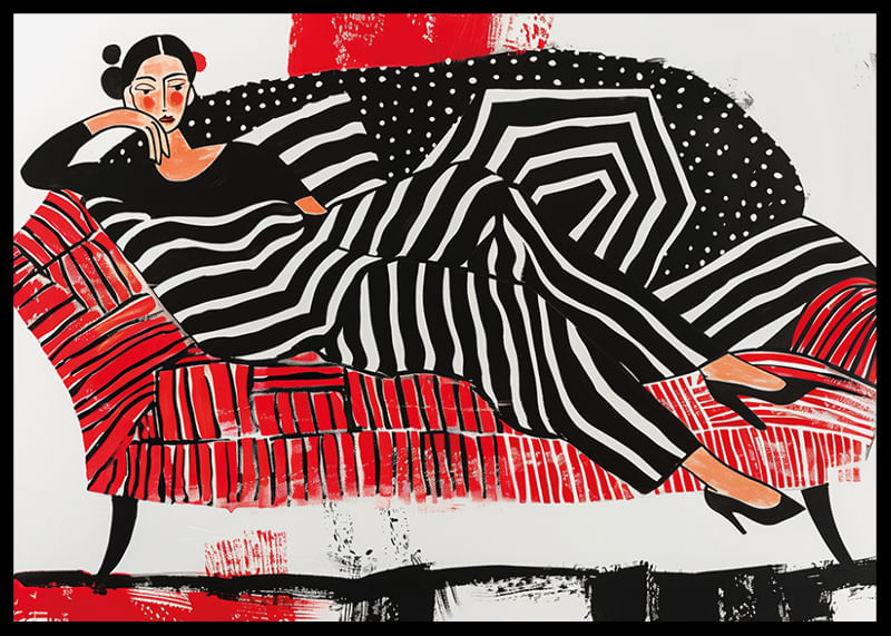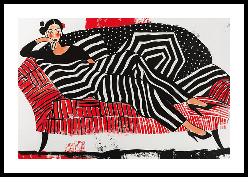 This poster immediately catches the eye with its strong contrast of black, white and red. The woman depicted in soft lines and geometric patterns exudes a sense of sophisticated relaxation.
