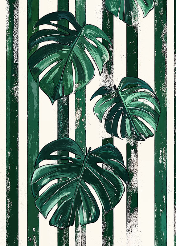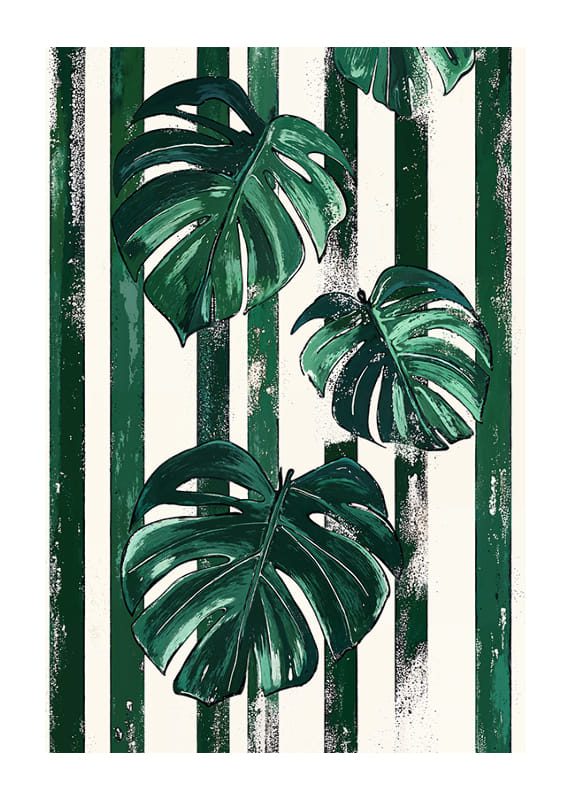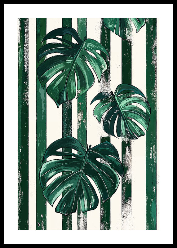 Energy and freshness vibrate from this unique poster, where Monstera leaves dance against a backdrop of bold white and green stripes. The details of the leaves are highlighted by the dramatic contrasts, transforming any room into a tropical oasis.