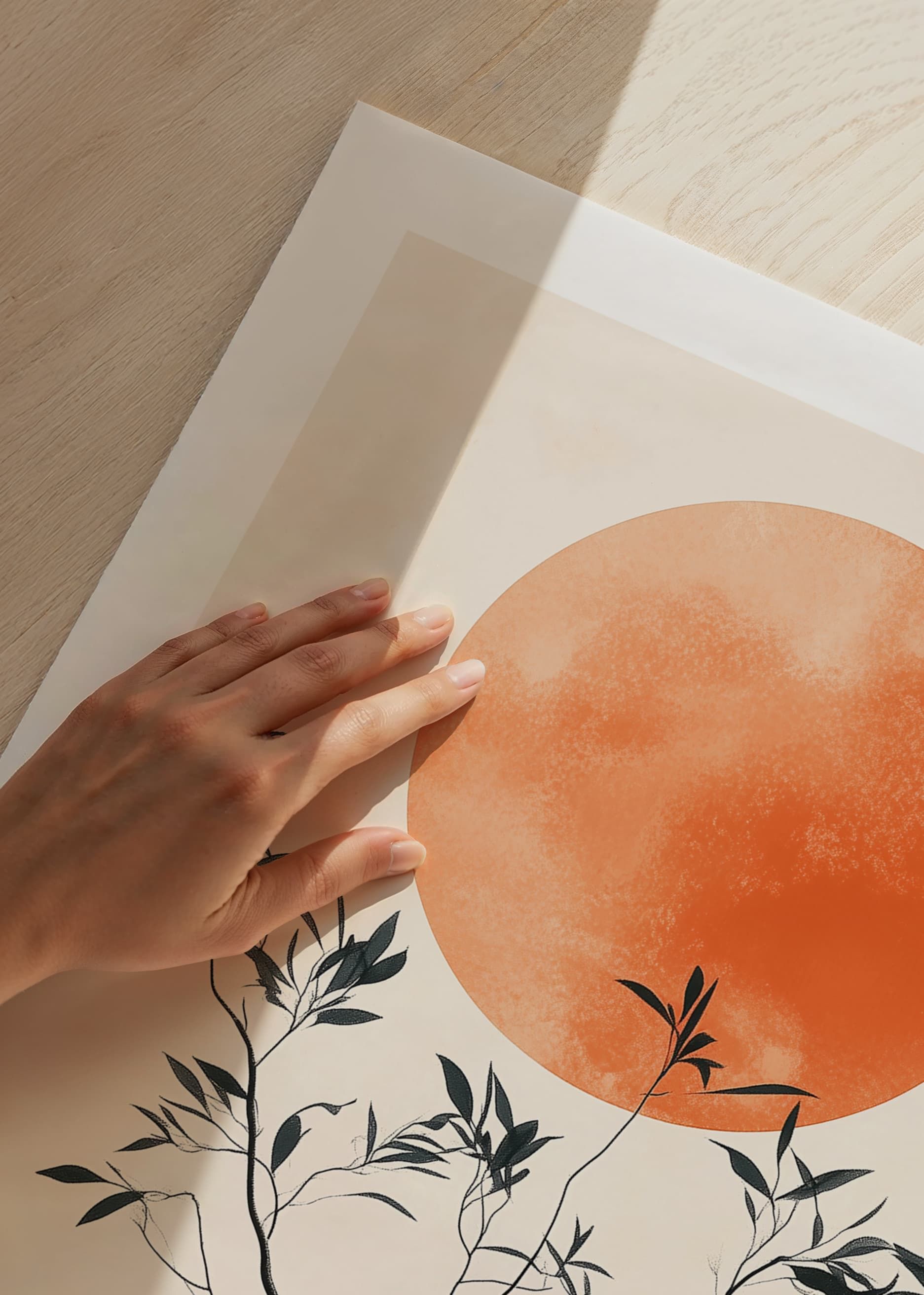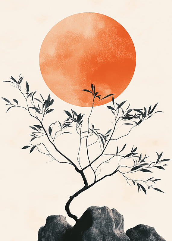 This artistic poster captures a timeless harmony between the elements of nature, where an elegantly curved tree branch contrasts with the fiery, round sun in the background. The minimalist design and natural colors create a calm and meditative feel.