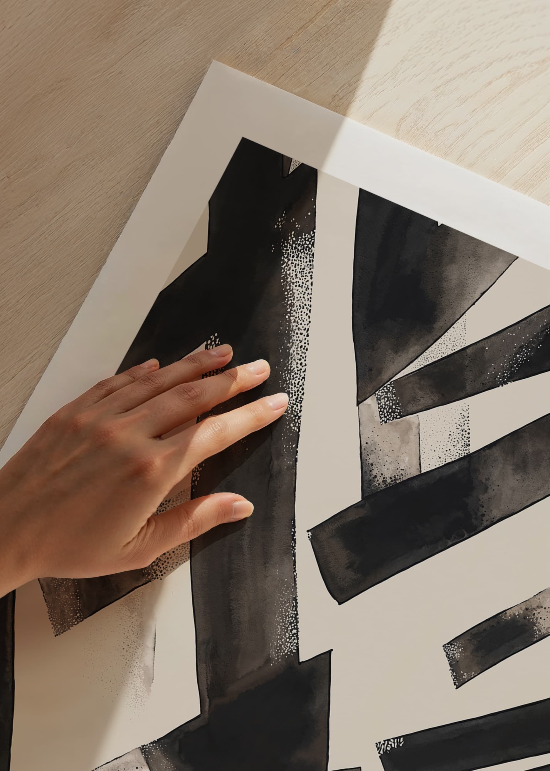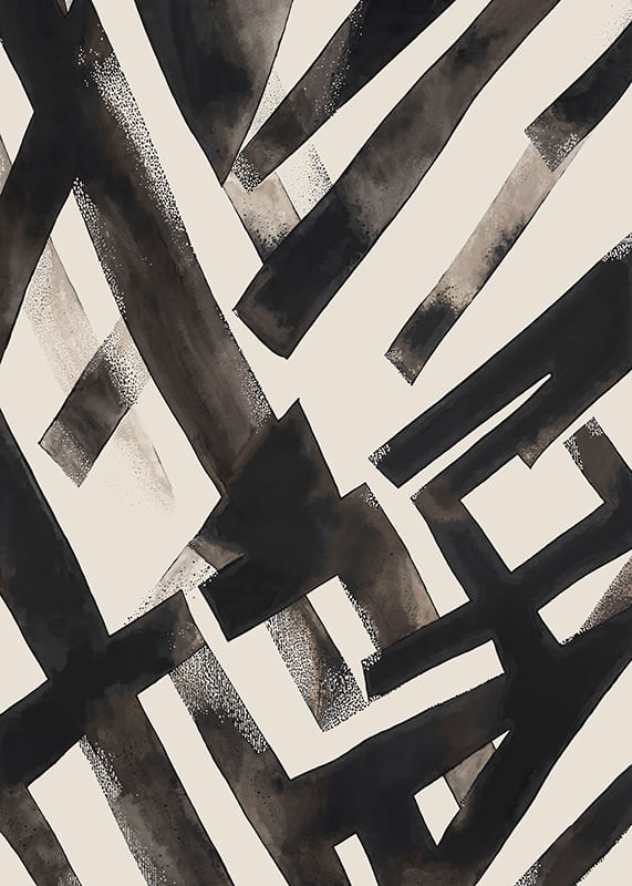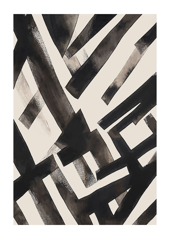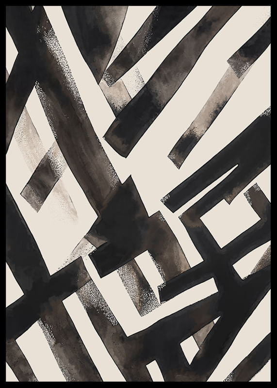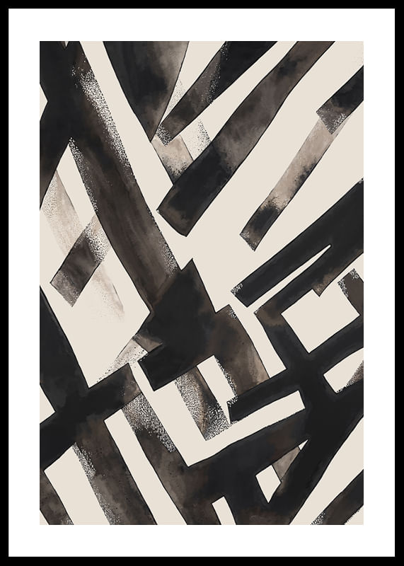 This poster catches the eye with its bold abstract dark lines that intersect in a dynamic pattern. The sharp contrasts between black and gray shades create a visual rhythm that fascinates and engages.