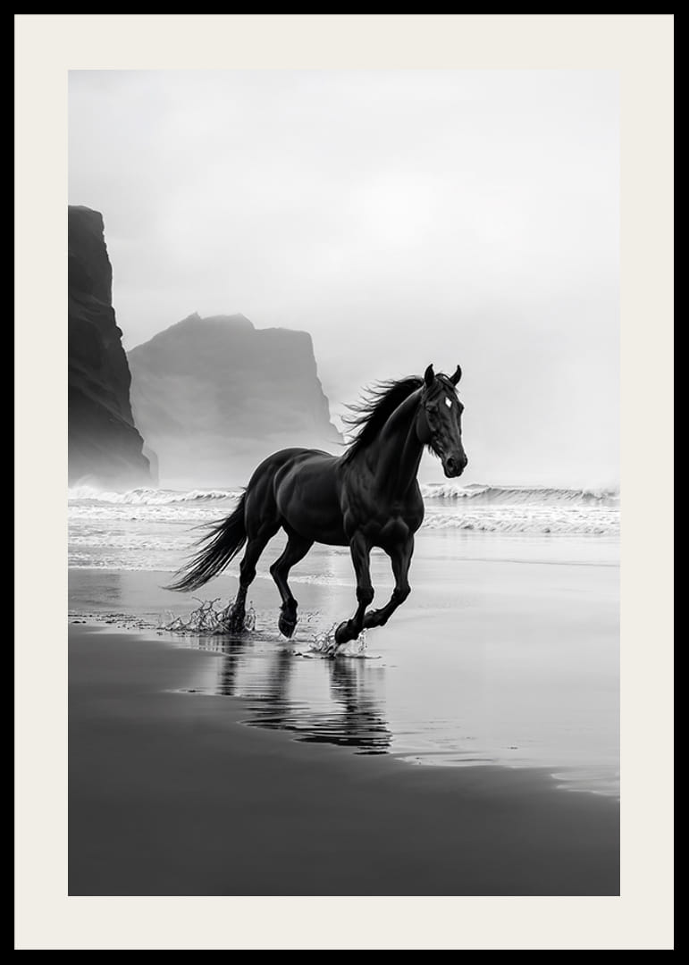 This poster captures the majestic beauty of a black horse galloping along a misty coastline. The horse's power and elegance contrast against the soft, blurred backdrop of the sea and rocks, creating a sense of mystery and freedom.