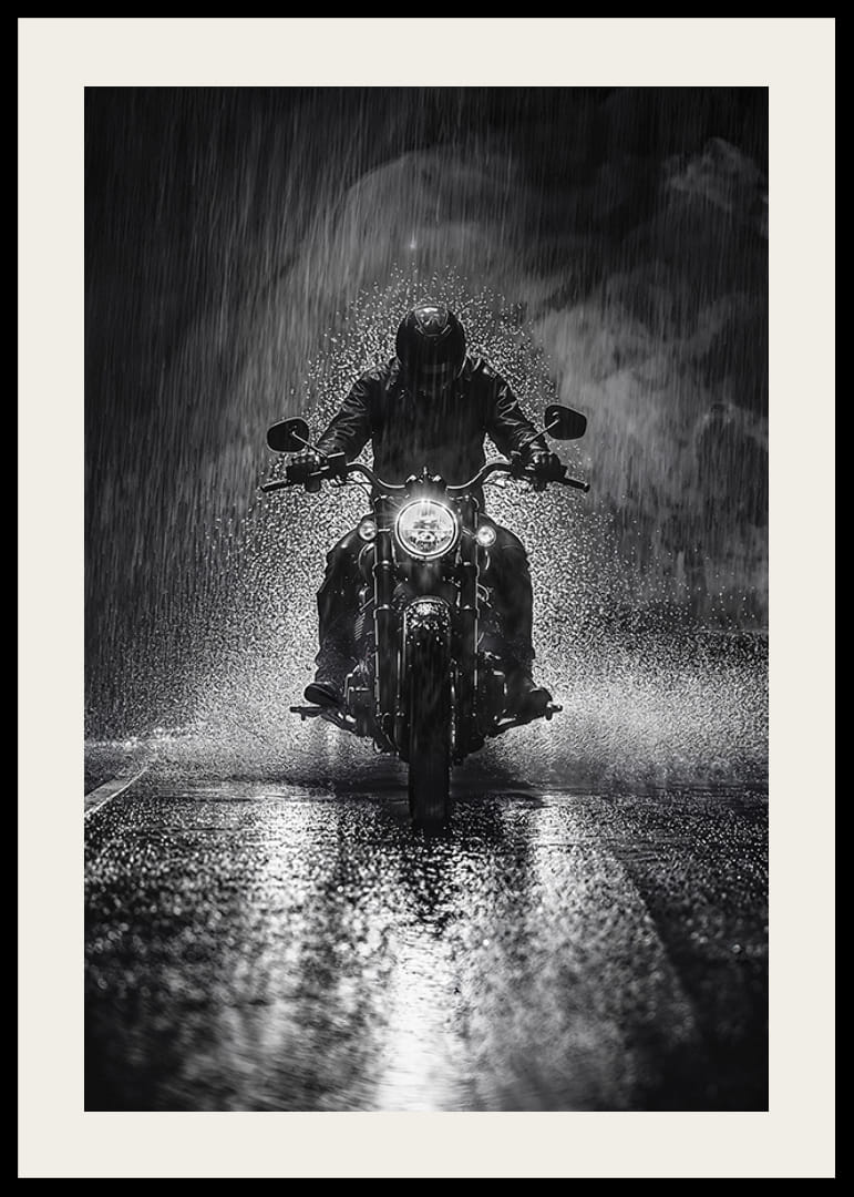 Start with an explosive feeling as the motorcyclist braves the rain in this dramatic poster. The black and silver play of light and shadow enhances the mysterious and courageous mood. It strides through the fog of the night, leaving a trail of freedom.