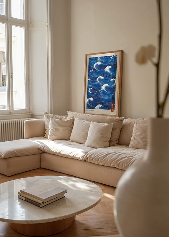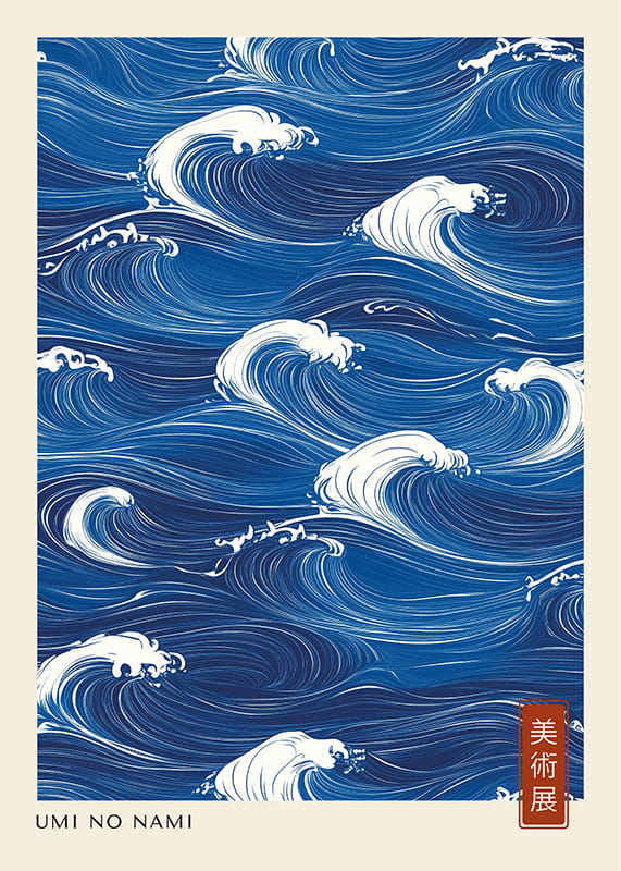 This poster highlights the dynamism of the ocean with its elegant and undulating waves that seem to move in an endless flow. The blue and white play of waves creates a feeling of harmony and tranquility.