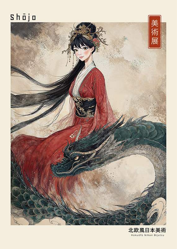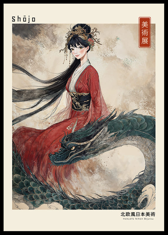 This poster depicts an enchanting scene where an elegant woman in traditional dress rides a majestic dragon. The colors, with deep red and green tones, create a harmonious atmosphere that combines magic and history.