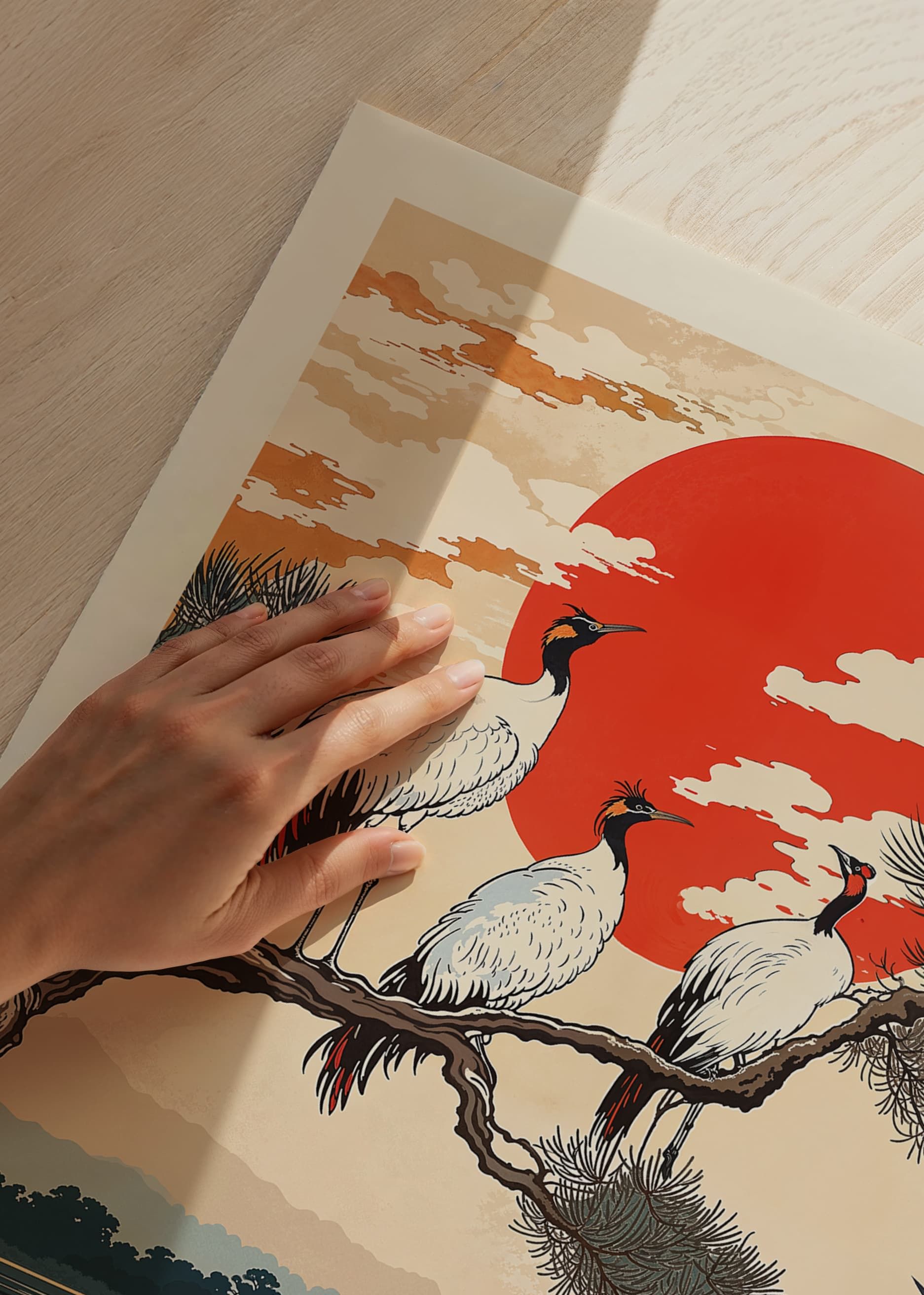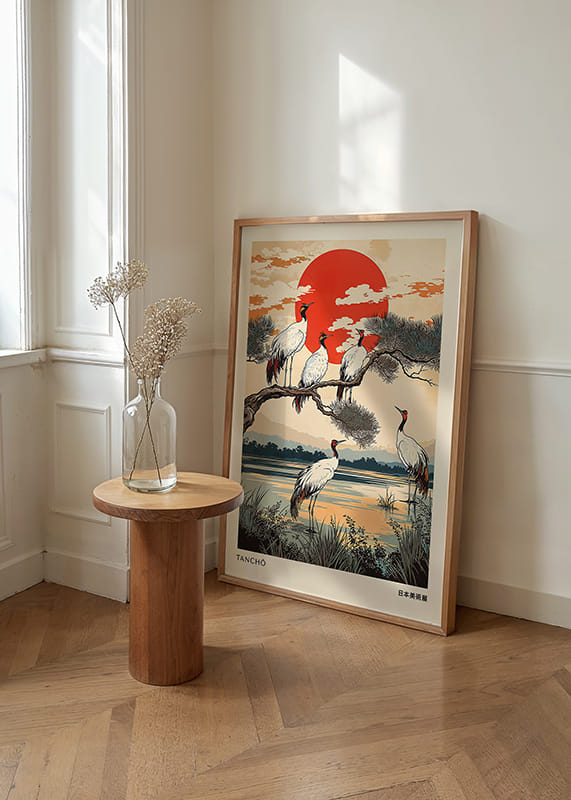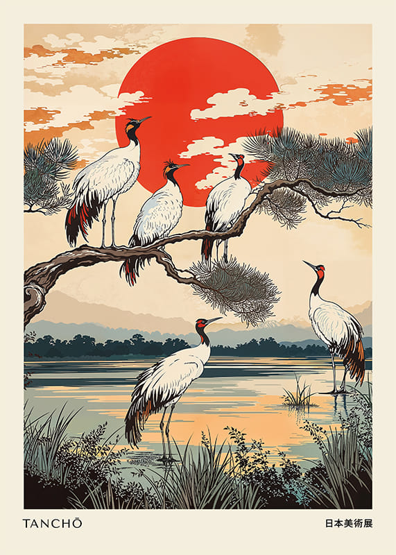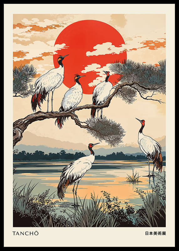 This poster captures a majestic scene where cranes rest peacefully under a blazing red sun. The colors, from intense red to soft earth tones, create a sense of tranquility and elegance. The trees and water enhance the beauty and harmonious balance of nature.