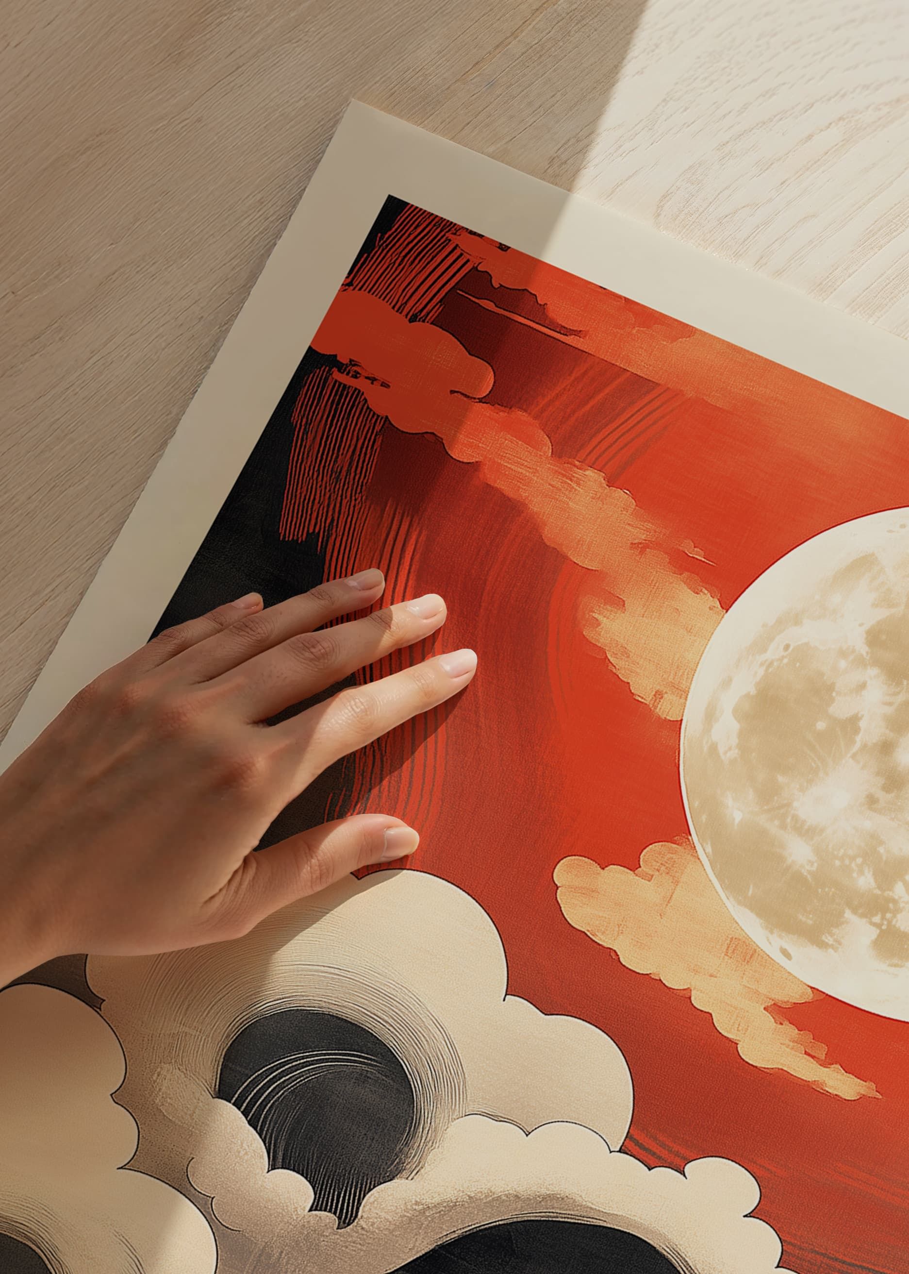 This poster captures a magnificent scene of a grand moonrise over dramatically billowing clouds against a fiery red sky. The moonlight delicately reflects off the billowing shapes, creating a sense of mystery and tranquility.