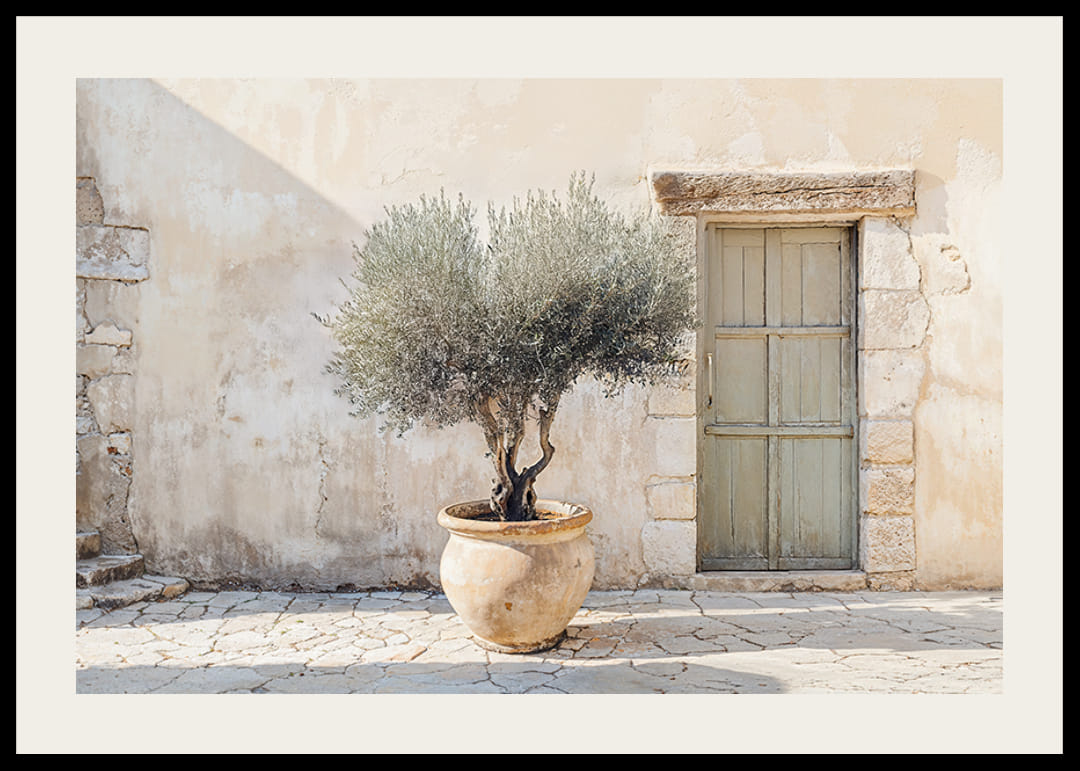 This poster captures the relaxing feel of the Mediterranean with a sturdy olive tree in a rustic pot against a stone wall. The soft light creates shadows that play across the stones, enhancing its timeless beauty.