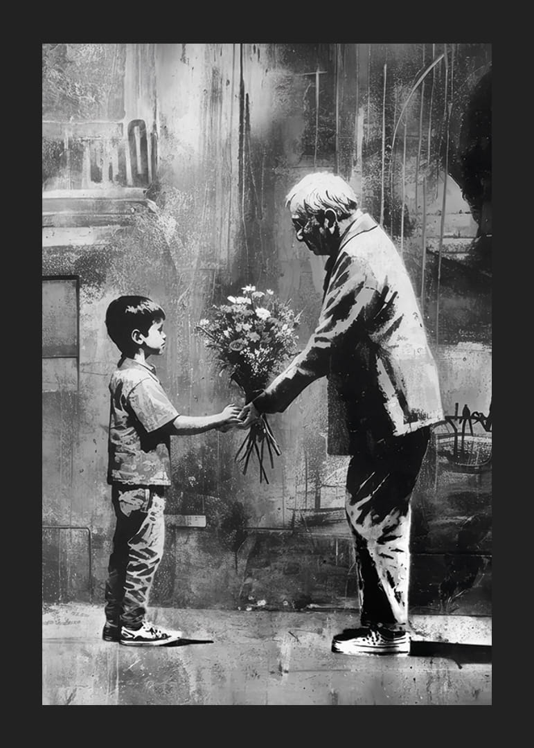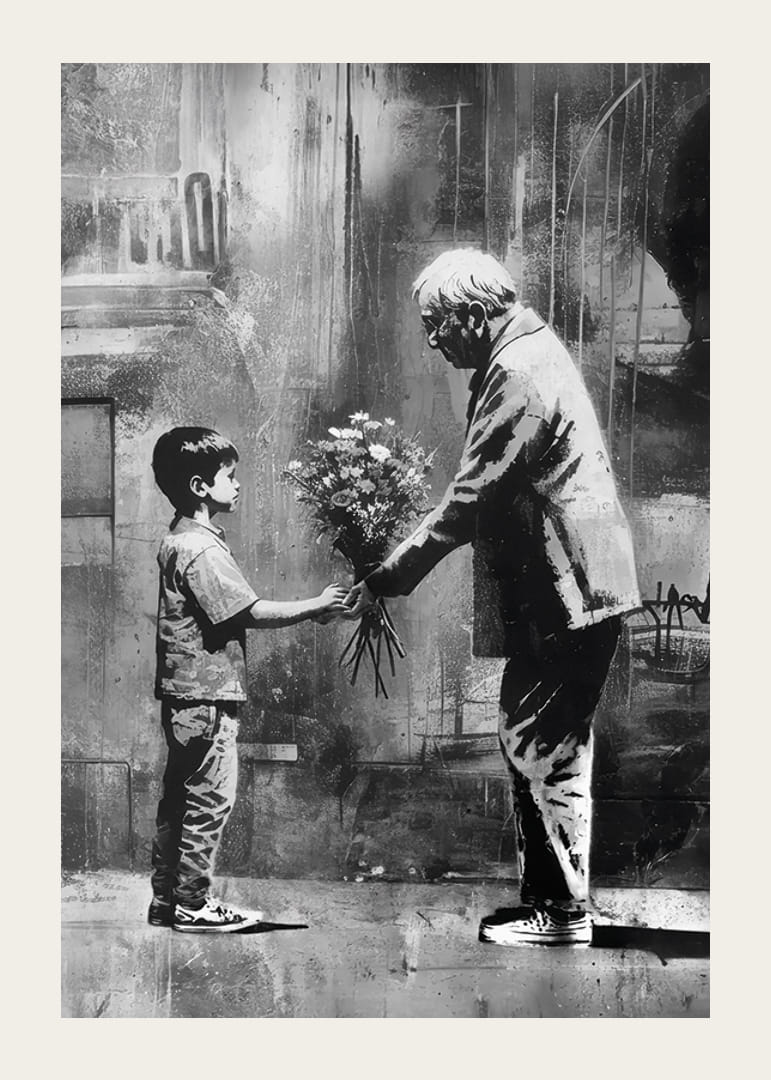 "Generations" captures a moment of kindness and love between two generations – a child and an elderly man – united in a silent act of respect and hope. In black and white, the contrast is clear: innocence meets experience, the new grows from the old. The artwork is a call for kindness and humanity beyond age and culture. A piece for any space where understanding is given room to grow. This poster is part of the Non-Violence Collection, where each purchase supports The Non-Violence Project’s important work in preventing violence.
