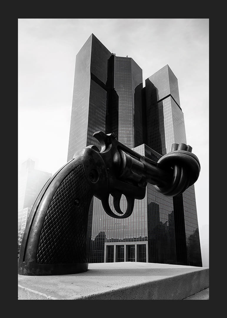 This black-and-white photograph depicts Carl Fredrik Reuterswärd’s iconic sculpture Non-Violence – the knotted gun – located outside the United Nations Headquarters in New York. The photo was taken by Swedish photographer Hans Hammarskjöld (1925–2012), one of Sweden’s most prominent 20th-century photographers, known for his sense of form, light, and graphic composition. The original photo was likely taken in the 1980s, around the sculpture’s installation in 1988. This restored version captures the contrast between the peaceful message of the symbol and the towering skyscrapers behind it – a timeless motif with a global message of non-violence.