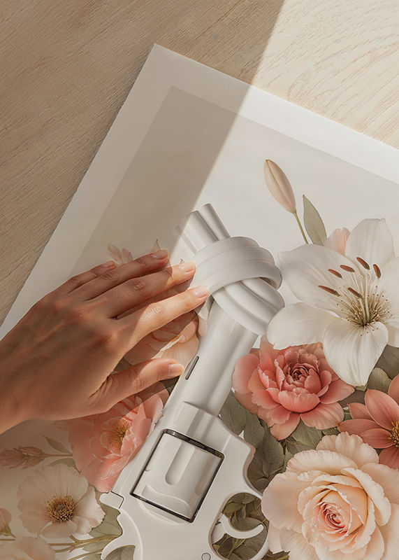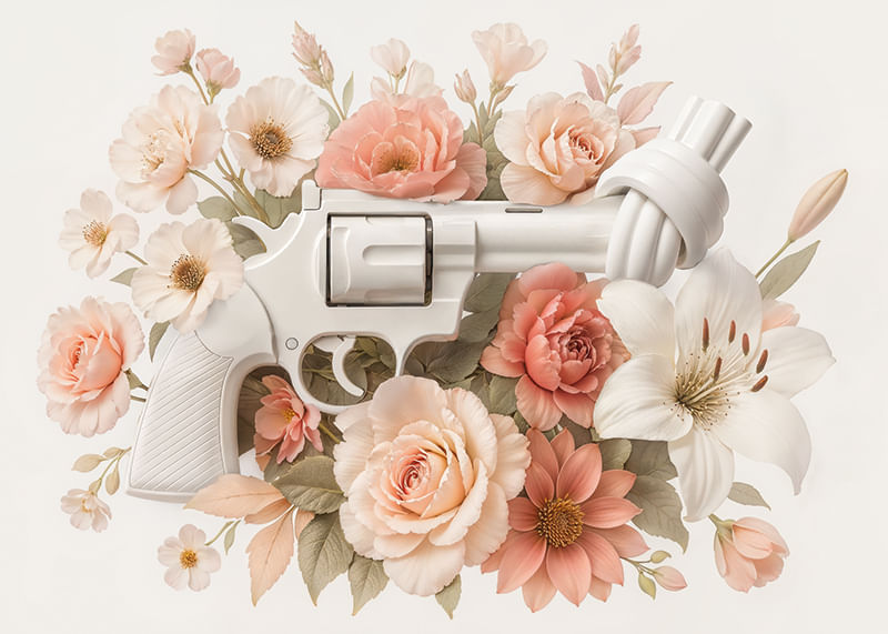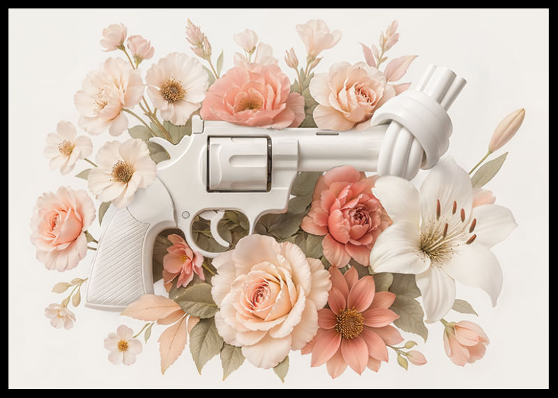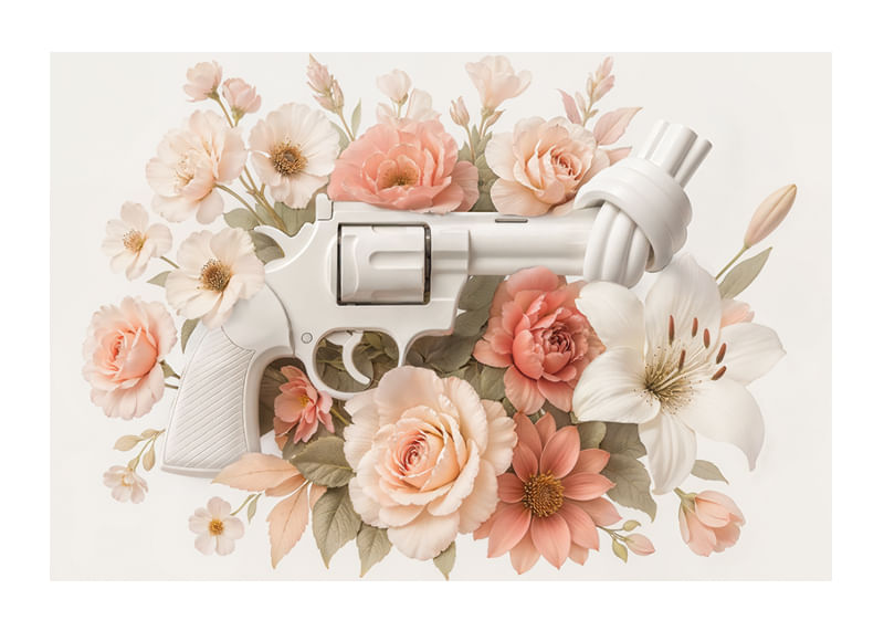 Non-Violence In Bloom White Edition is a tribute to the quiet power of peace. A reminder that softness can withstand hardness. That change begins in silence. The iconic knotted gun – symbol of non-violence – rests in a still life of pastel flowers and gentle hues. A visual balance between fragility and strength, between hope and action. Printed on premium paper with subtle color depth and fine detail. Perfect for bright interiors, homes, and creative spaces. This poster is part of the Non-Violence Collection, where each purchase supports The Non-Violence Project’s important work in preventing violence.