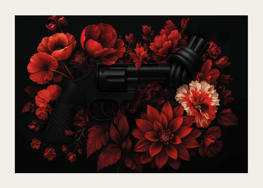 Where darkness meets resistance, something greater begins to bloom. The iconic knotted gun – a symbol of non-violence – lies nestled in a dramatic still life of red flowers against a midnight-black background. A visual contrast between strength and fragility. Non-Violence In Bloom is a tribute to the silent force of empathy and change. A work of art that evokes emotion, invites conversation – and makes a difference. This poster is part of the Non-Violence Collection, where each purchase supports The Non-Violence Project’s important work in preventing violence.