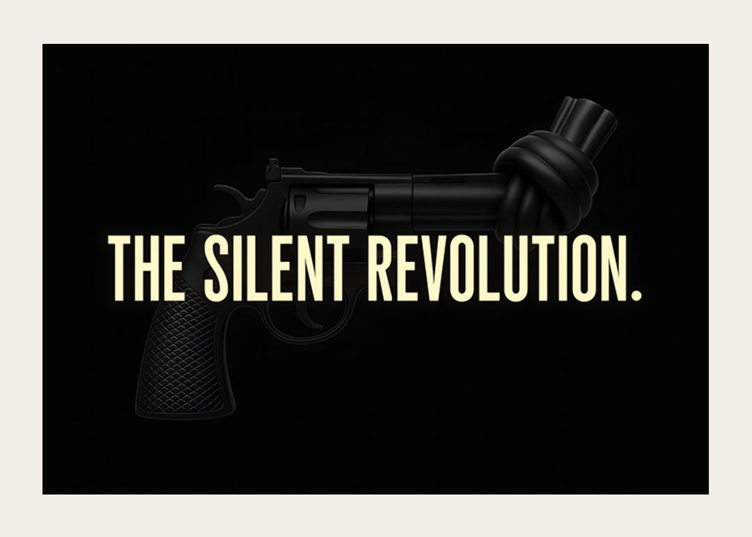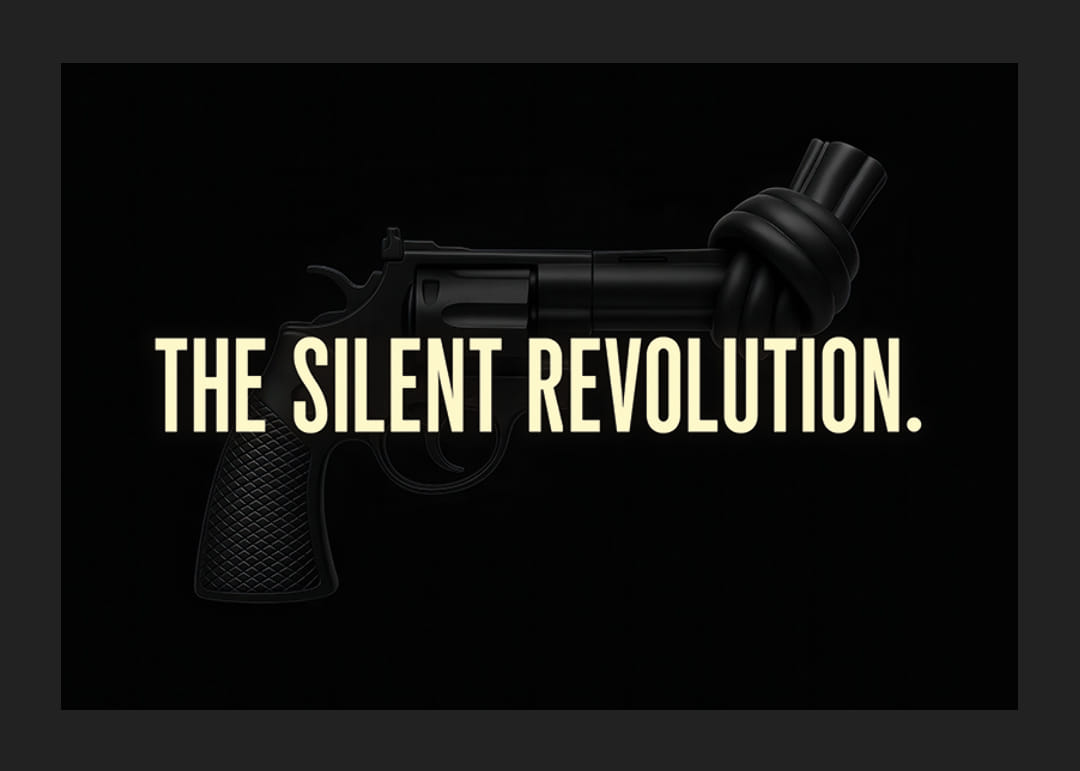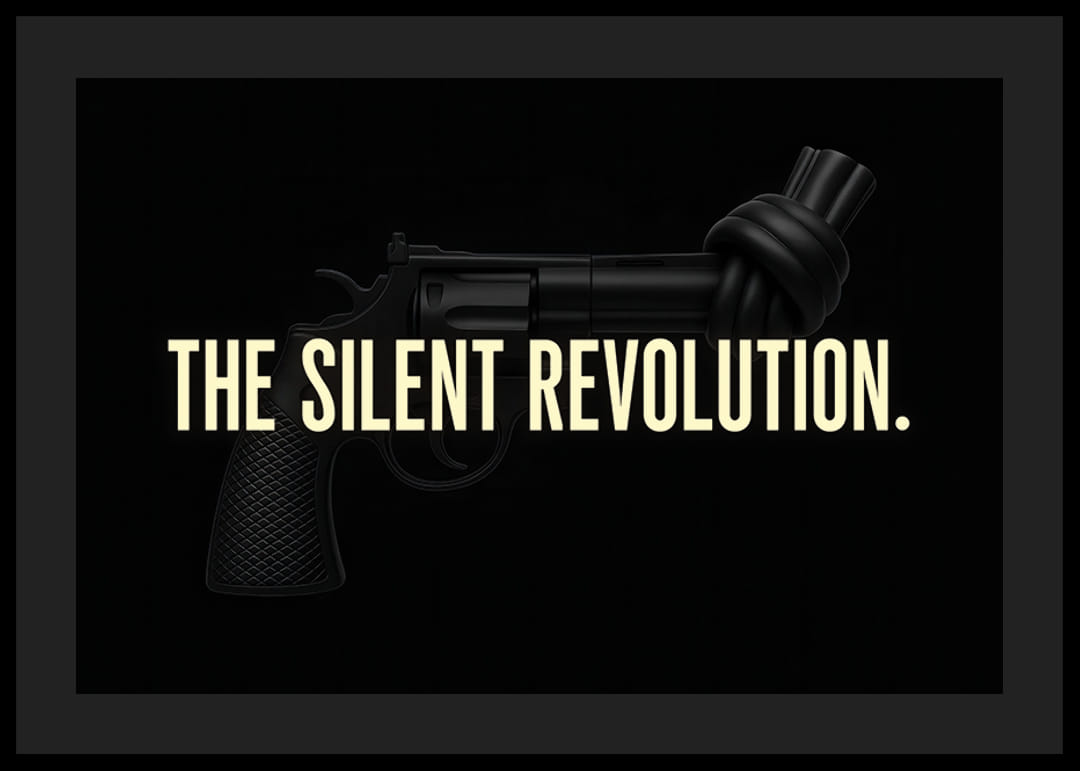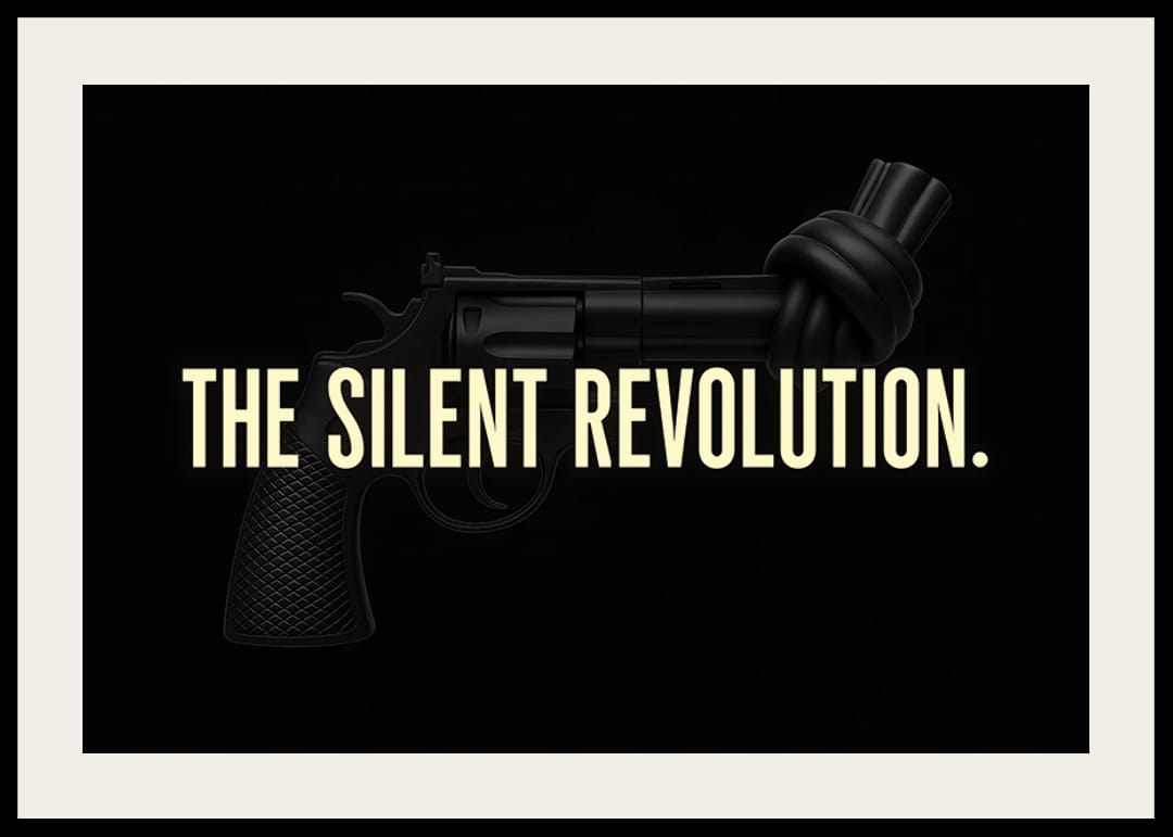 A graphic artwork in stripped-down perfection. The iconic knotted gun – symbol of non-violence – stands in a pitch-black space where the message speaks for itself: The Silent Revolution. A quiet yet relentless call for positive change without violence. Minimalism with maximum meaning. This poster is part of the Non-Violence Collection, where each purchase supports The Non-Violence Project’s important work in preventing violence.