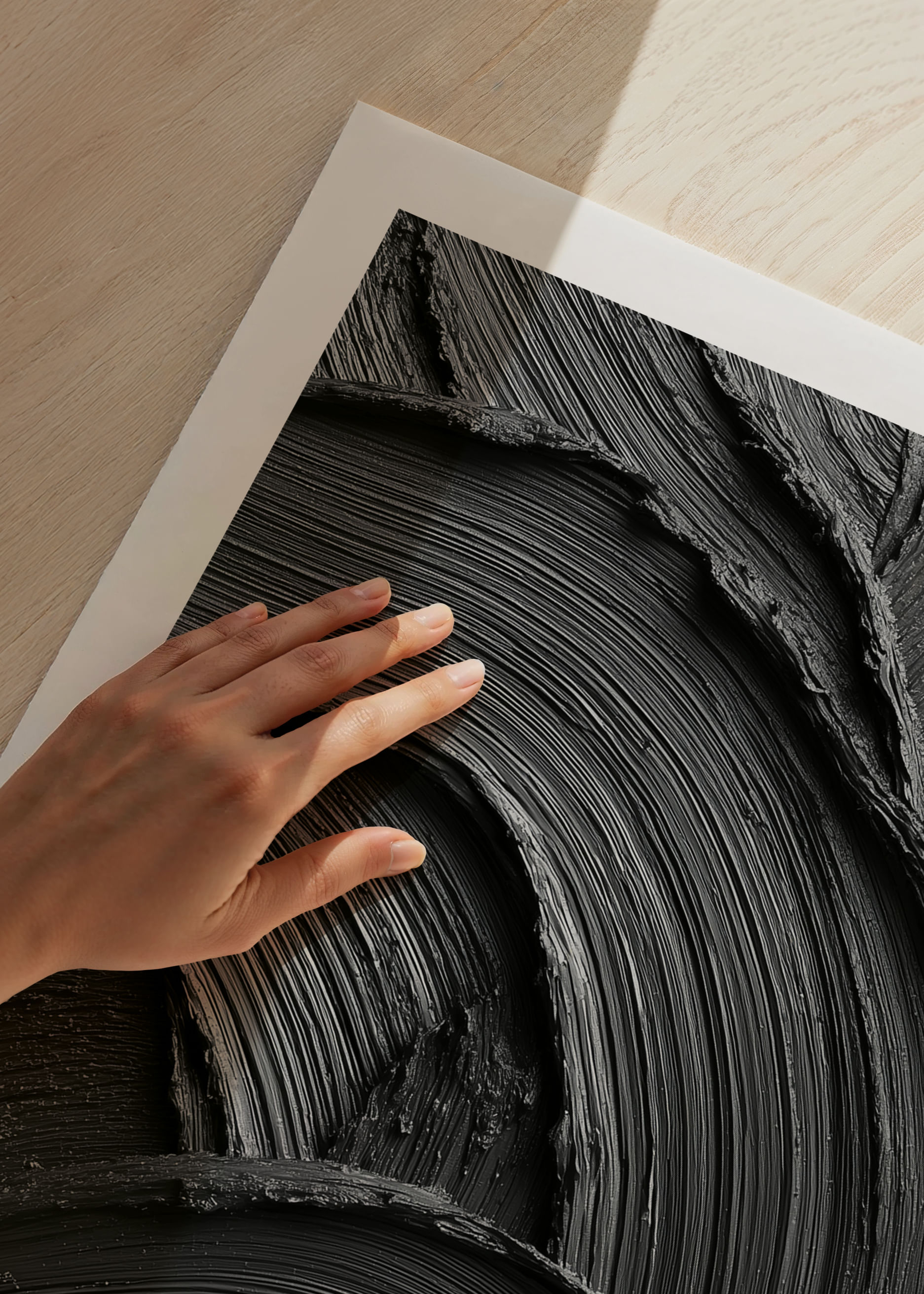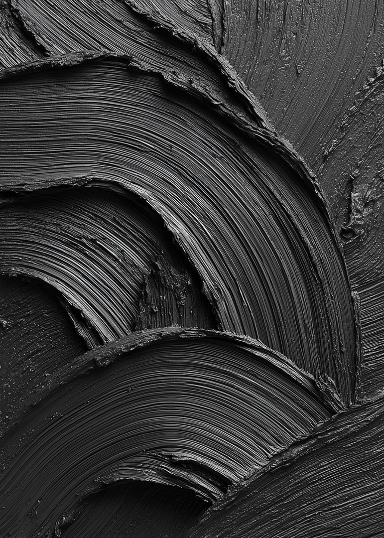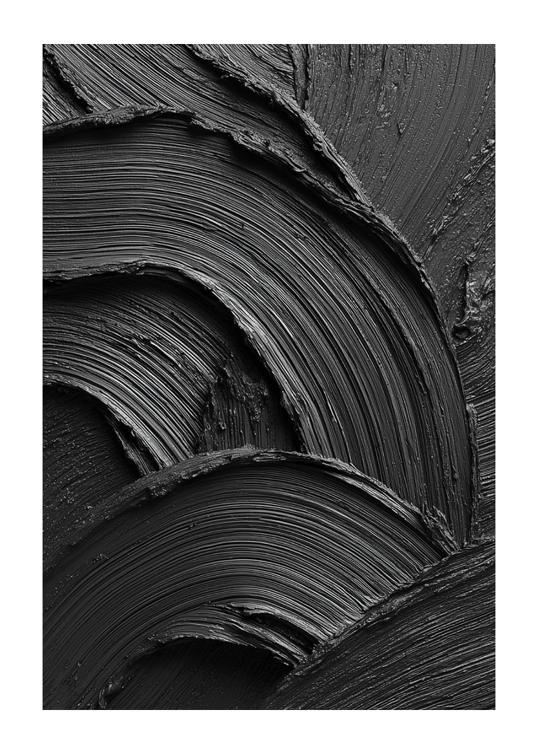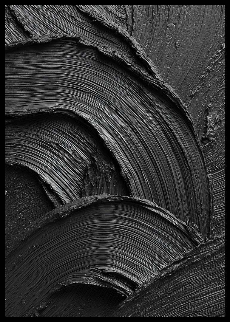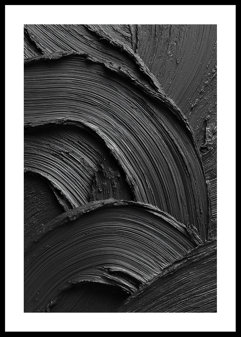 A powerful and minimalist poster in deep black, where the structure of the brushstrokes creates a dramatic play of light, shadows and movement. The tactile feel and the soft, wavy lines provide a unique combination of elegance and intensity. A work of art that catches the eye and adds a modern, stylish and sophisticated atmosphere to the room.