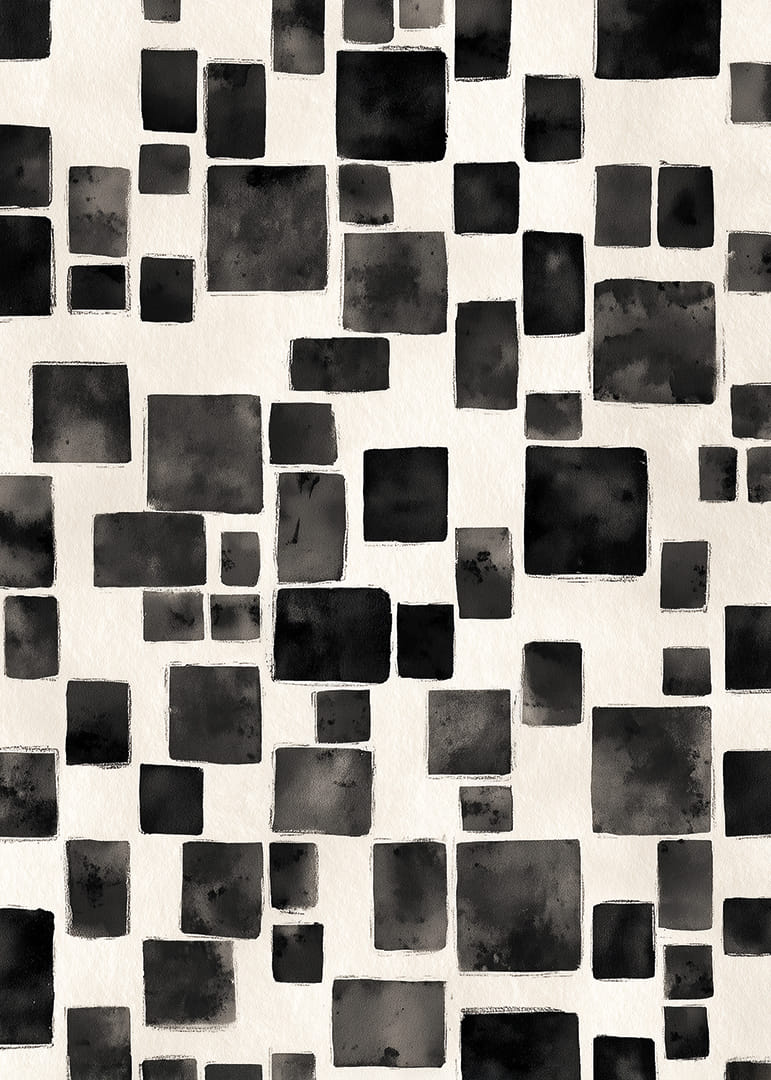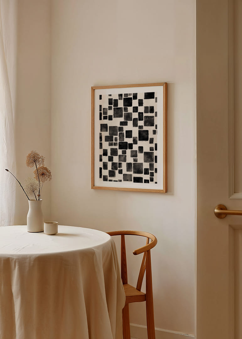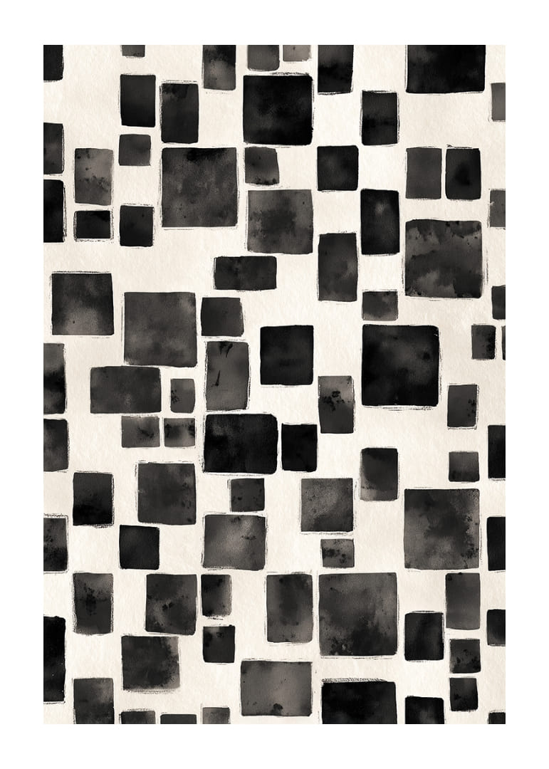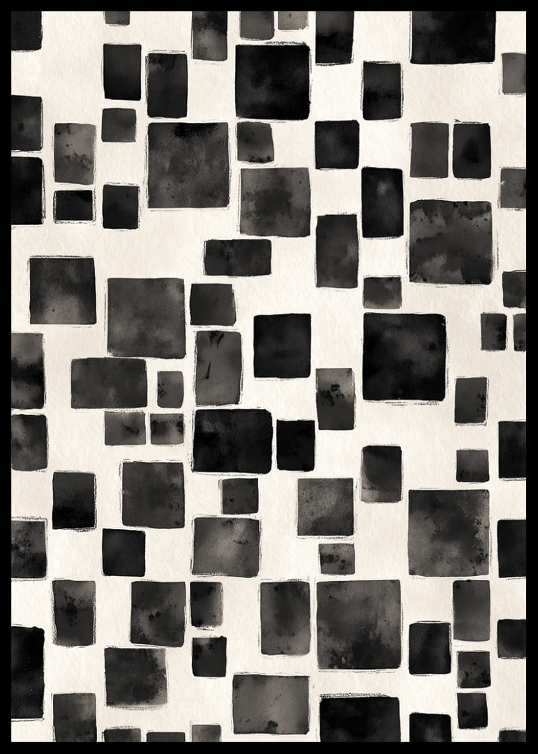 This poster conveys a sense of stylish elegance through its black and white rectangles in various sizes. The contrast between deep shadows and the light background creates a harmonious balance that draws the eye into a calm yet dynamic world. With its minimalist design, the poster adds a modern sophistication to any room it adorns. Perfect for transforming a living room or office.